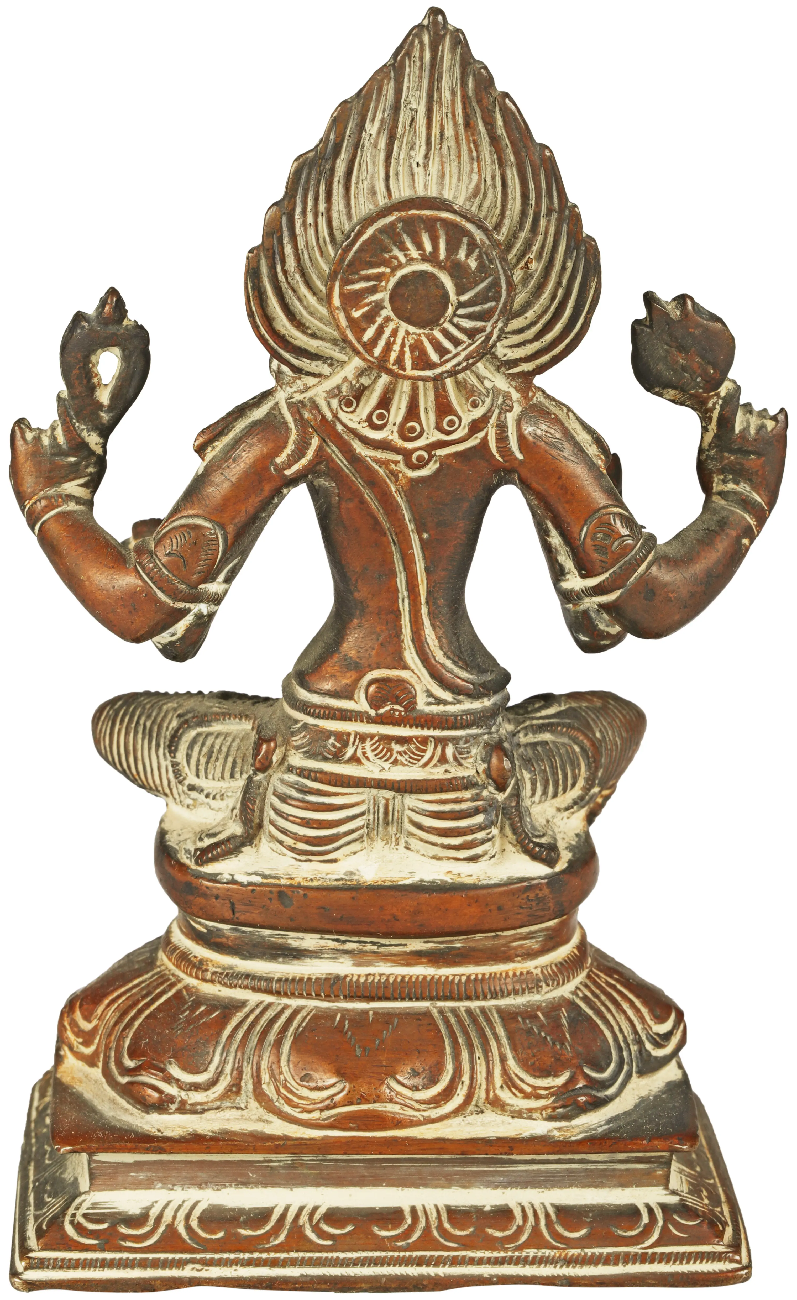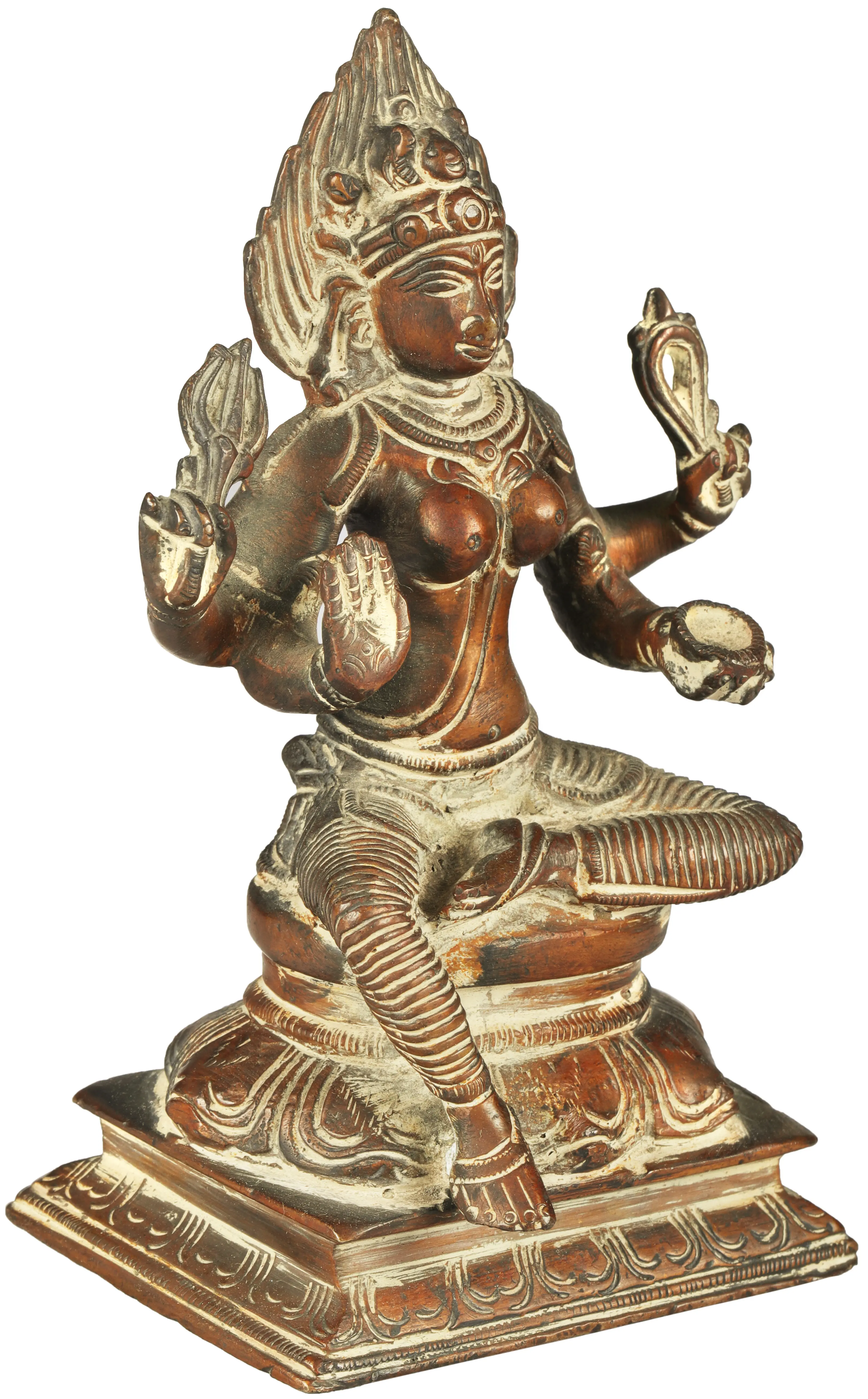 Mariamman- popularly known as the Durga of Southern India, is a powerful deity revered across shrines in the Dakshina Bharata, as an amalgamation of the potencies of local goddesses and Kali, Parvati, Chandi, Renuka. In this handmade brass statue, Devi Mariamman is seated on an upturned lotus seat, in a four-armed roopa, holding a trident, noose, skull cup, and the gesture of fearlessness as signs of her all-pervasive might. Her form exudes the perfection of feminine youthfulness as a signifier of the auspiciousness and fecundity she bestows, and her hair is delineated as a flaming aureole, as a representation of the fire of consciousness she embodies.