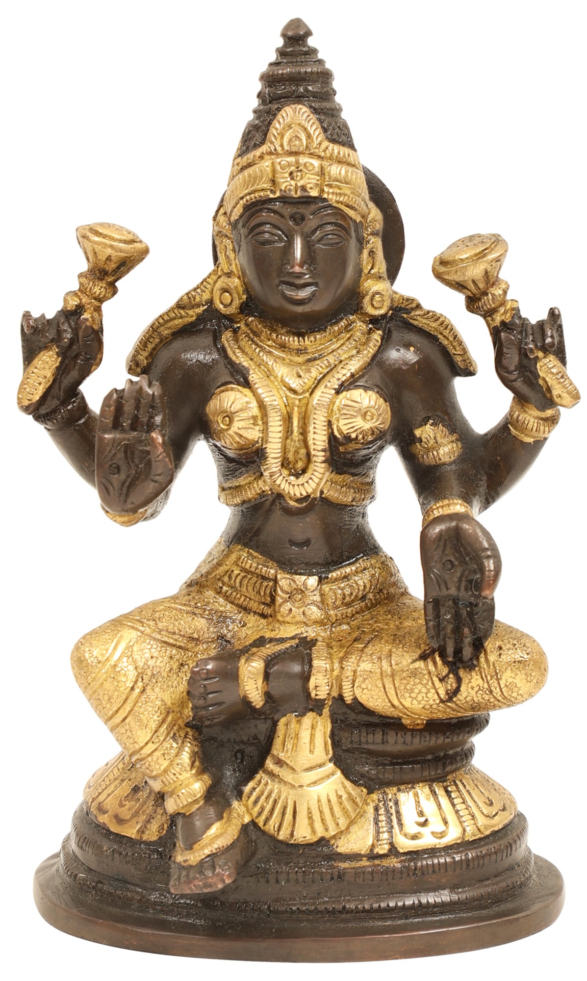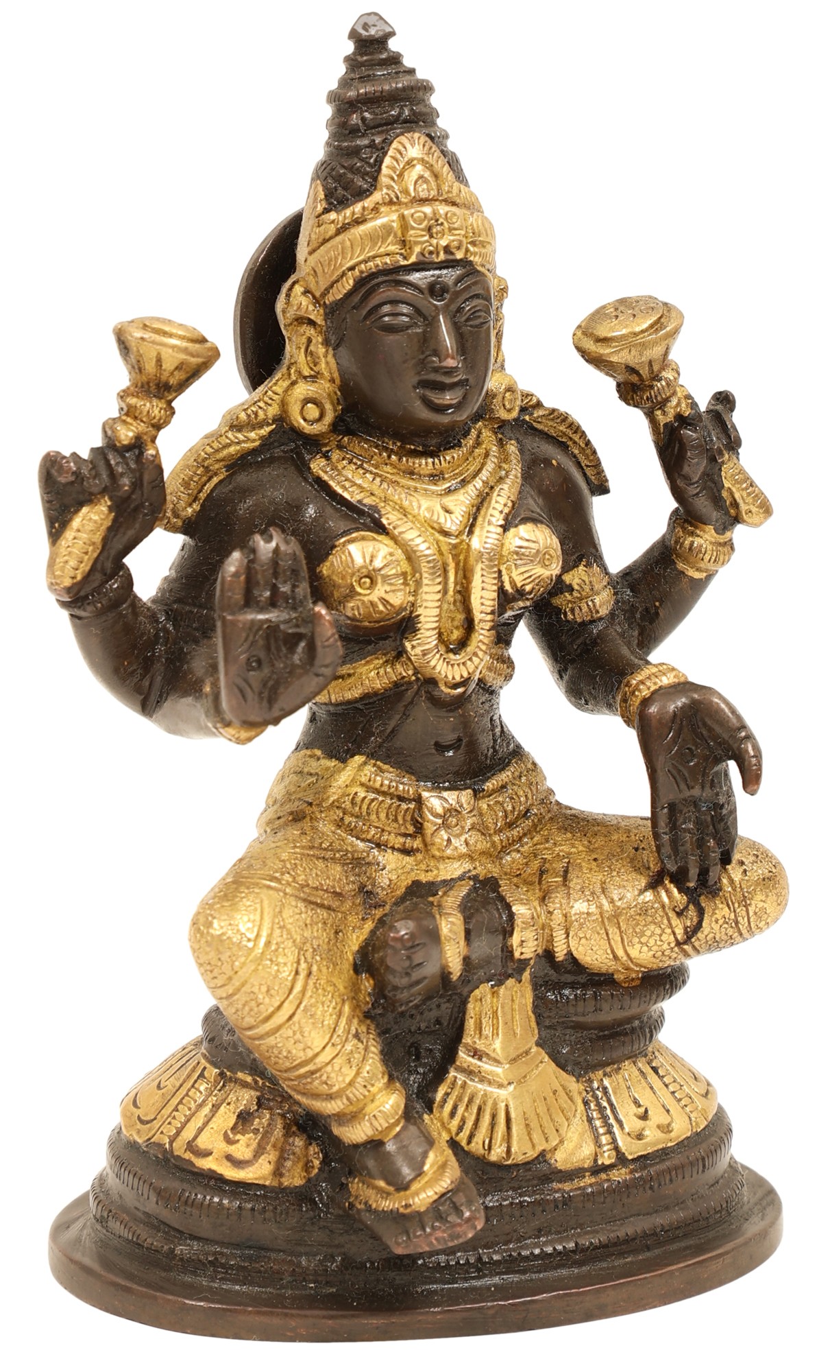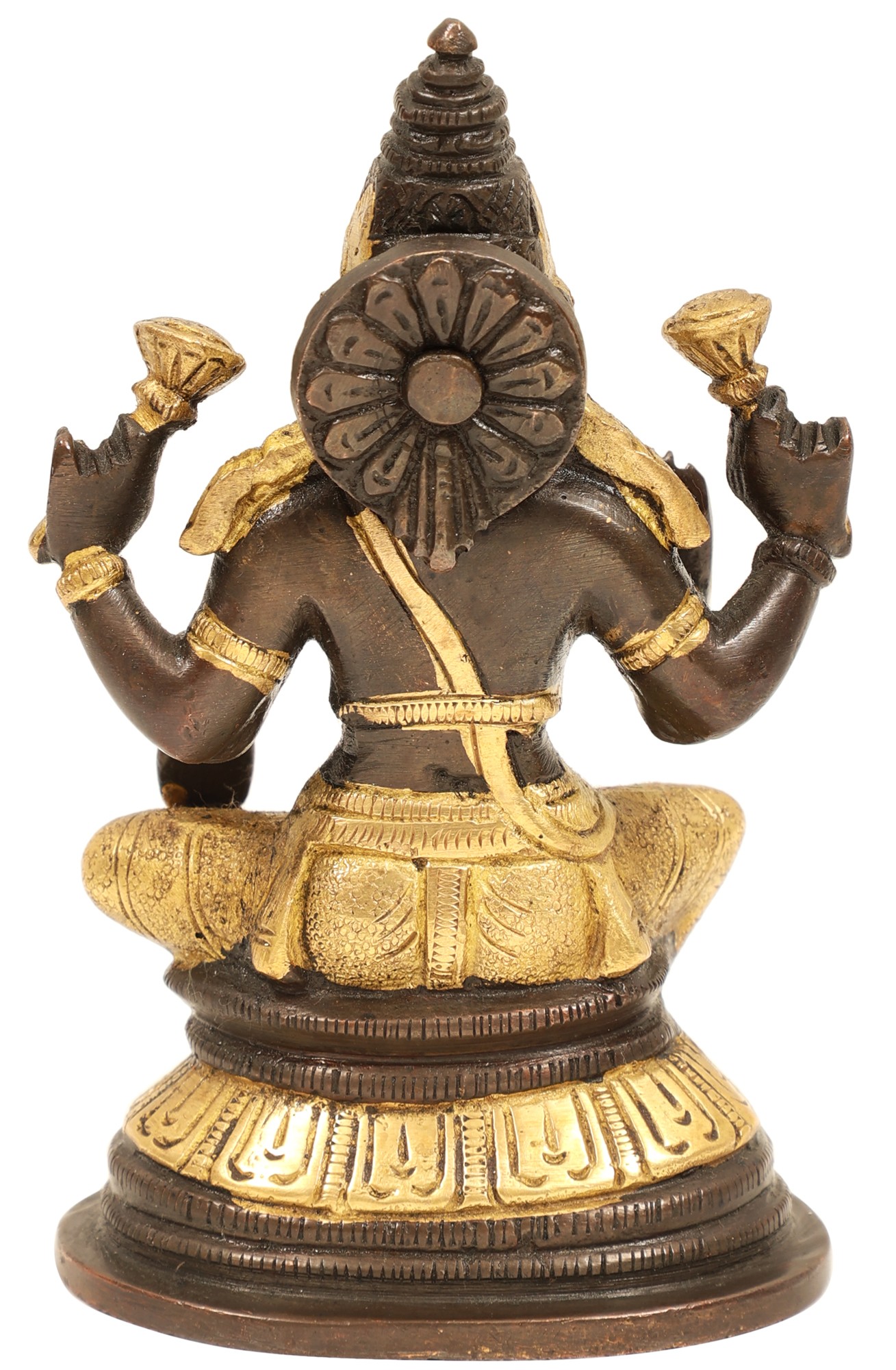 Goddess Lakshmi from her earliest mentions in ancient Hindu scriptures rules the realms of fertility, abundance, and auspiciousness. To emphasize Devi Lakshmi’s role as the bestower of the boons of progeny, fecundity of fields, and pleasantness in life, her icons illustrate the goddess as a youthful woman, who in Hindu tradition is the ideal symbol of productiveness and propitiousness. In this small brass goddess Lakshmi statue, Devi is a female brimming with youth, seated on a lotus throne or Padmasana in the posture of royal ease (Lalitasana). She is in her popular four-armed form, carrying two lotuses and making the gesture of fearlessness (Abhaya mudra) and disseminating boons (Varada mudra) with her right and left primary hands, respectively. A Vaishnava Kiritamukuta crown, dehri (circular earrings), Haara and Ratnamalika (necklaces), bracelets, and armlets embellish the divine limbs of Devi Lakshmi in this brass Lakshmi icon. Maa Lakshmi’s motherly expressions are imbued in this brass work with simple incised lines, which create a humble and powerful idol of the great mother goddess.