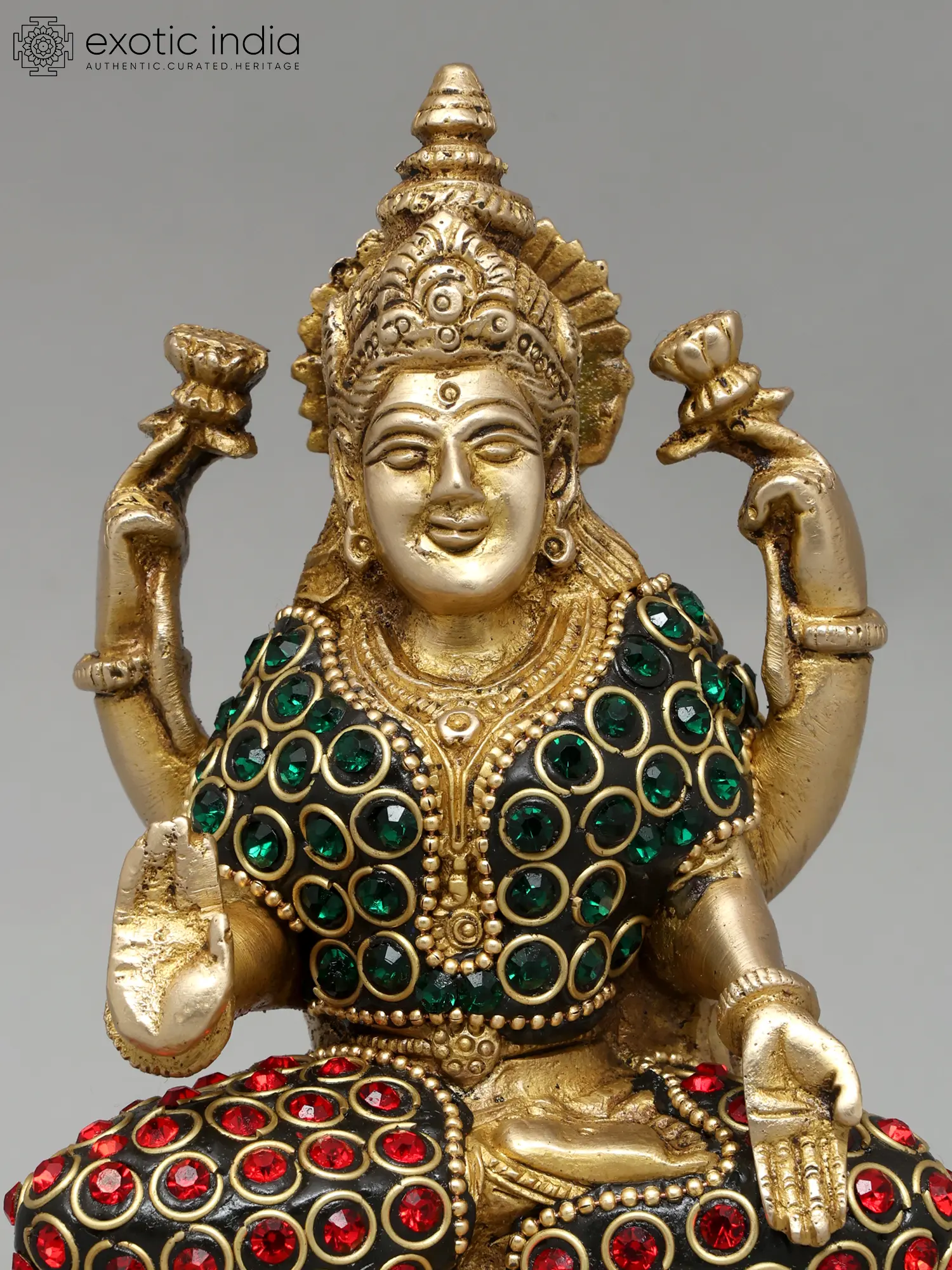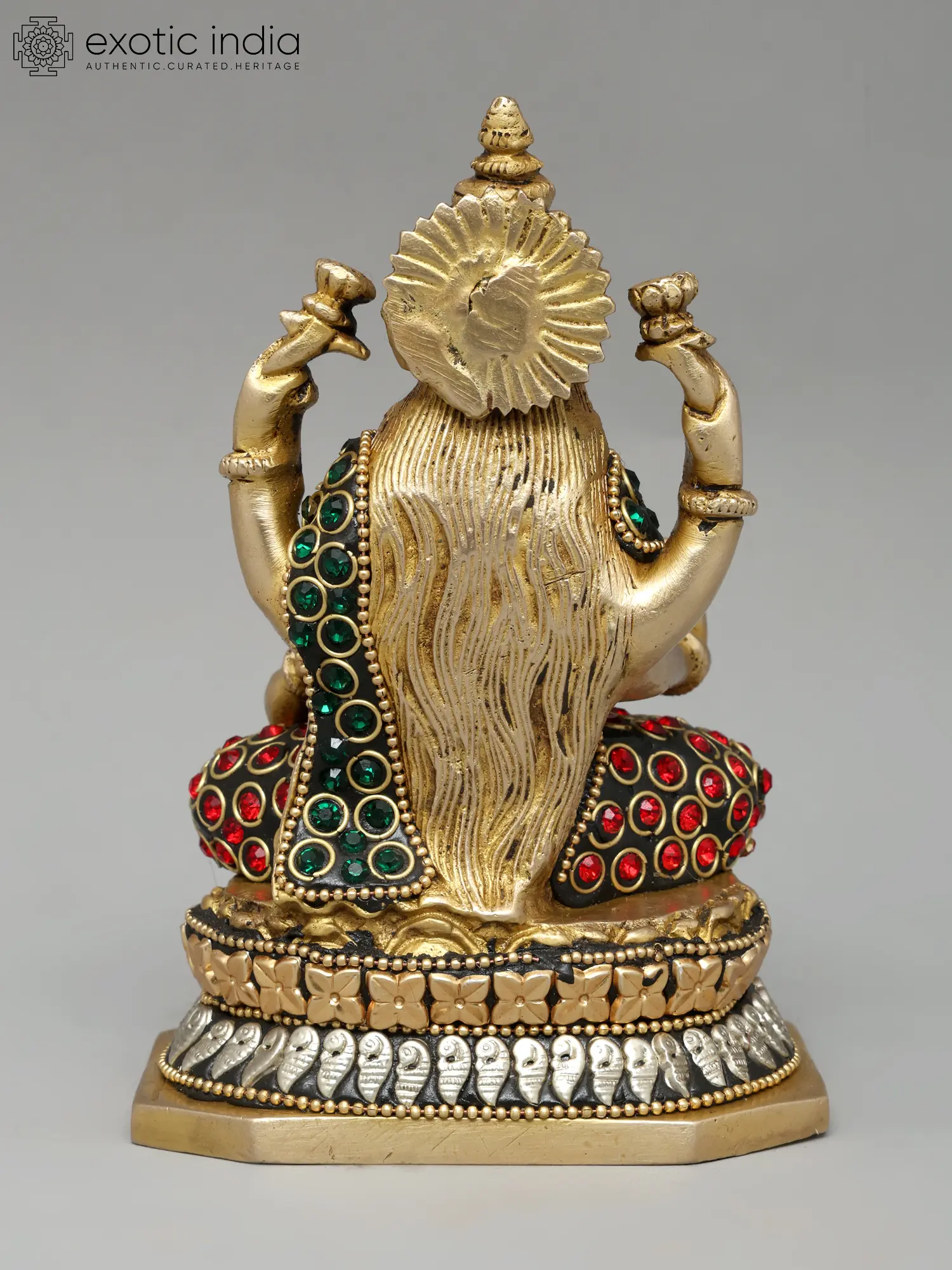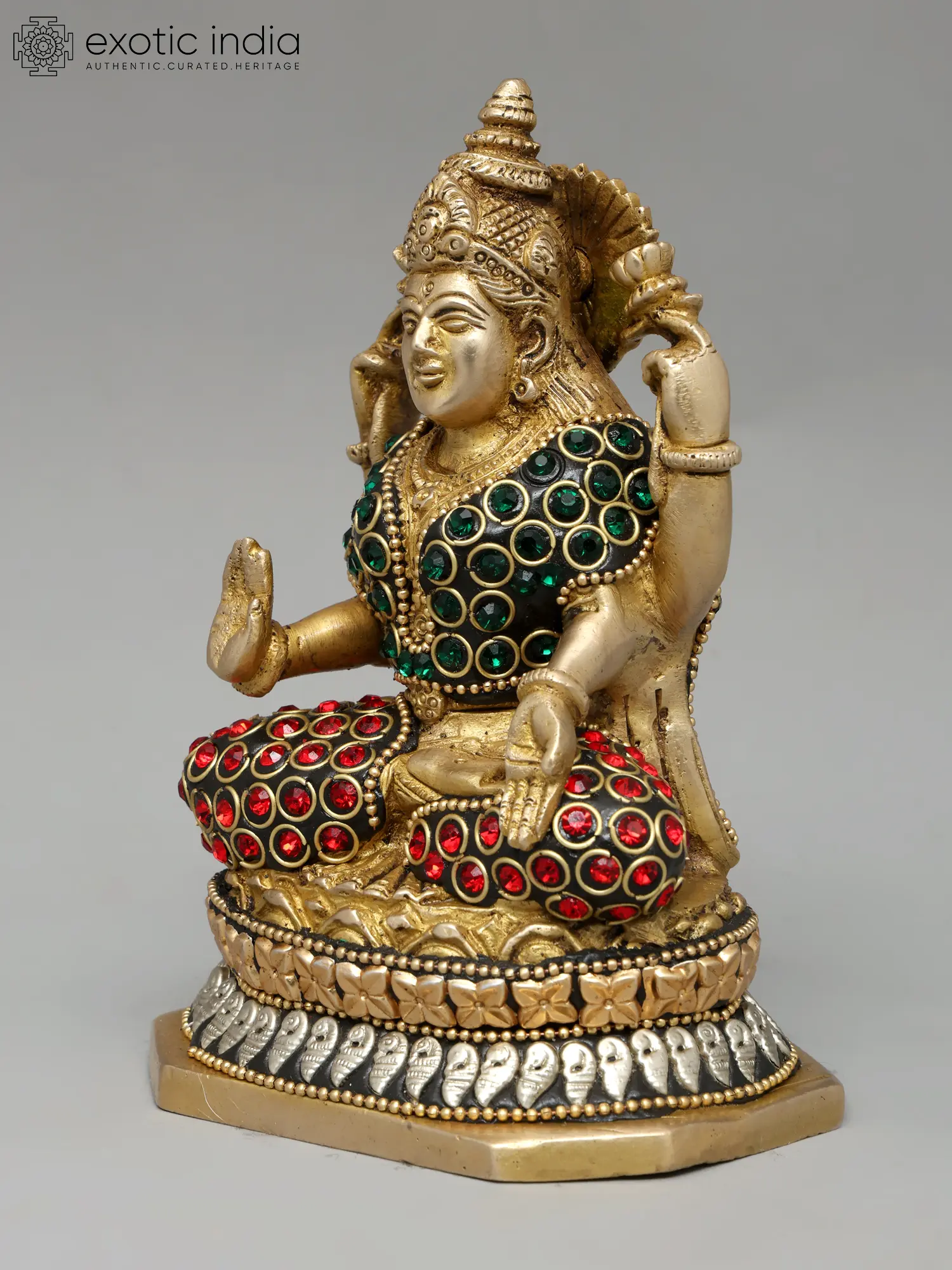Lakshmi, also known as “Shri”, is the epitome of wealth, prosperity, and abundance, and associated with “Maya”. With radiant beauty, She is adorned in resplendent attire and jewels. Lakshmi sits on a lotus, signifying purity and transcendence above material desires. Her four arms represent the four goals of life - Dharma, Artha, Kama, and Moksha. In two hands, Lakshmi holds Lotus blossoms, symbolizing spiritual growth and enlightenment. The other two hands are in “Varada Mudra”, granting boons and “Abhaya Mudra”, offering blessings and protection. The brass material adds refinement and longevity to the statue, while the intricate inlay work enhances its artistic appeal. Bringing home this masterpiece invokes Goddess Lakshmi’s blessings and fosters prosperity.