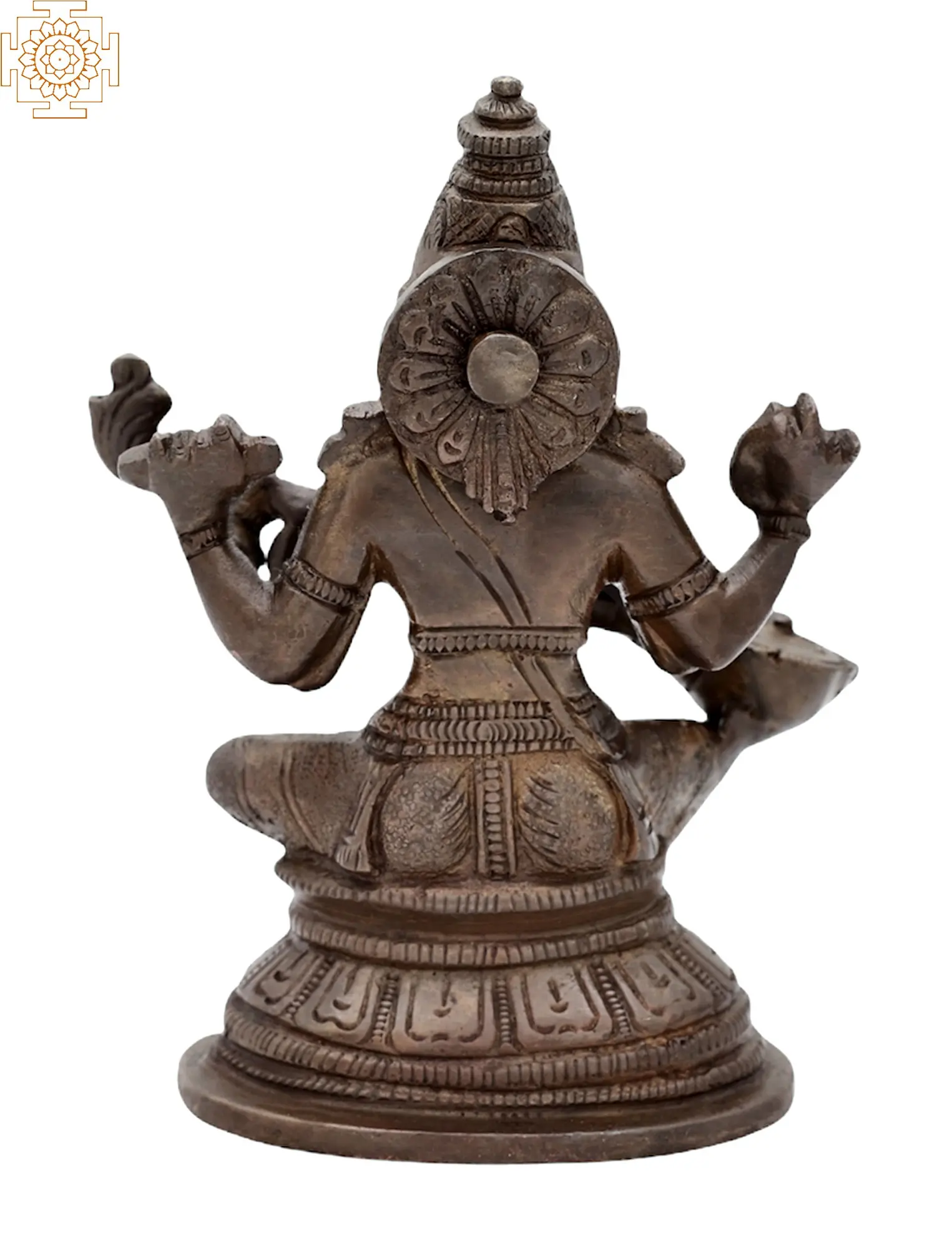 Sculpted with aesthetic beauty, this small brass statue of goddess Saraswati represents the mother goddess seated on an inverted lotus-throne, in the Lalitasana or posture or royal ease, adorned with exquisite ornaments and a towering Kiritamukuta crown. Devi carries a Veda and a rosary in her secondary hands, and in her primary hands, she holds a Veena, creating inspiring musical notes that fill the universe with heavenliness.