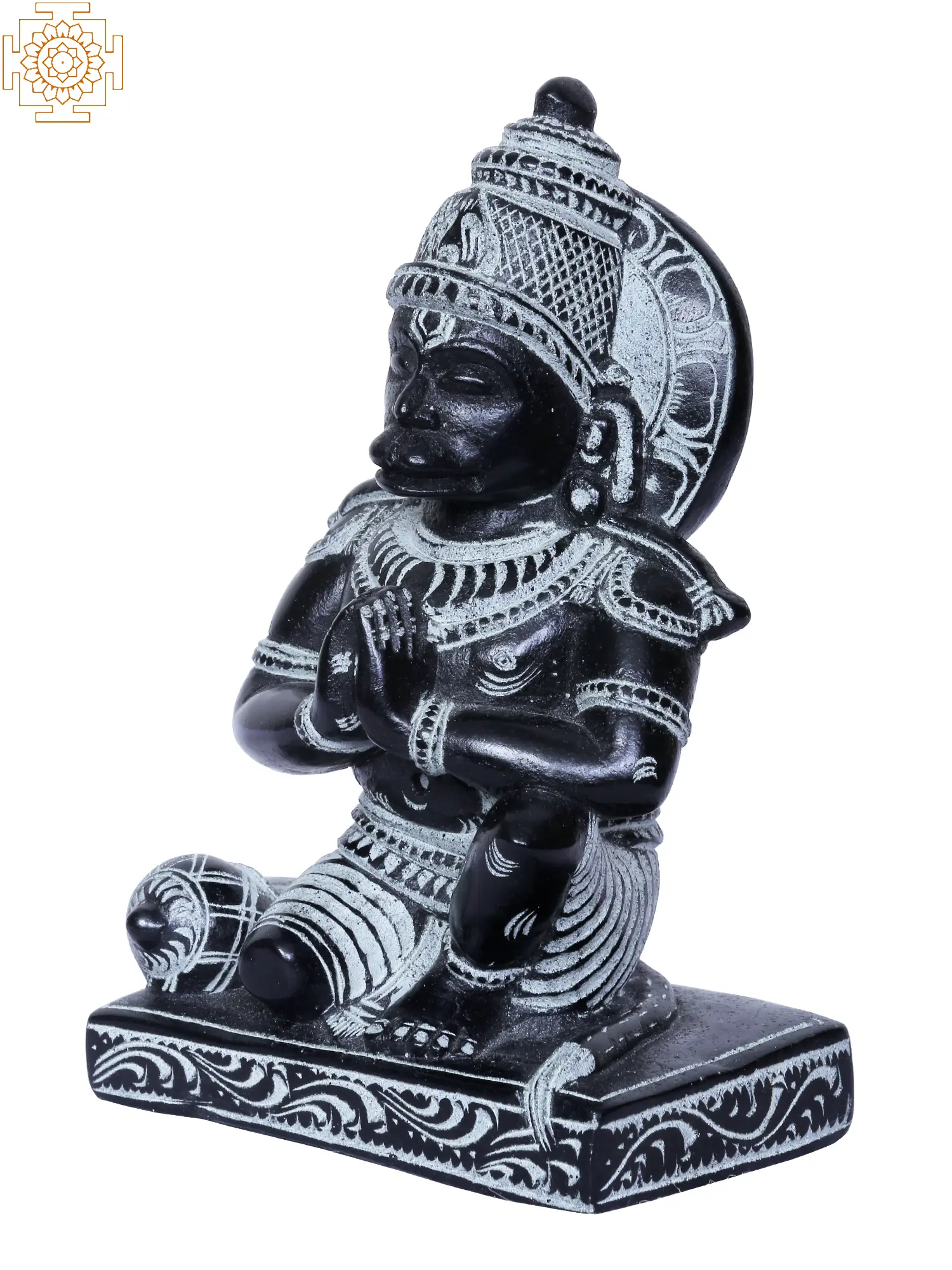 This statue hails from the renowned stone carving traditions of Mahabalipuram in South India. For centuries, artisans in this region have honed their skills, transforming raw stone into breathtaking works of art that resonate with spiritual significance and aesthetic beauty. The dark, polished stone is meticulously carved, highlighting every intricate detail of Hanuman Ji's divine form. The contrasting white accents bring the ornamentation to life, emphasizing his regal attire and the serene expression on his face. The art of stone carving in Mahabalipuram is deeply intertwined with the region's rich history and cultural heritage, drawing inspiration from ancient temples and mythology.