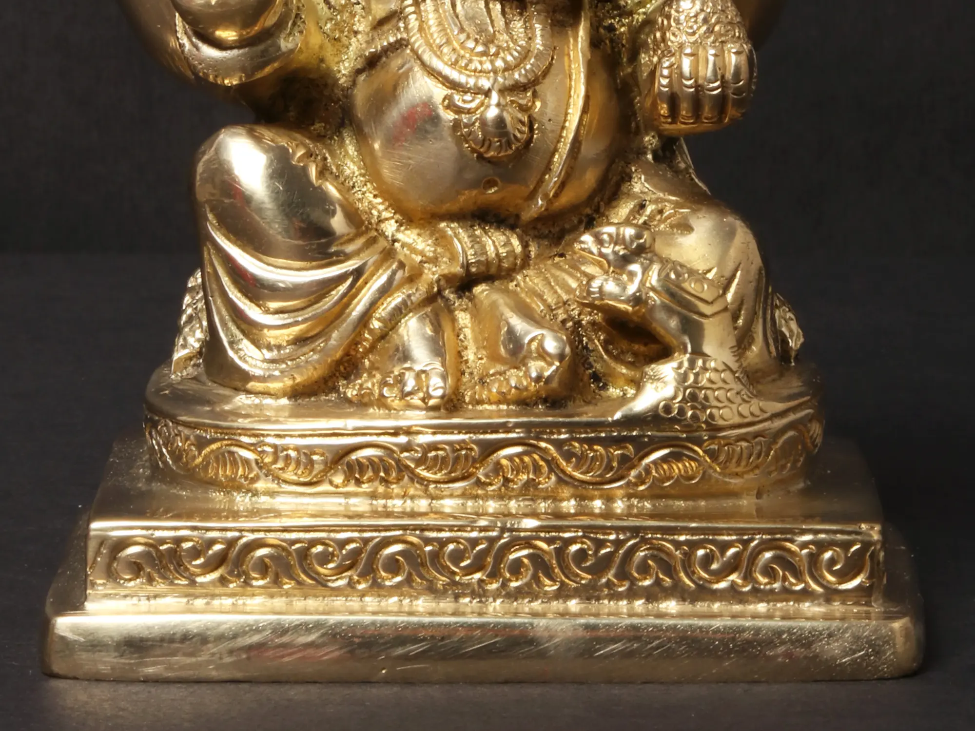 Lord Gajanan, also known as “Ganesha” or “Vinayaka”, exudes serenity as he sits gracefully, his divine form radiating tranquility. In his four hands, he holds symbols of his power and wisdom, signifying his ability to guide and protect devotees. Savouring Modak, his favorite sweet treat, Ganesha represents the joy of indulging in life's pleasures while remaining spiritually connected. His raised right hand extends in a gesture of blessing, offering solace and removing obstacles from the path of his worshippers. Crafted in brass with Love, this artwork invites worshippers to seek blessings, wisdom, and guidance.