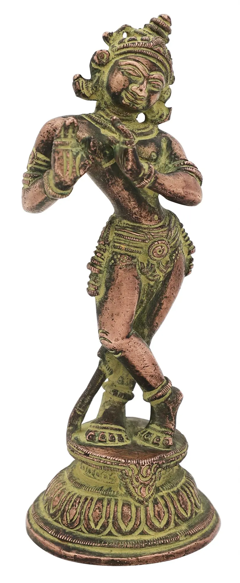 This brass sculpture stands as a testament to the skillful hands of artisans who have poured their devotion into each nuanced detail. Lord Krishna's form embodies the quintessence of artistic mastery, with his body flowing in the lyrical tribhanga stance - a pose of three bends that mirrors the rhythm of the universe itself. His feet are elegantly crossed, symbolising a sacred union of opposites - the material and the spiritual, the finite and the infinite. This gesture reflects the profound philosophy of Krishna, a reminder that life's intricate dance is but a reflection of the cosmic interplay of energies.
