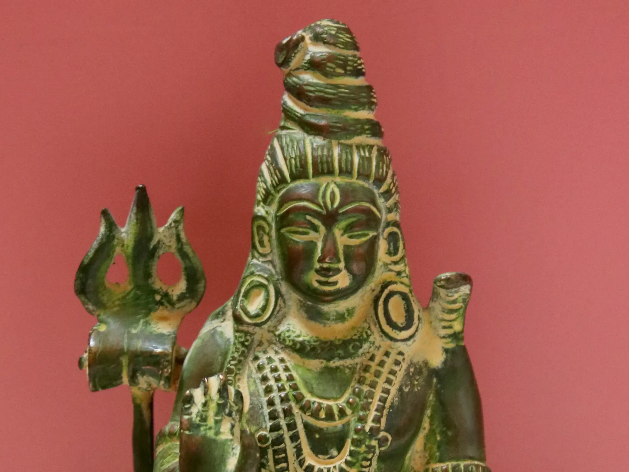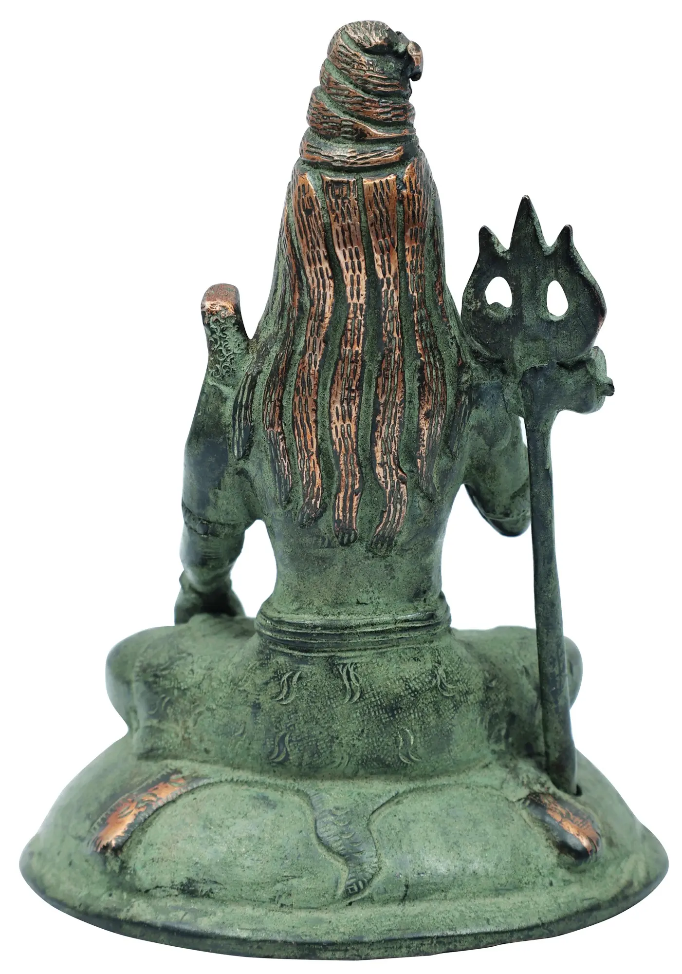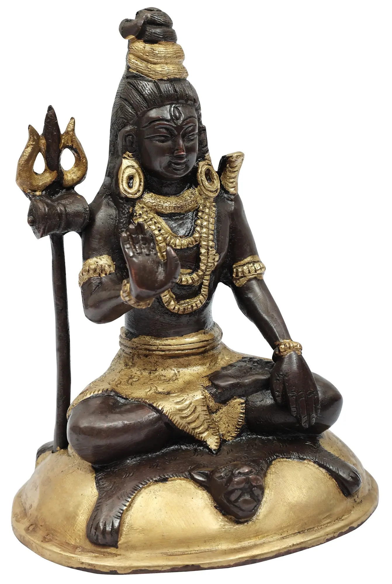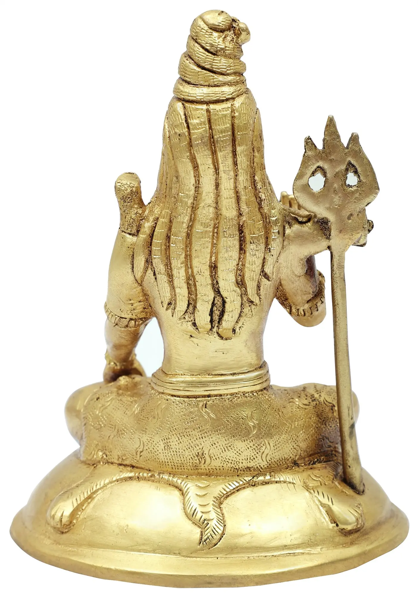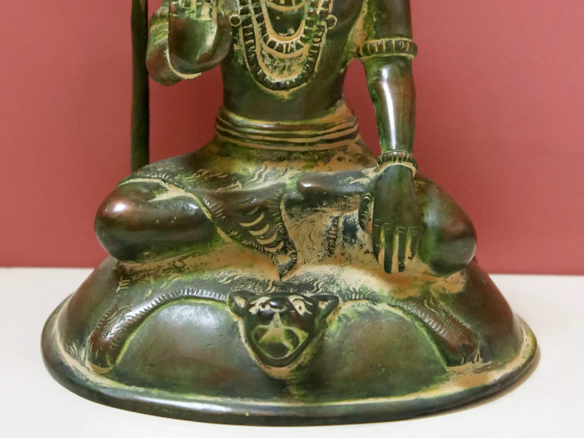 Lord Shiva, also known as Mahadev, is depicted in a meditative pose, seated on a tiger skin, symbolizing his conquest over desires and fears. His right hand is in “Abhaya Mudra”, signifying his role as the ultimate protector, dispelling all worries and obstacles on the path of righteousness. Trident, known as Trishul, represents his divine authority and cosmic control. With matted hair adorned with a crescent moon, a third eye on his forehead, and a serpent (Vasuki) coiled around his neck, Shiva embodies mystical attributes and divine prowess. Embrace the auspicious energy and spiritual essence of Lord Shiva in your sacred space with this cherished brass creation.