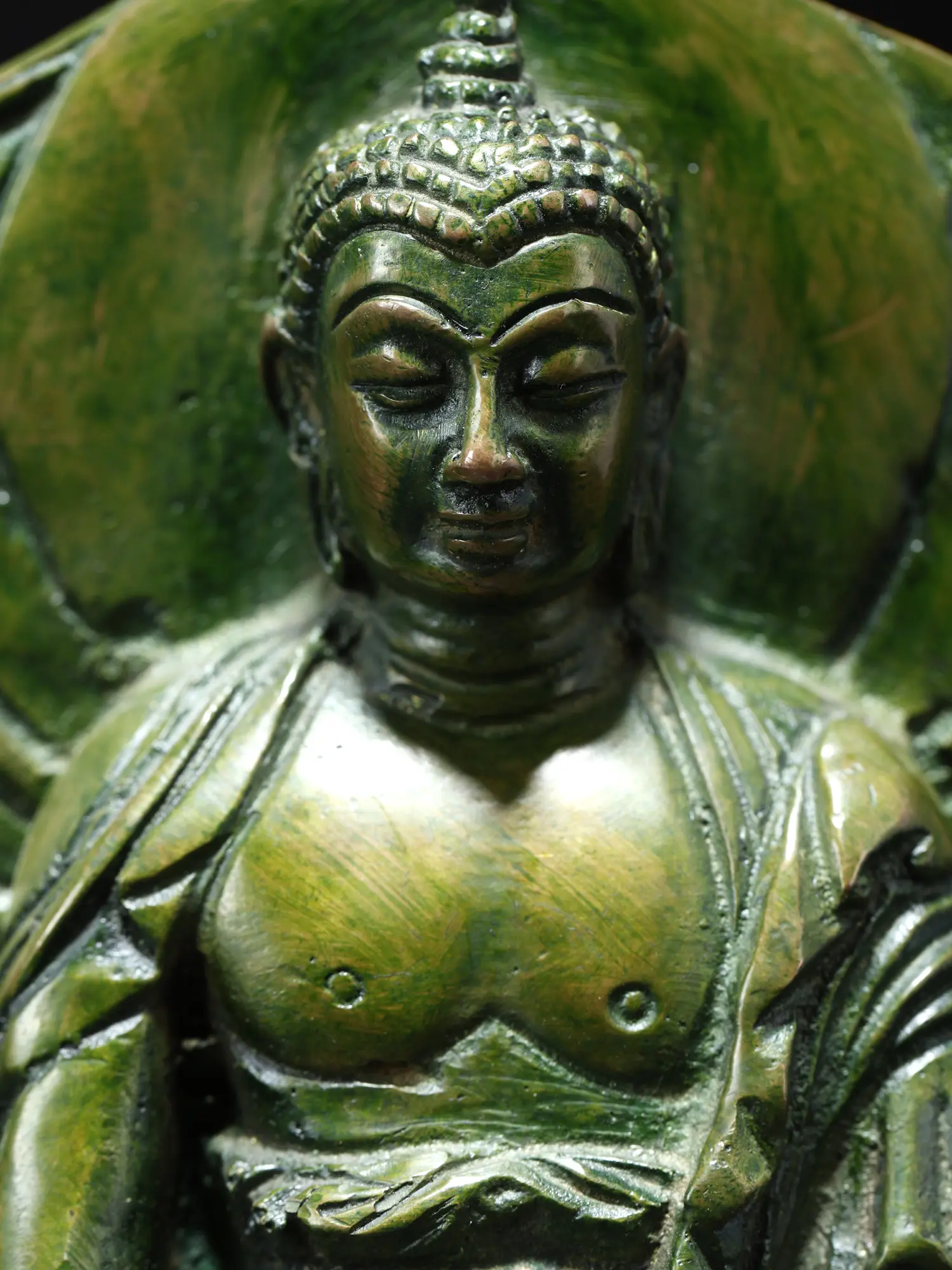 The Medicine Buddha (a Tibetan Buddhist deity), also known as “Bhaisajyaguru” or “Sangye Menla”, is described as a doctor who cures sufferings using the medicine of his teachings. As the supreme physician of the world, Buddha holds a medicinal plant (stem of the Aruna fruit or Myrobalan) in his right hand and a bowl filled with healing nectar in his left. It is believed that chanting his mantra purifies negative karma, brings peace and protection, and aids in overcoming obstacles. Crafted in Brass with meticulous attention, this artwork invites devotees to seek his blessings to overcome physical and mental afflictions, attain spiritual well-being, and develop altruistic virtues.