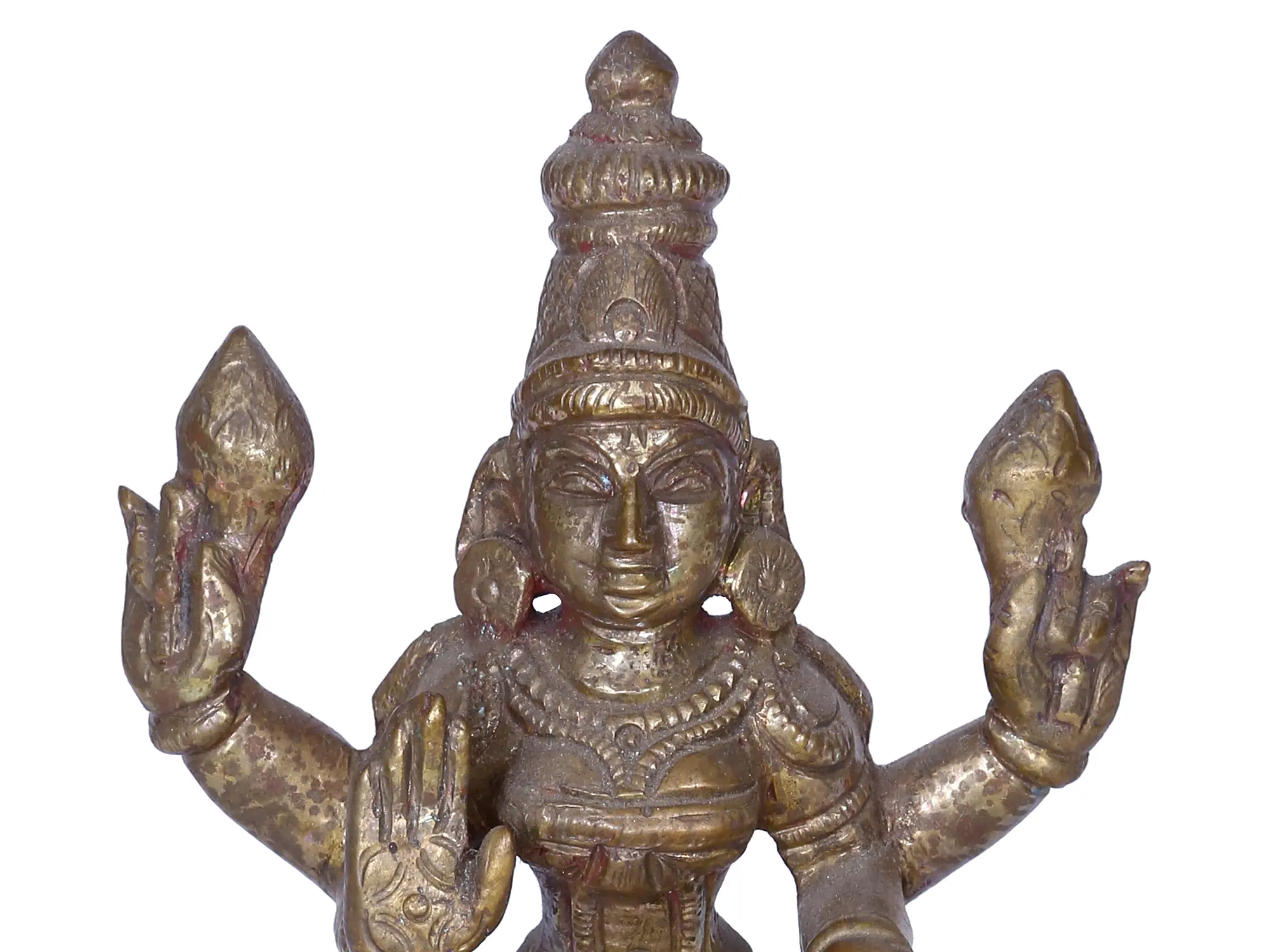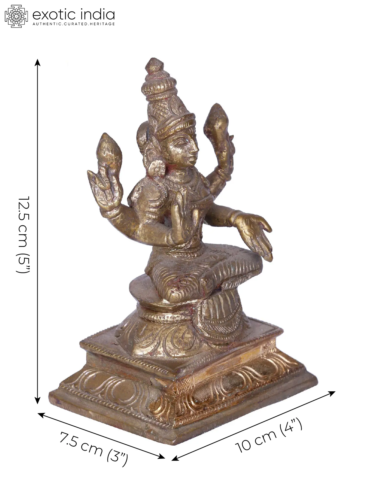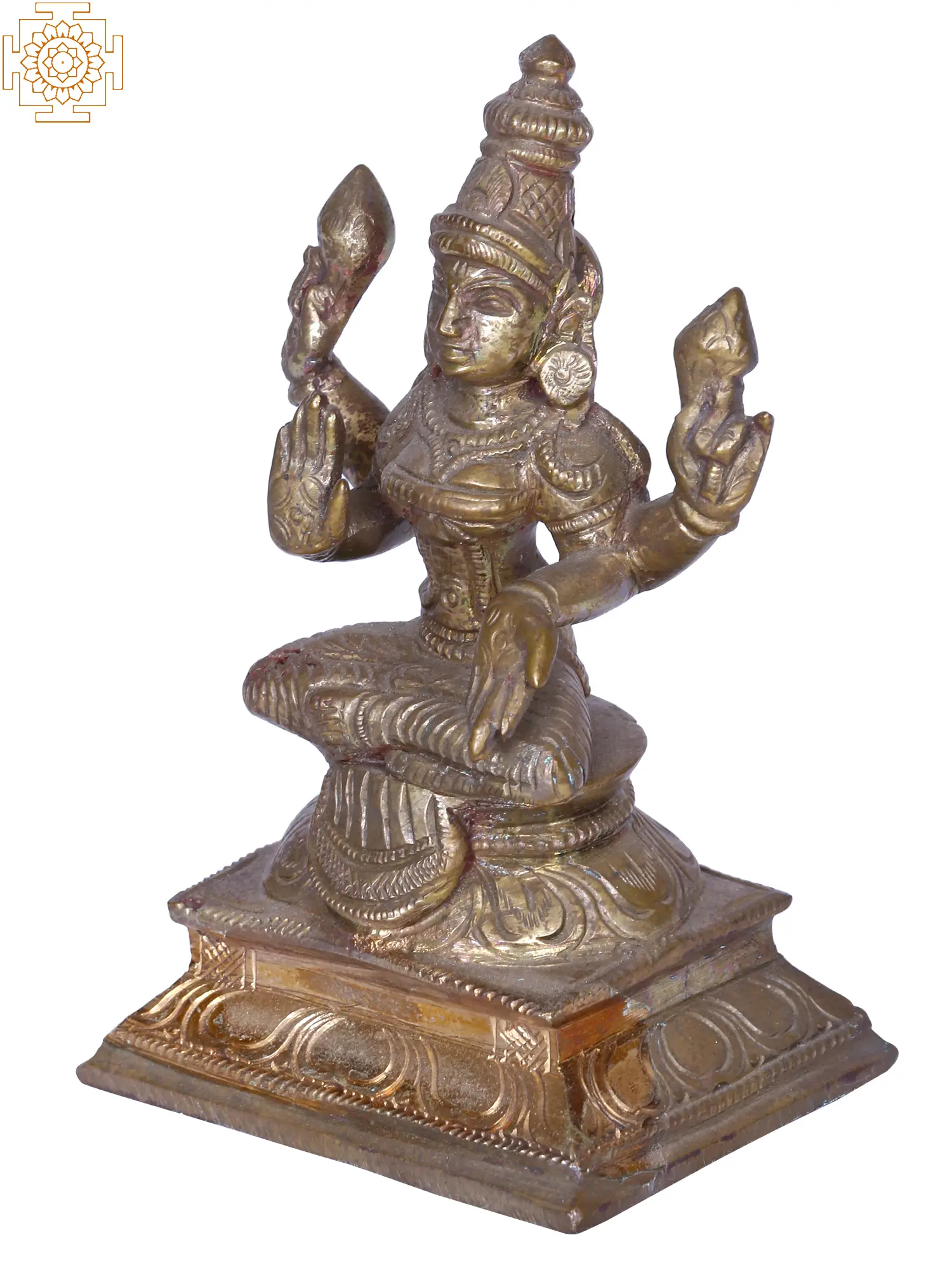 The Chaturbhuja or four-armed goddess Lakshmi, sitting cross-legged, in a powerful Padmasana posture in this bronze statue is an auspicious aspect of the Hindu mother goddess. Adorned with an elongated Vaishnava mukuta, necklace, Kuchabandha or breast band, and dhoti, Devi Lakshmi holds two lotuses symbolizing purity, divinity, and the origin of the universe. With her right hand in the Abhaya mudra or the gesture of removing fears and her left in the Varada mudra or the gesture of giving boons, goddess Lakshmi disseminates the wealth of three realms to his devotees.
