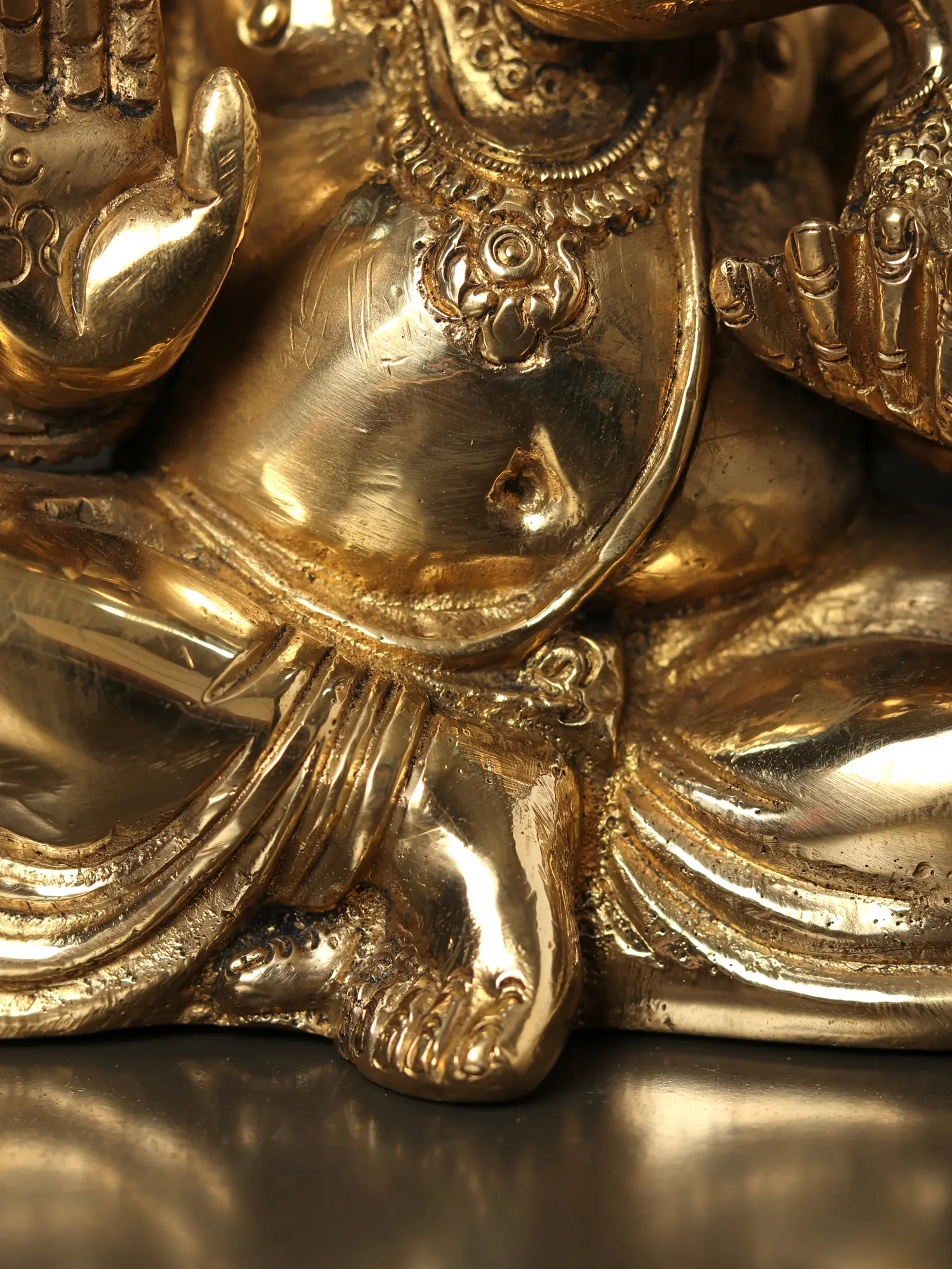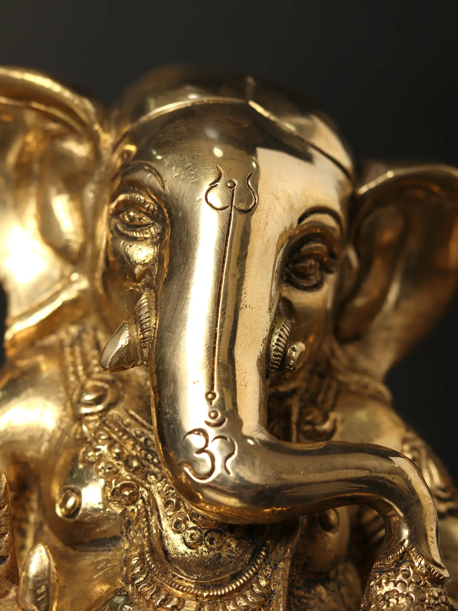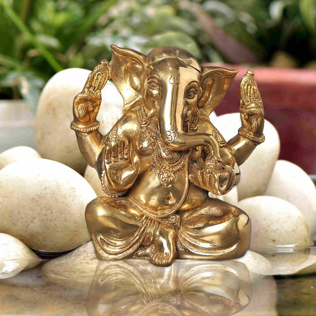 In this brass creation, Lord Ganesha, “the harbinger of Good Luck and wisdom”, emerges with serene grandeur. Seated in divine tranquillity, his benevolence flows like a river of bliss. His upper hands, adorned with a noose, signify the eternal binding of our desires, leading us towards the path of righteousness. His right hand is poised in “Abhaya Mudra”, a gesture of protection and assurance, enveloping the worshipper in a cocoon of fearlessness. His every bite of the sweet Modak blesses us with wisdom and prosperity. The trident (Trishul) mark on his radiant forehead symbolises the three realms of existence. With large ears ever attuned to our prayers, wearing the sacred Yajnopavita thread, Lord Ganesha beckons us to seek knowledge and truth.
