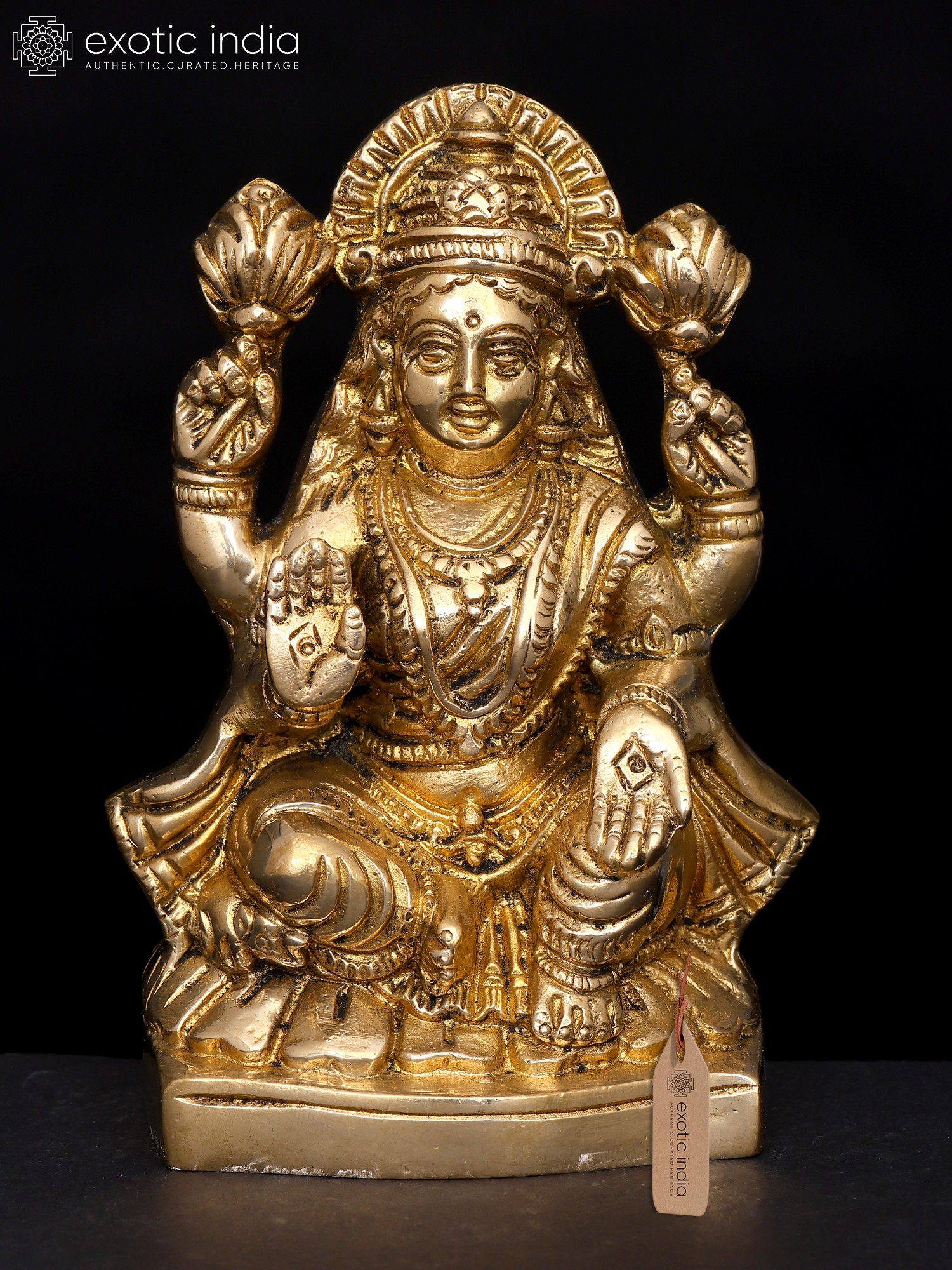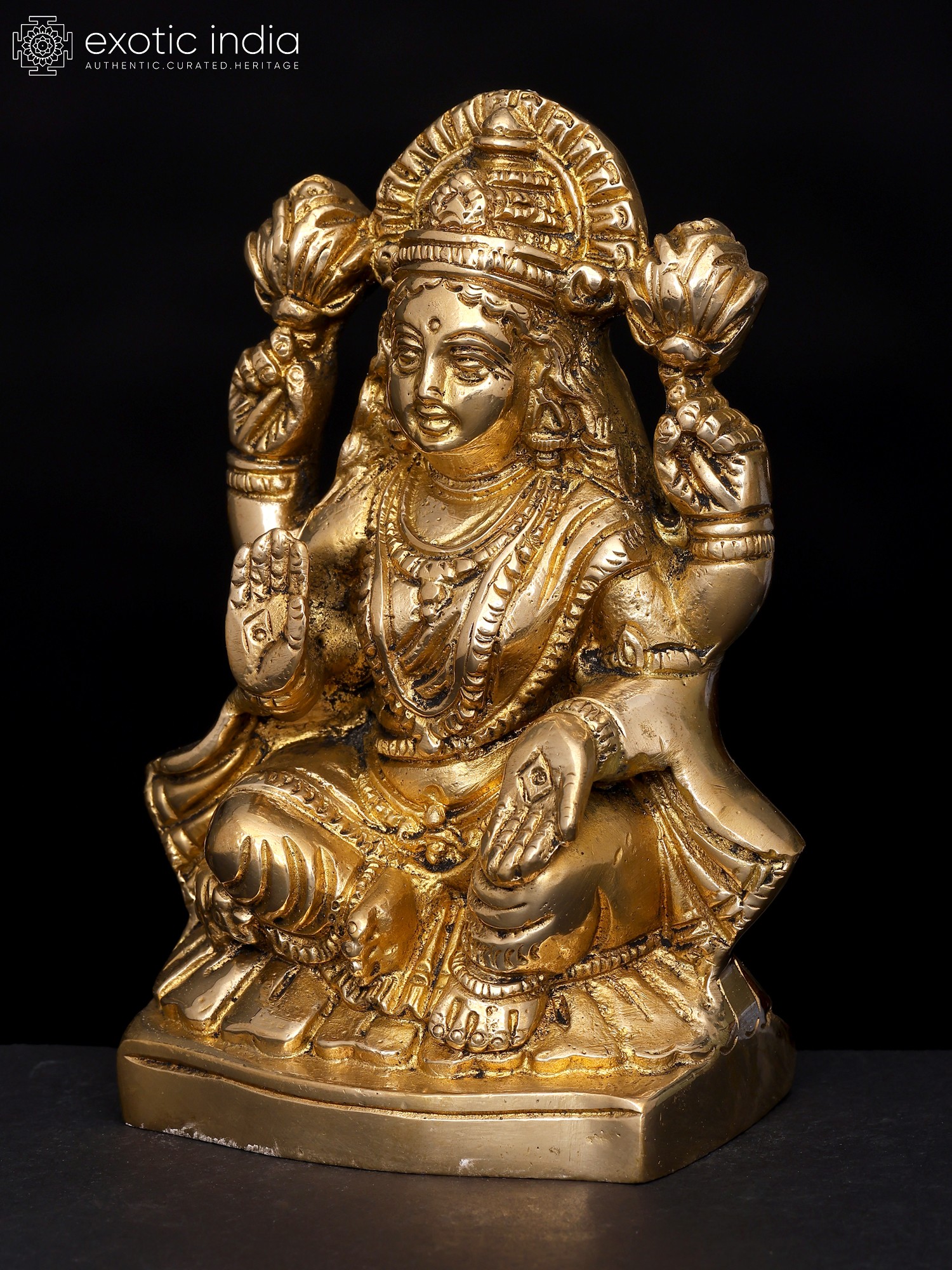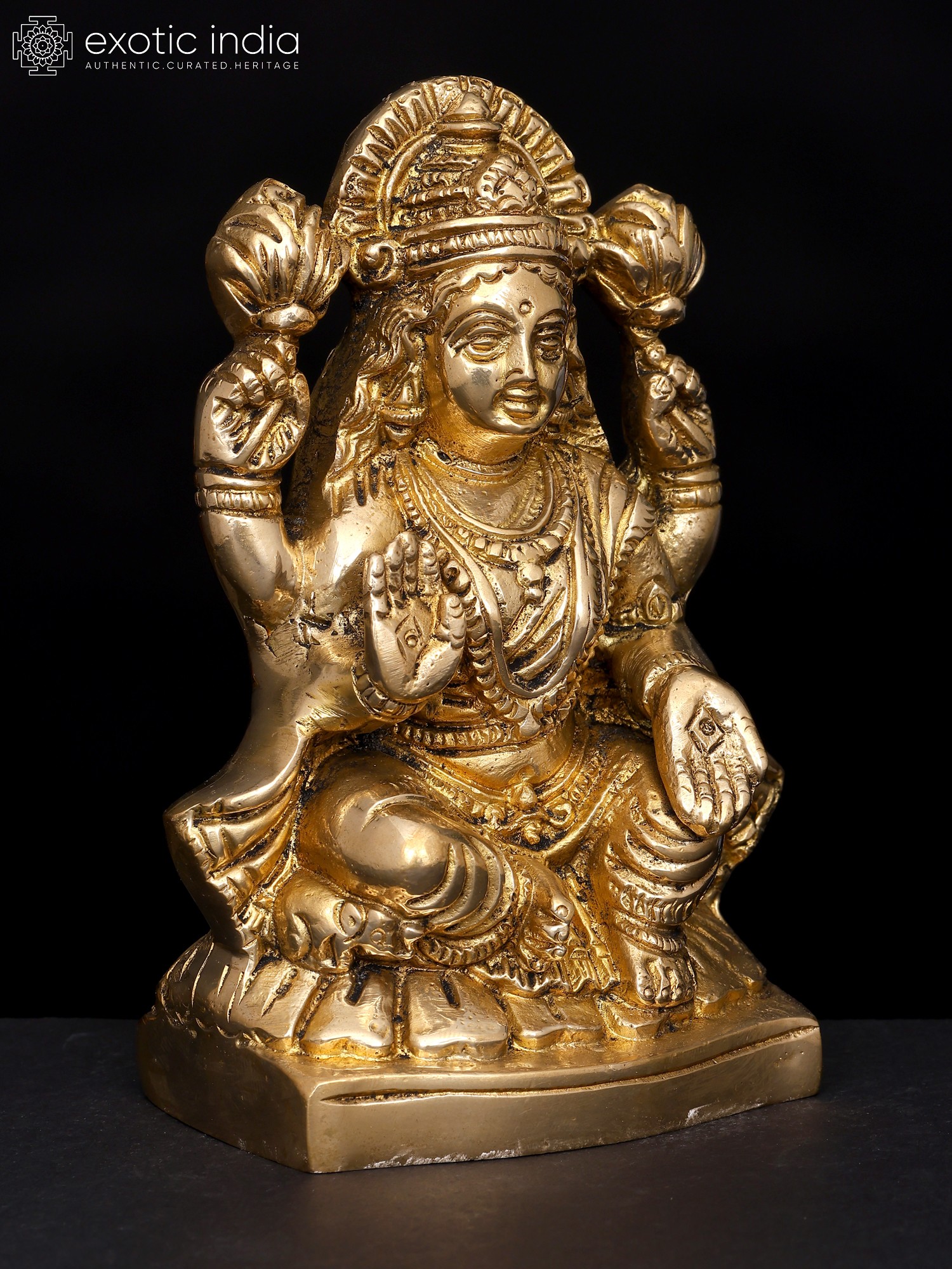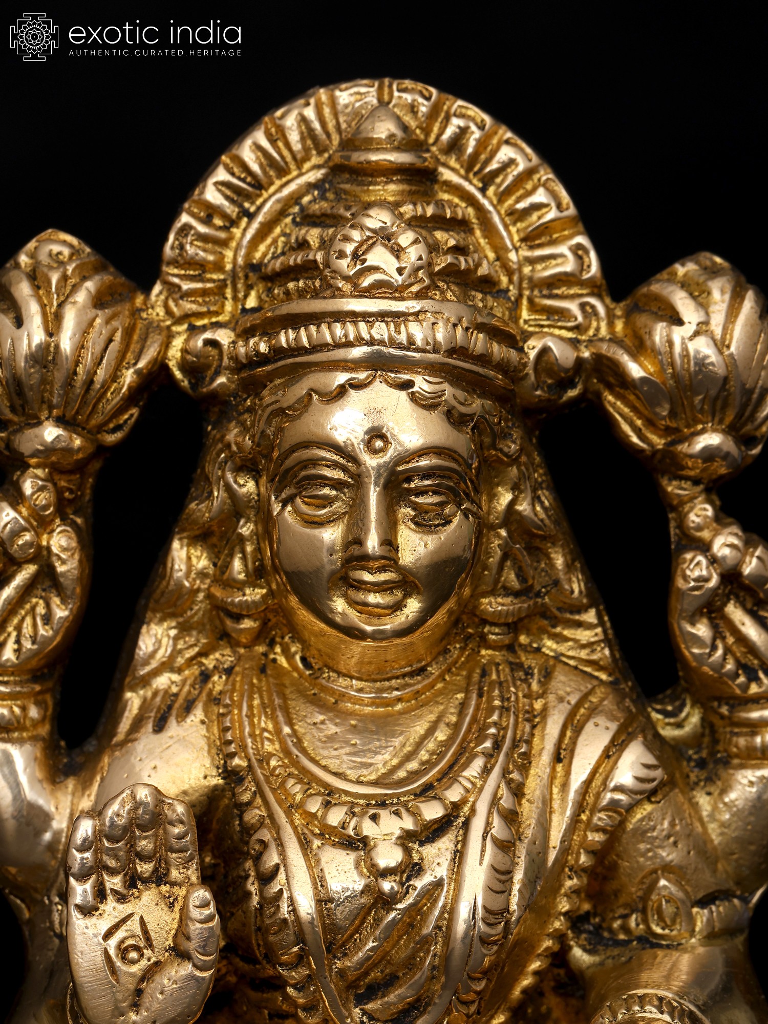 Goddess Lakshmi in a potent four-armed form, with her primary hands in the Abhaya and Varada mudra to nurture her devotees and lotuses in her secondary hands representing the origin of life and blossoming of inner consciousness, this brass Sri Lakshmi statue is a divine representation of the great mother goddess, as the progenitor and nurturer of Srishti (creation). Devi Lakshmi is wearing a regal crown, ornate jewelry, and a traditional sari, embellished with incised lines to mark the fabric folds. She is enthroned on a fully blossomed lotus whose petals are visible underneath her regal pose known as Maharajalilasana. Devi’s facial features are revealed in the statue by the use of measured incised lines, which combine to give the goddess a pleasant and divine expression.