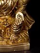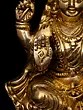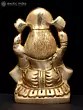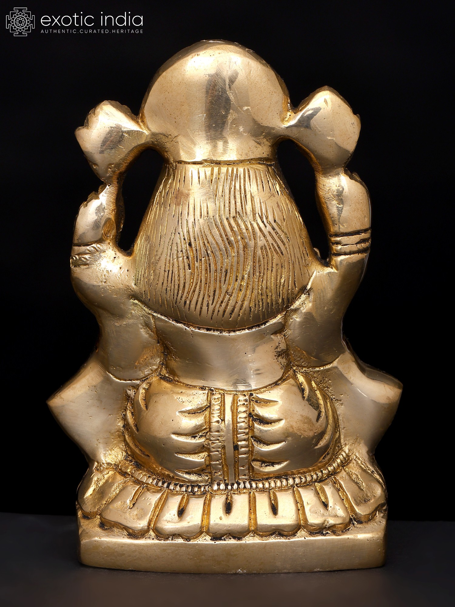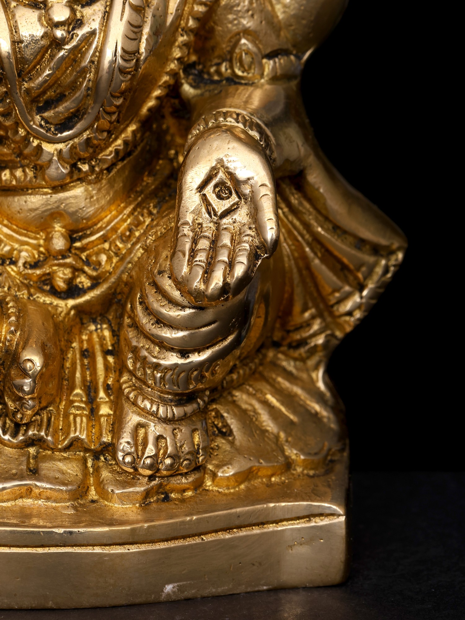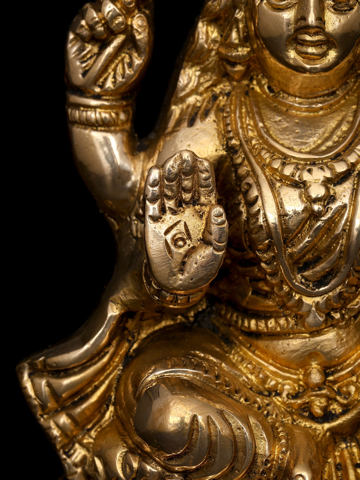 Goddess Lakshmi in a potent four-armed form, with her primary hands in the Abhaya and Varada mudra to nurture her devotees and lotuses in her secondary hands representing the origin of life and blossoming of inner consciousness, this brass Sri Lakshmi statue is a divine representation of the great mother goddess, as the progenitor and nurturer of Srishti (creation). Devi Lakshmi is wearing a regal crown, ornate jewelry, and a traditional sari, embellished with incised lines to mark the fabric folds. She is enthroned on a fully blossomed lotus whose petals are visible underneath her regal pose known as Maharajalilasana. Devi’s facial features are revealed in the statue by the use of measured incised lines, which combine to give the goddess a pleasant and divine expression.