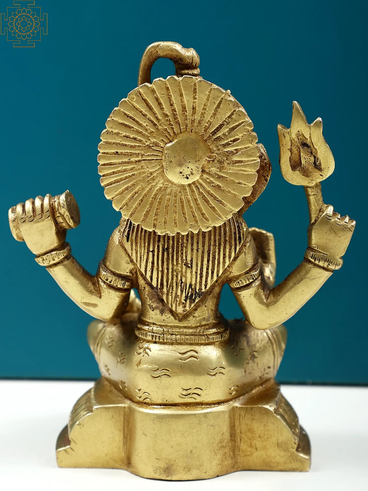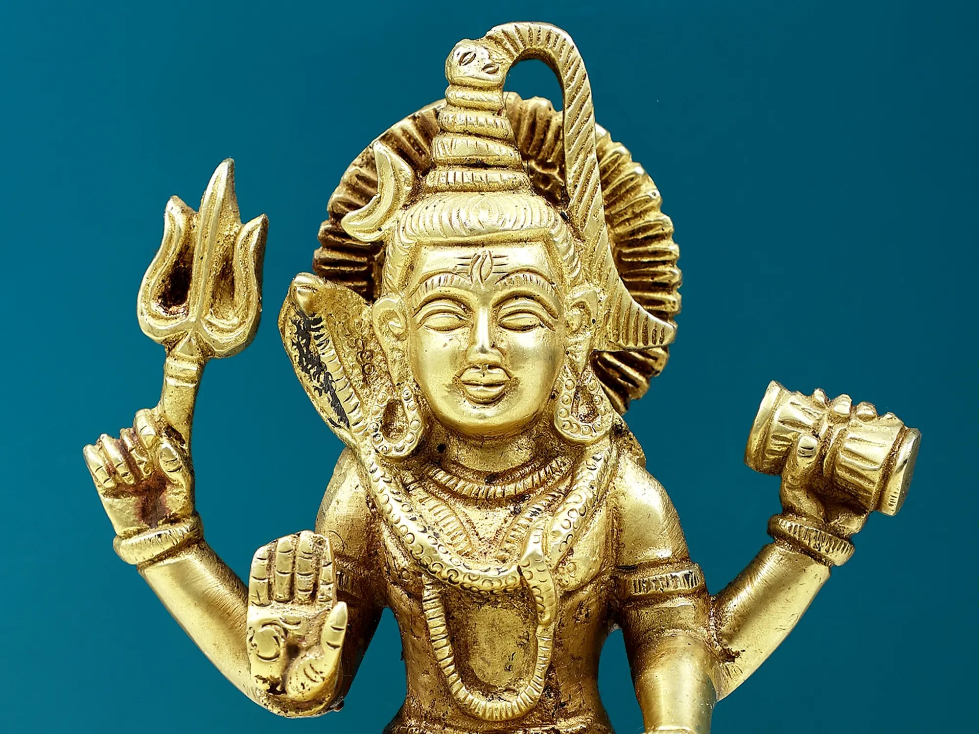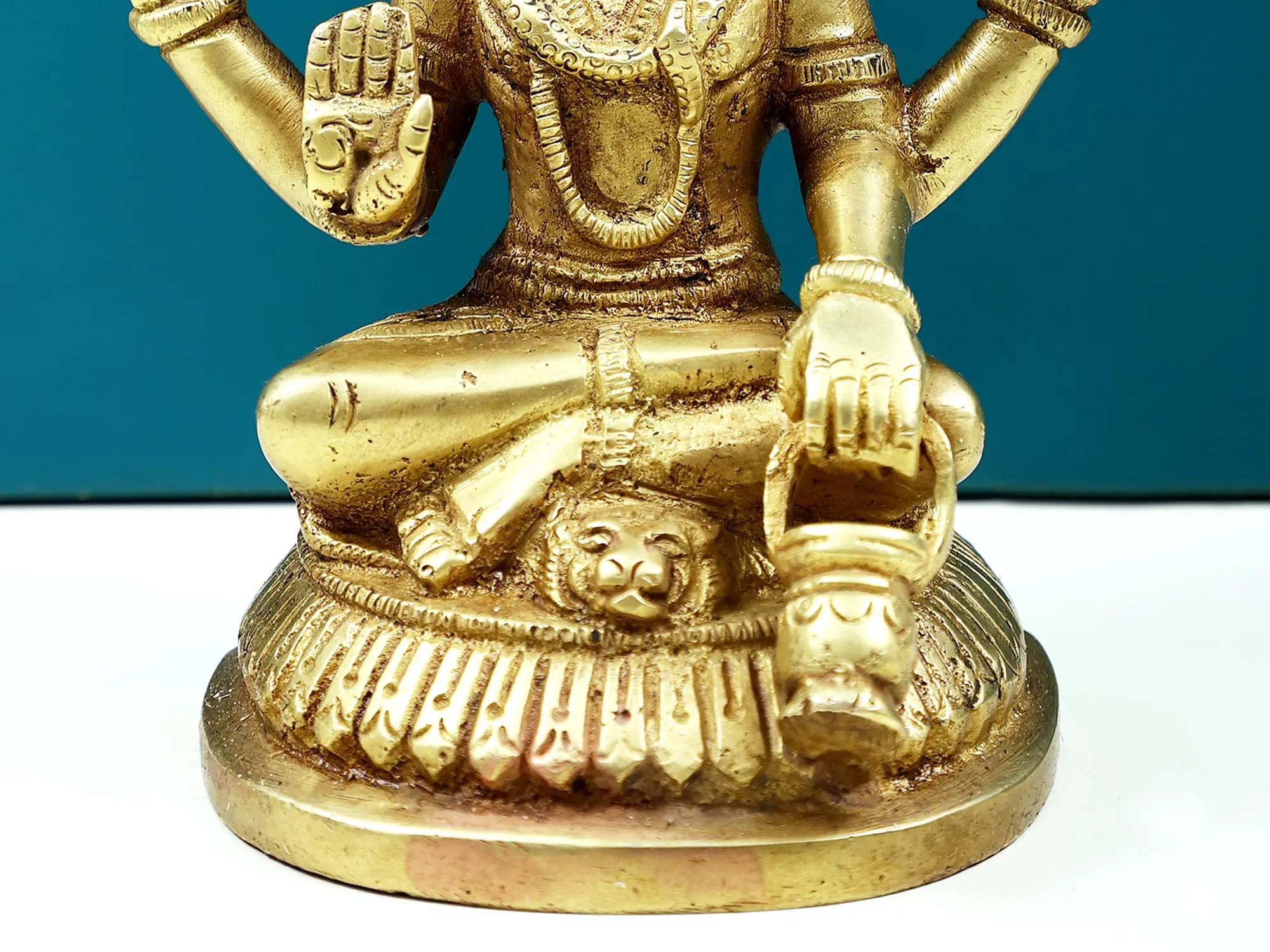In this statue, he is sitting in a lotus posture or padmasana (to sit cross legged), lost in meditation. He is resting on a tiger which is kept on an inverted lotus. Just as a tiger gains victory over its desires by killing its prey, similarly, Lord Shiva is sitting on tiger and wearing its skin as his apron to demonstrate the victory of his desires. A snake is a symbol of death, so Shiva uses this venomous snake as his neck ornament to convey that only he can swallow the poison to save the world from harshness. There is a soothing and relaxed smile on his face. Two round, dotted kundals and a necklace adorn his body with grace and charm. He has three eyes, that represent the three stages of the universe, namely, past, present and future. Third eye, which is an embodiment of knowledge, fearlessness and wisdom, is in the middle of the forehead.