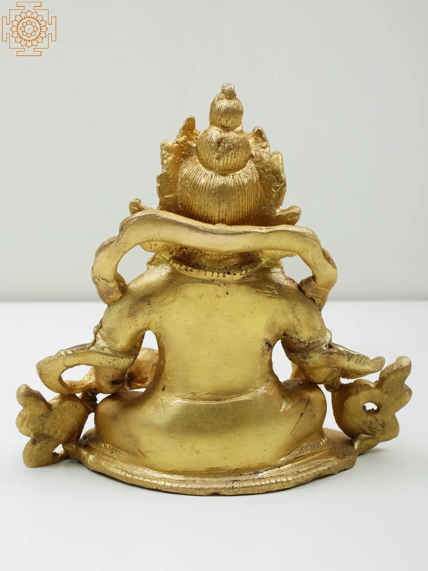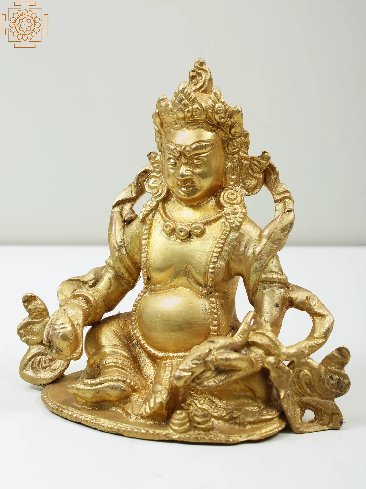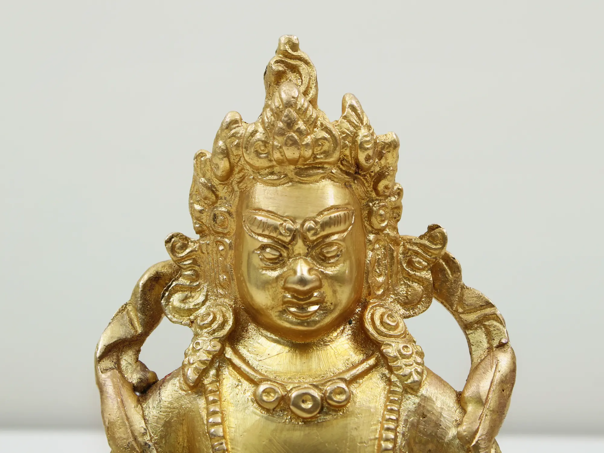 Handcrafted with reverence, the small brass Tibetan Buddhist Kubera sculpture embodies prosperity beyond material wealth. Kubera's plump form reflects his abundant blessings, his belly representing contentment. Holding a mongoose that showers jewels, he signifies the power of giving and generosity. The lemon he holds symbolizes purification. As the guardian of the northern direction and treasurer of the gods, Kubera's presence invokes blessings that extend beyond the material realm. This sculpture is a reminder that true riches lie in a heart filled with gratitude and benevolence.