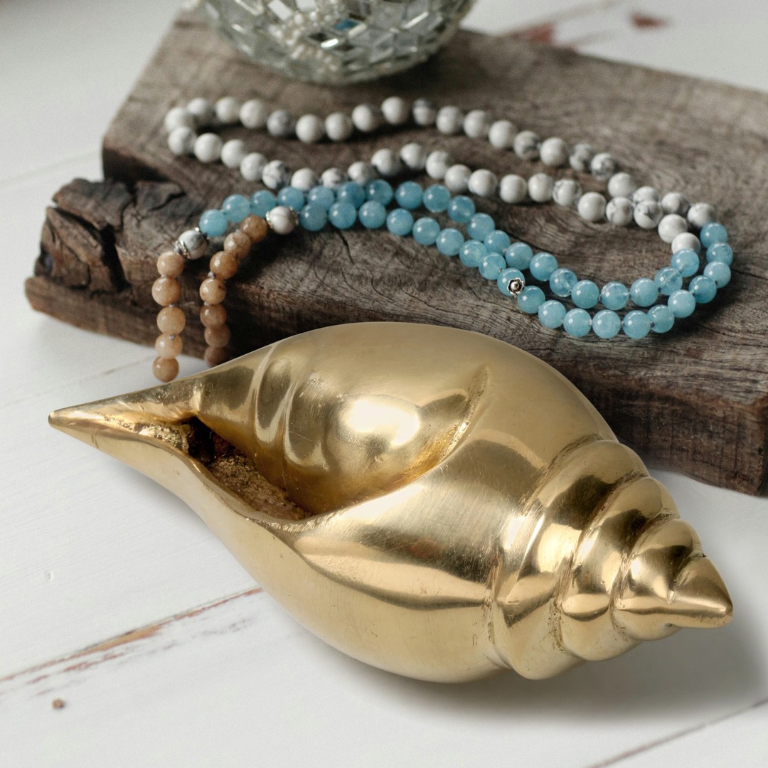 The resonance of creation within the Small Conch (Shankh) in Brass, the conch, known for its sacred significance in Hindu rituals, symbolizes the cosmic sound that brought the universe into existence. Every inch of this sculpture is embedded with sound and vibration. The conch, which resonates with the frequencies of the cosmos, finds harmony in aligning with the universe's rhythm. Embrace the energy of the conch, knowing that within its sacred spiral, lies the divine sound that connects you with the cosmic dance of existence.