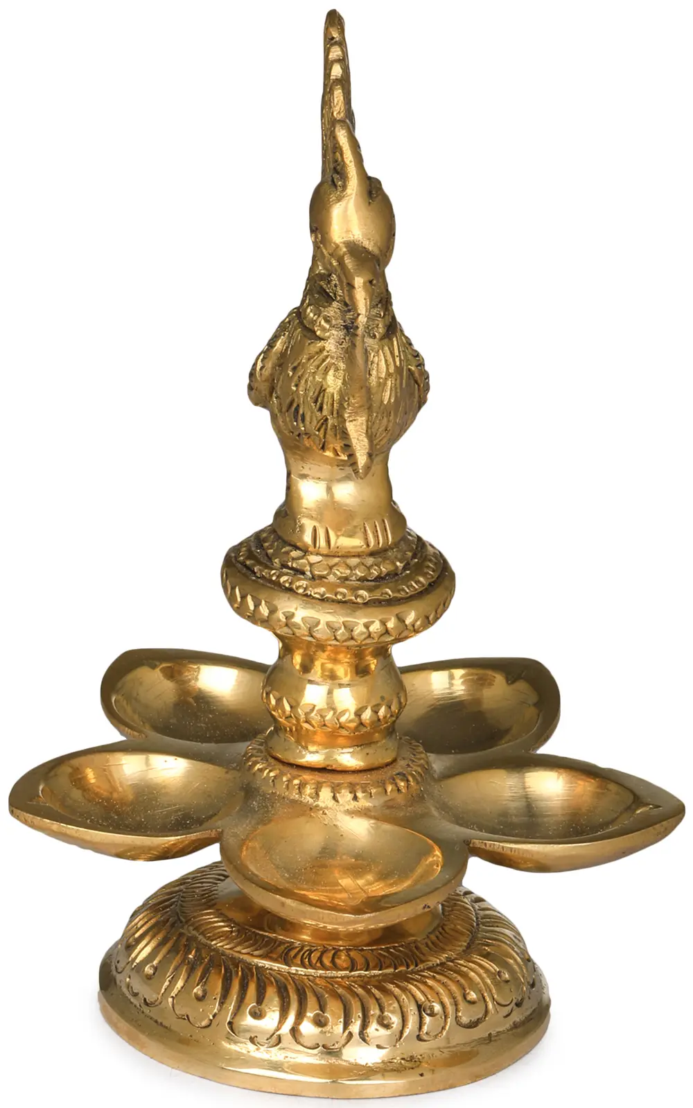 A Bhadradeepam inspired the lamp with five wicks. Each of these five burning lamps is said to represent Lord Shiva's five faces. By lighting five directions, the auspicious five-wick light is thought to bring success and fortune. This five-wick brass lamp with a peacock pattern in the center is known as a Mayil Vilakku. It is made of high-quality brass and has a matt golden finish for royal brilliance.