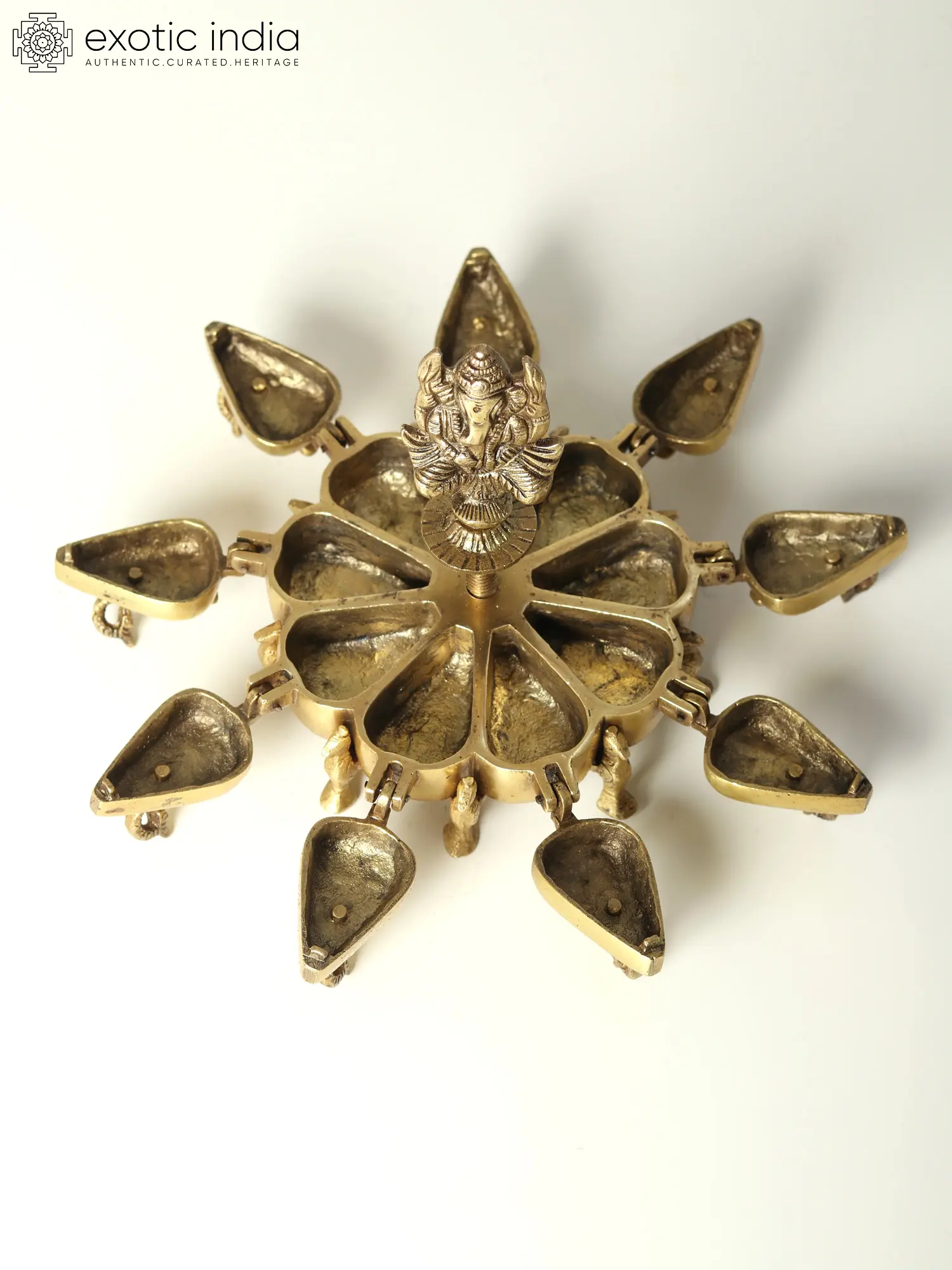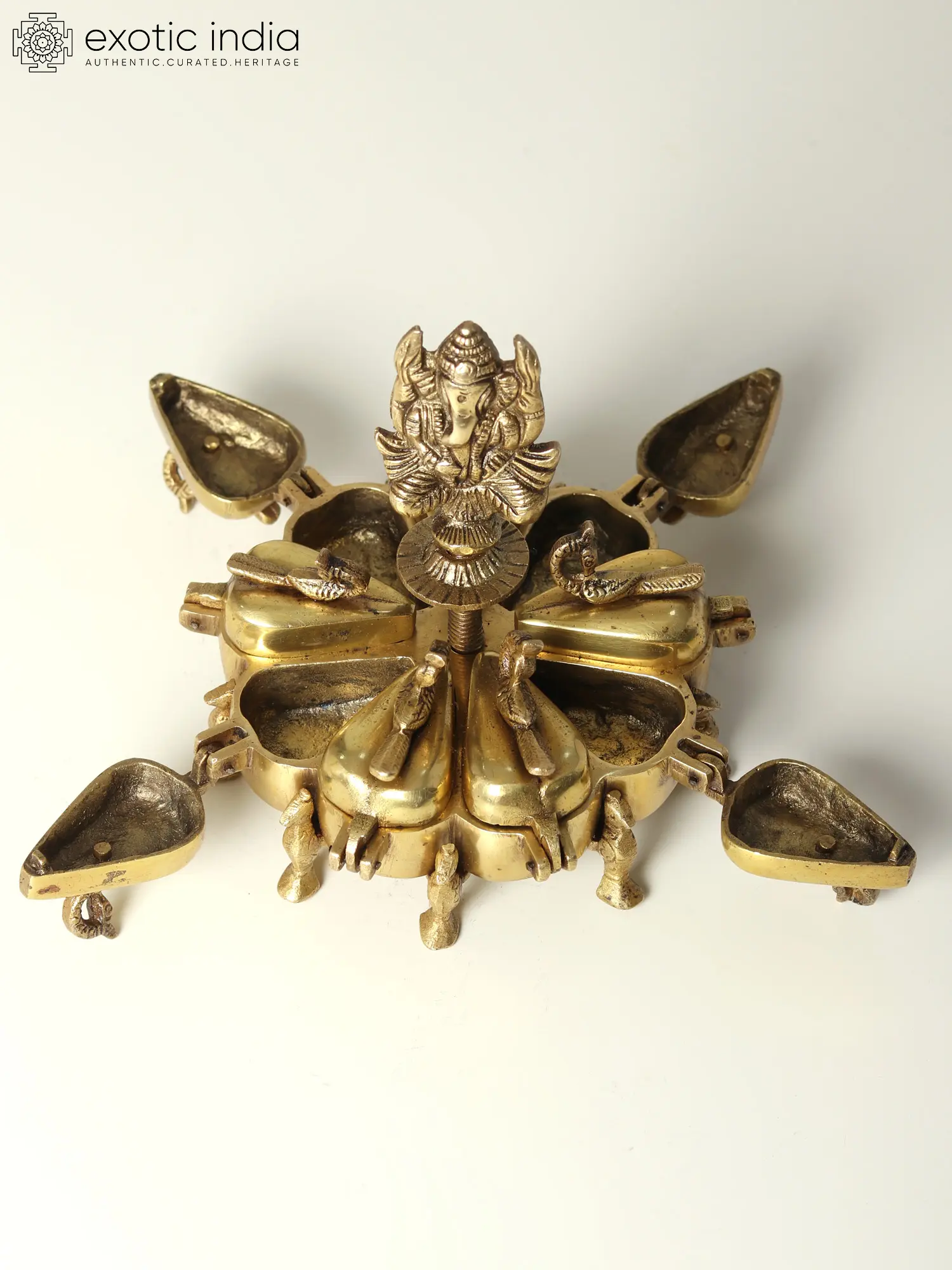 This Small Ganesha Puja Box in Brass, featuring the sacred image of Lord Ganesha, is a ceremonial artifact that mixes religious iconography and ritualistic function. This box is made of brass and features a Ganesha sign in the center that is attached to the box. It consists of nine sections. Loosening the Ganesha statue on top allows access to each chamber, which blooms like a flower. It has been meticulously constructed. It can be used to preserve and keep ayurvedic powders, cosmetics, spices, vermilion, and other powders safe. The old brown patina-look box could potentially be a valuable decorative object.