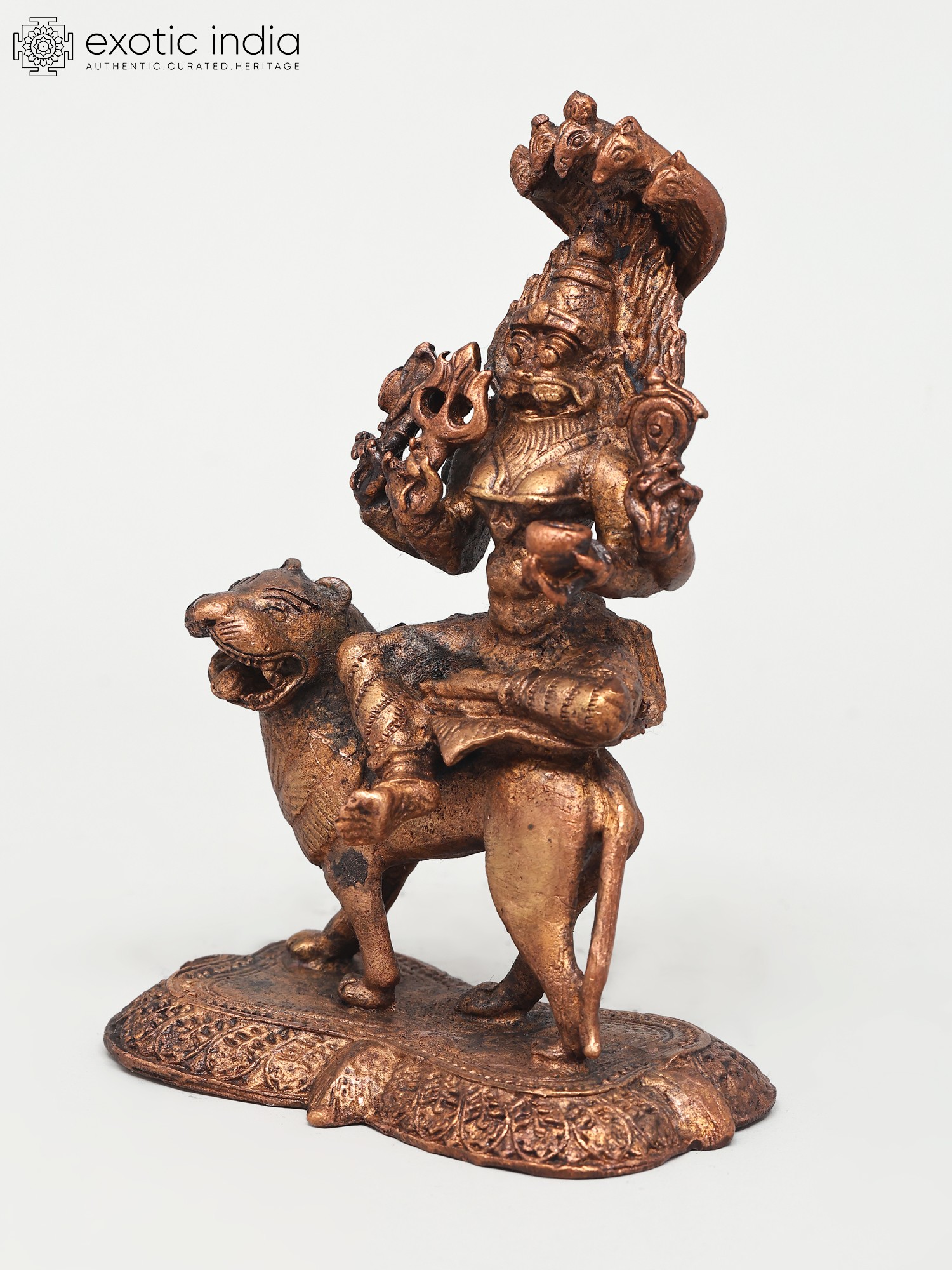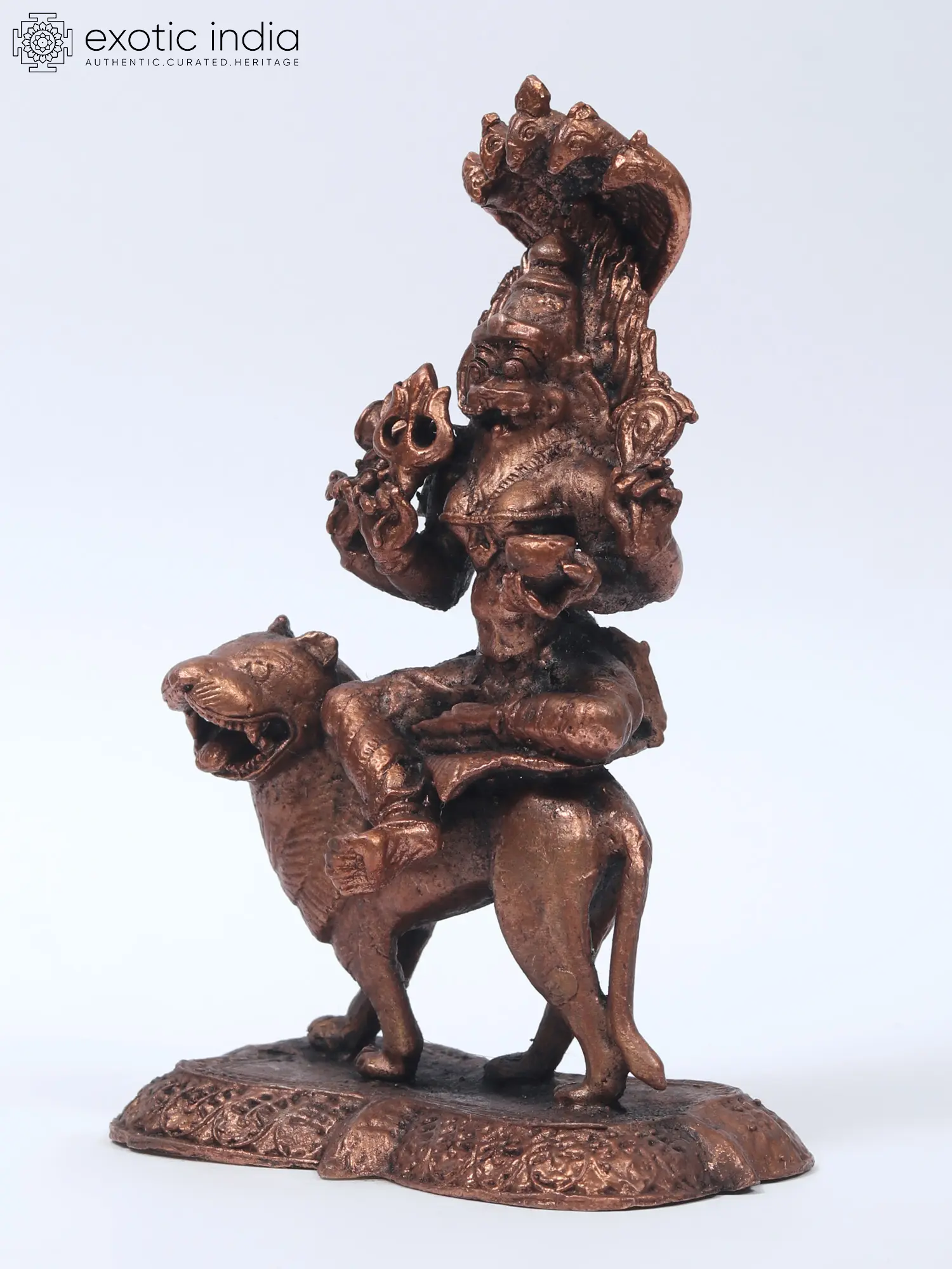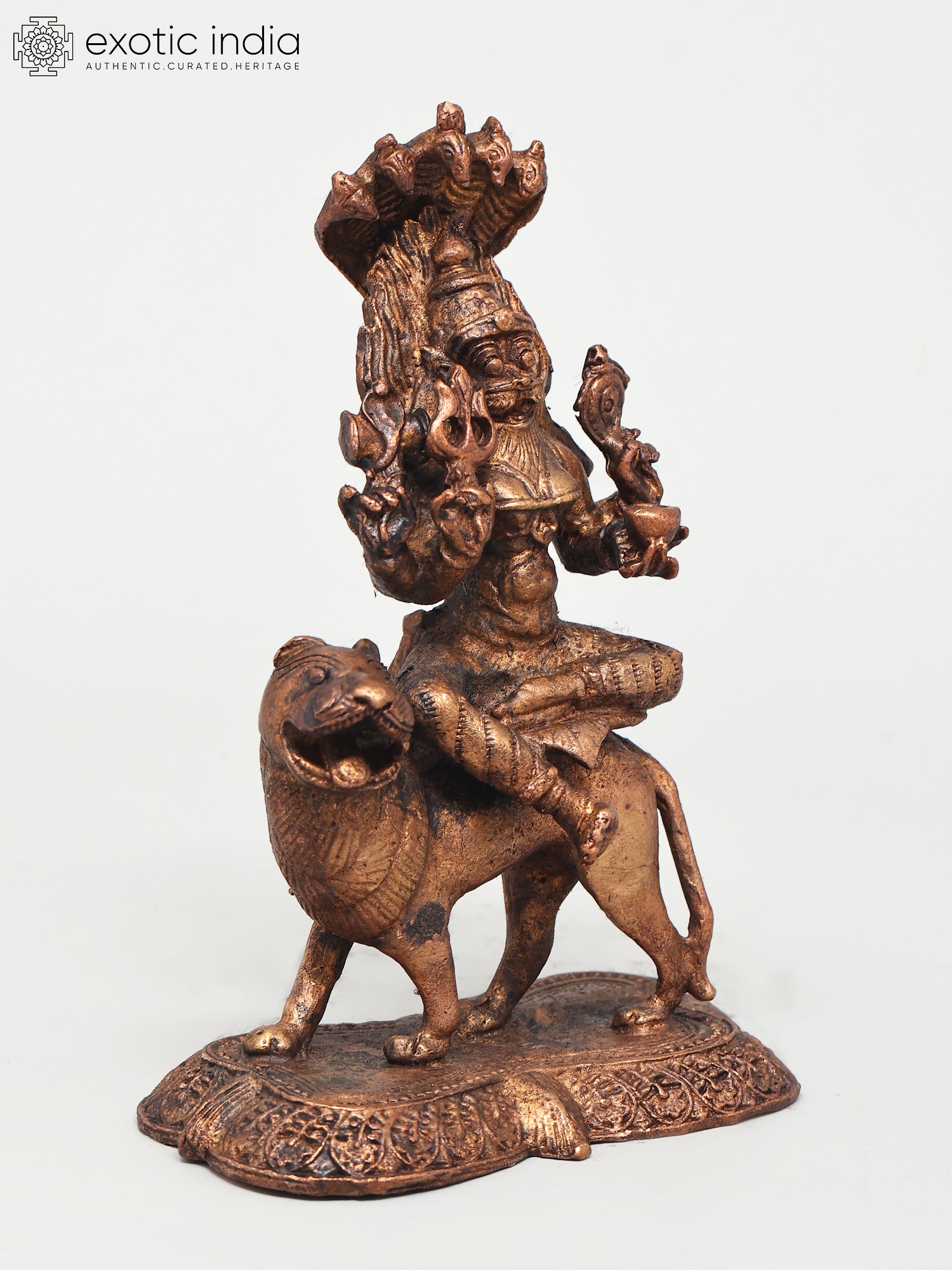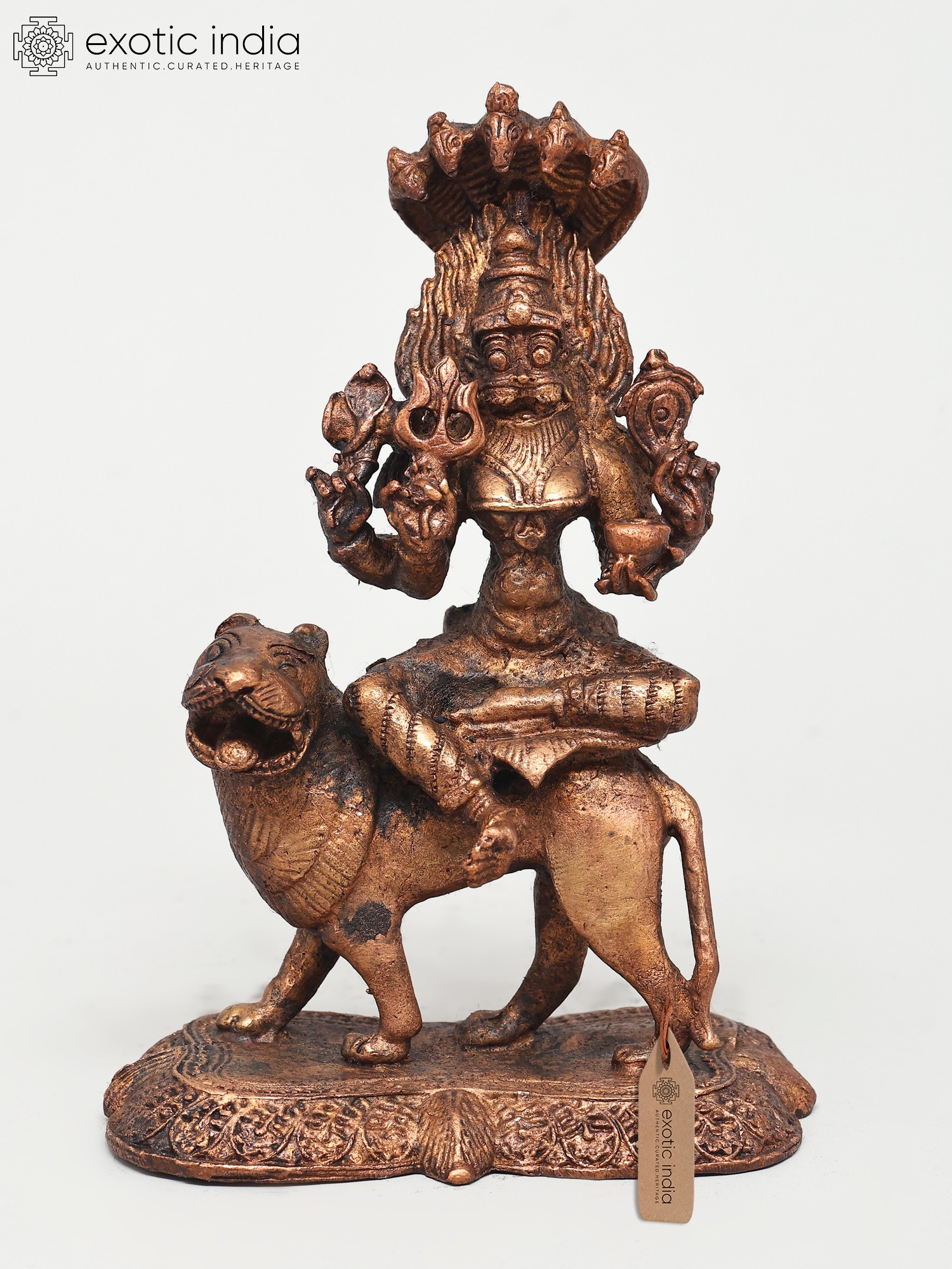 This copper statue depicts Goddess Pratyangira sitting on a tiger and wearing a Sesh Naag hood. Worshipping this statue allows the devotee to keep bay the evil energies.
