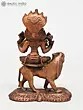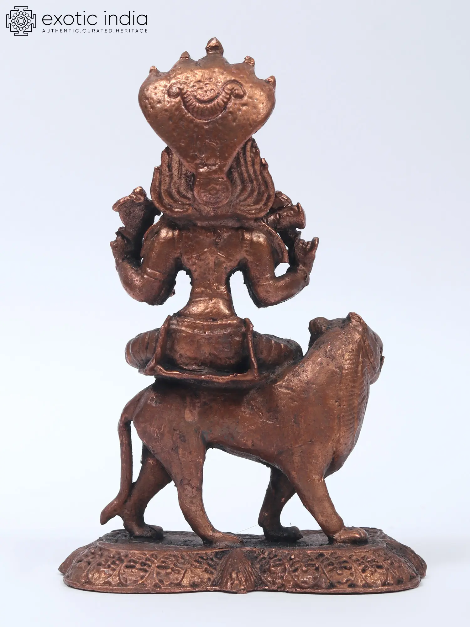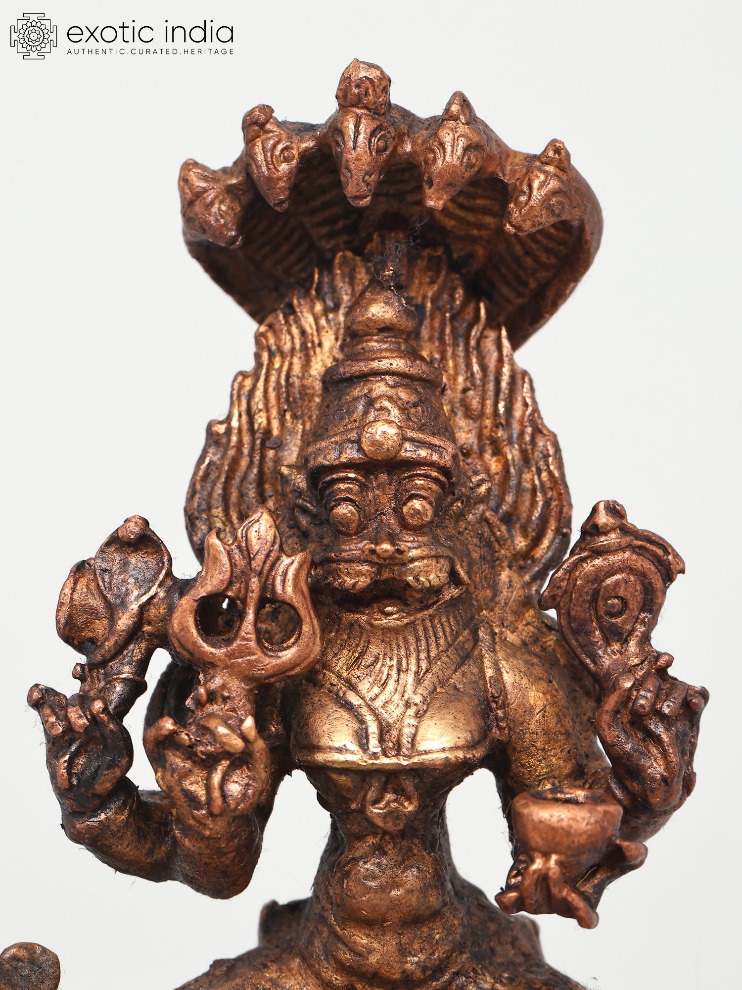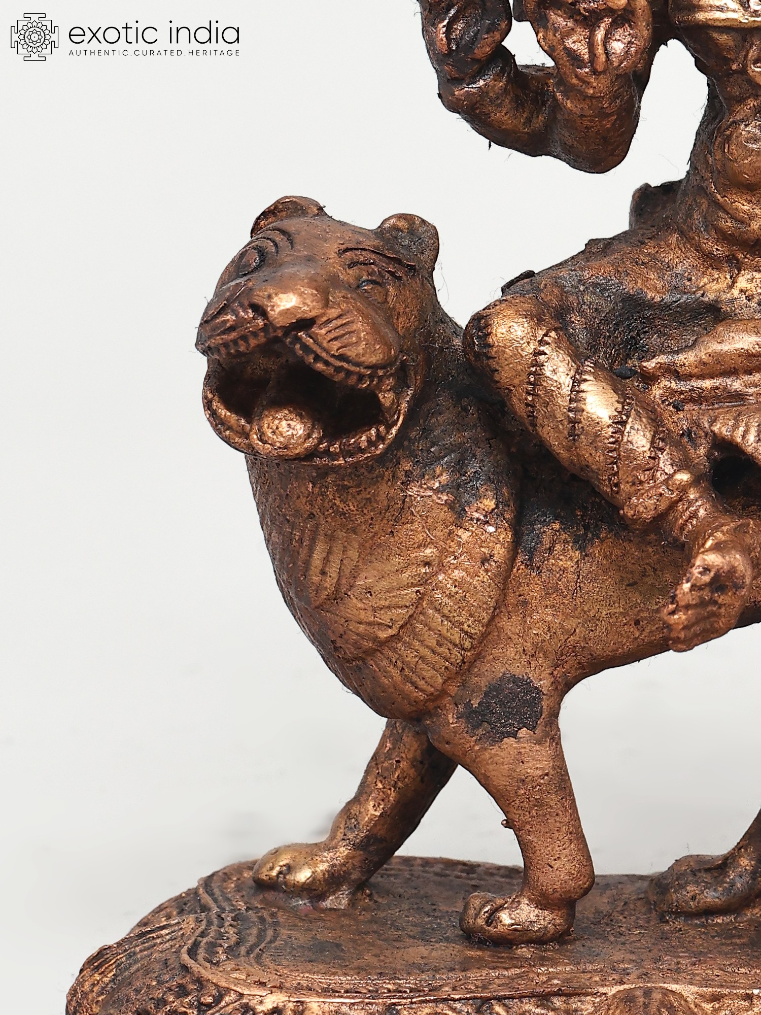 This copper statue depicts Goddess Pratyangira sitting on a tiger and wearing a Sesh Naag hood. Worshipping this statue allows the devotee to keep bay the evil energies.