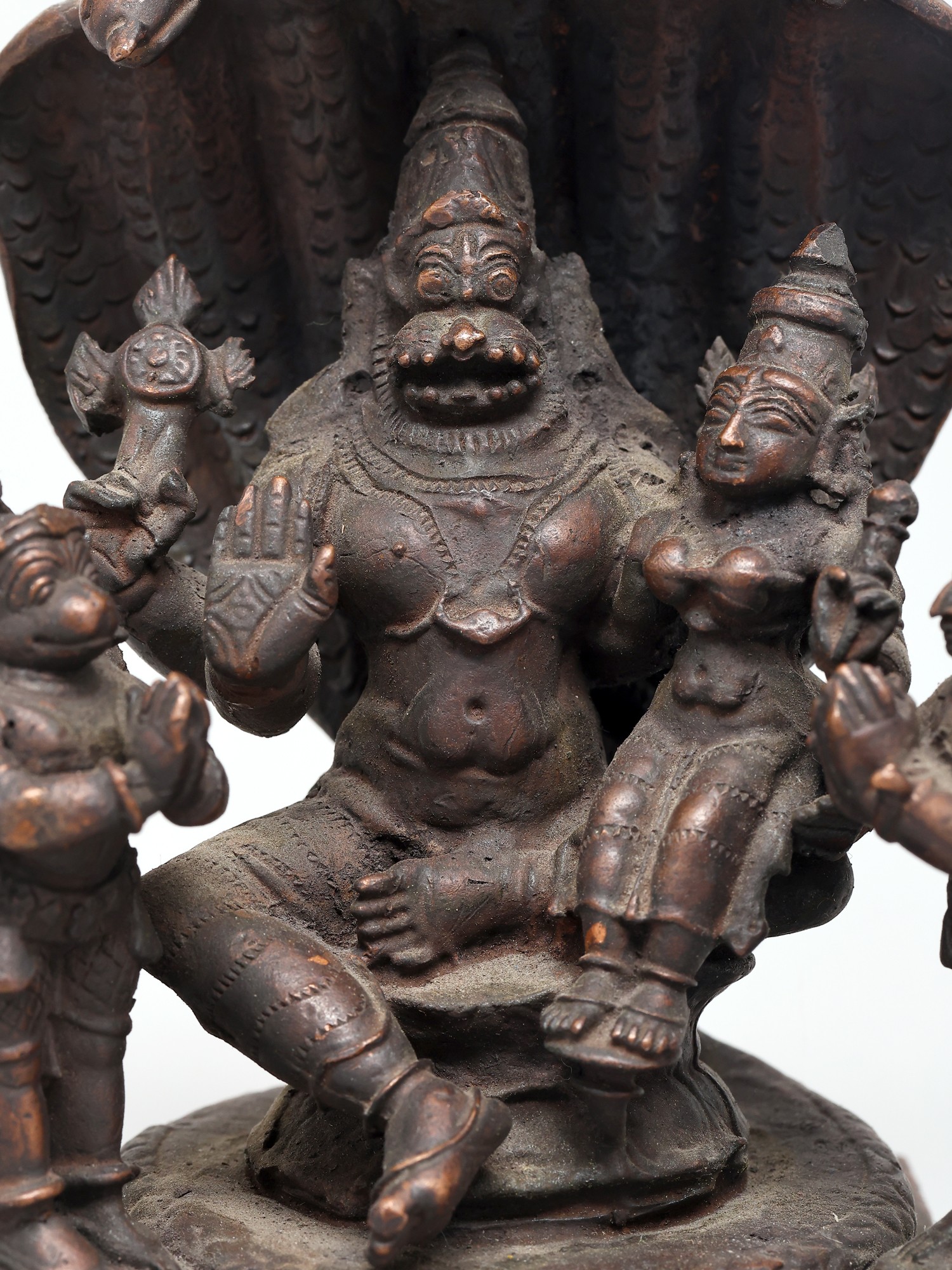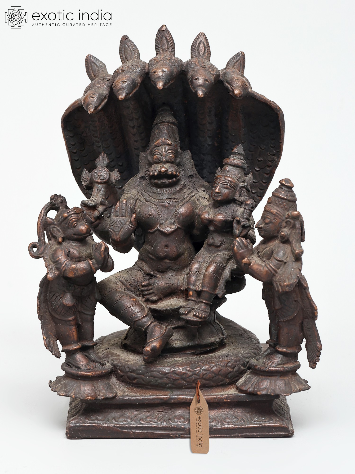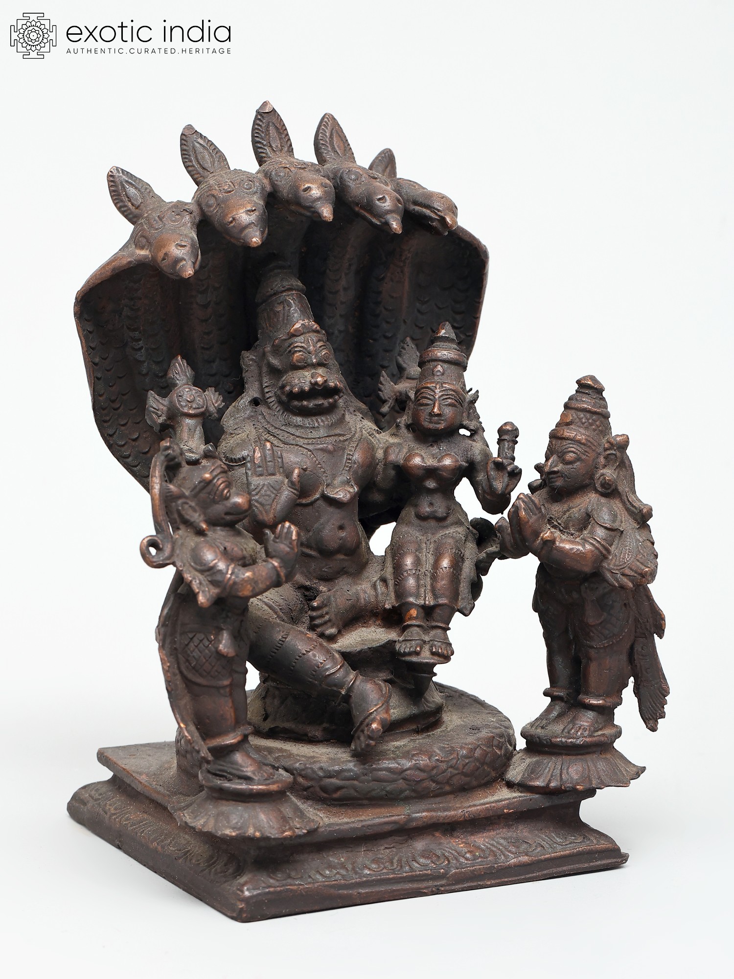 5" Copper Statue of Lakshmi Narasimha Seated on Sheshnag