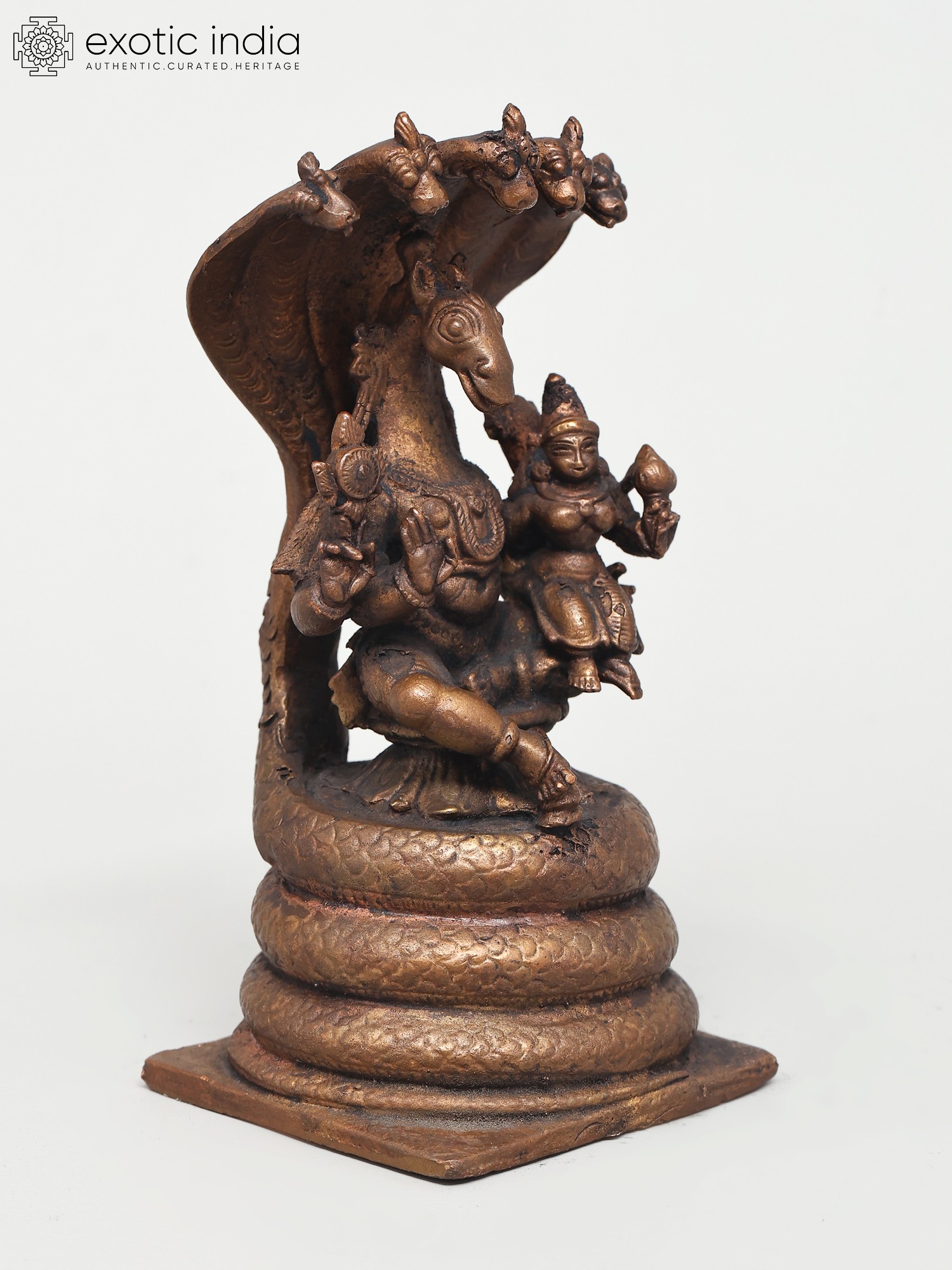 5" Small Lord Hayagriva with Devi Lakshmi Seated on Sheshnag | Copper Statue