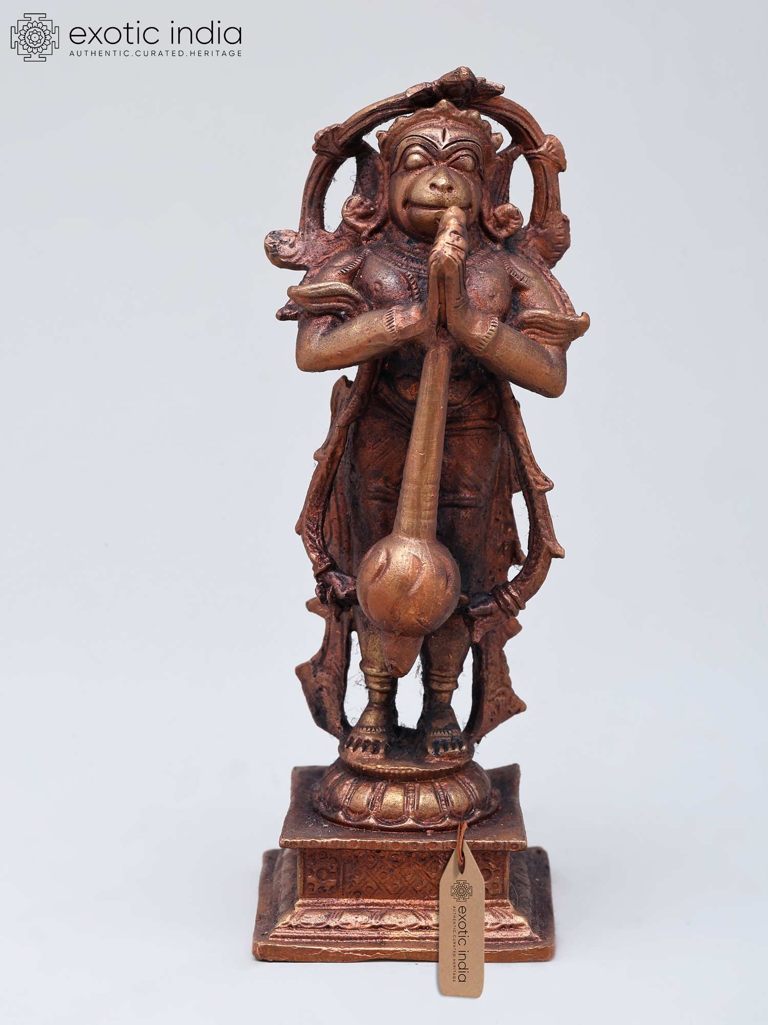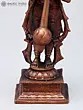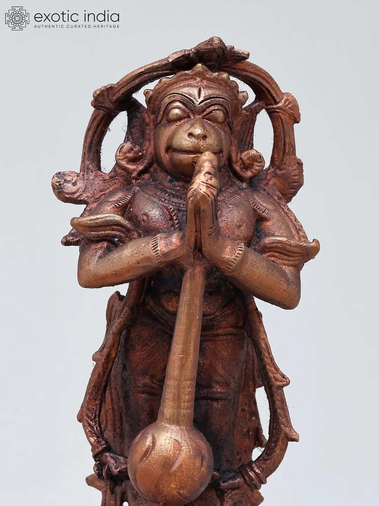 This exquisite copper statue captures the divine form of Lord Hanuman, the devoted warrior and loyal servant of Lord Rama. In this pose, Hanuman stands with his hands pressed together in Añjali Mudra, a gesture of profound respect and supplication, while holding his mighty mace (Gada) upright. The posture signifies his unwavering devotion and readiness to serve, a quality that has made him one of the most revered deities in Hinduism. Crafted from copper, the statue boasts a rich, antique patina, giving it a timeless and sacred aura.