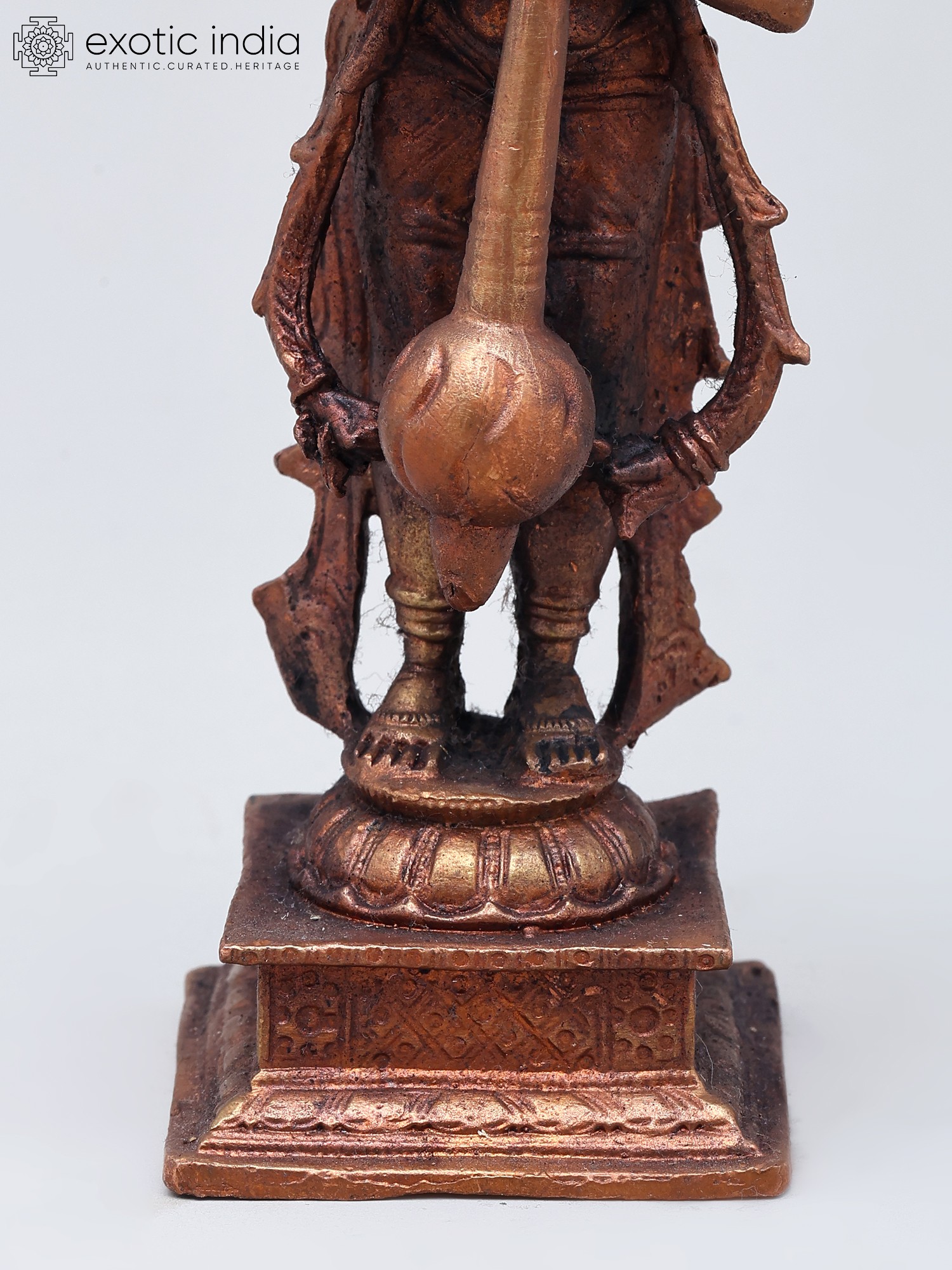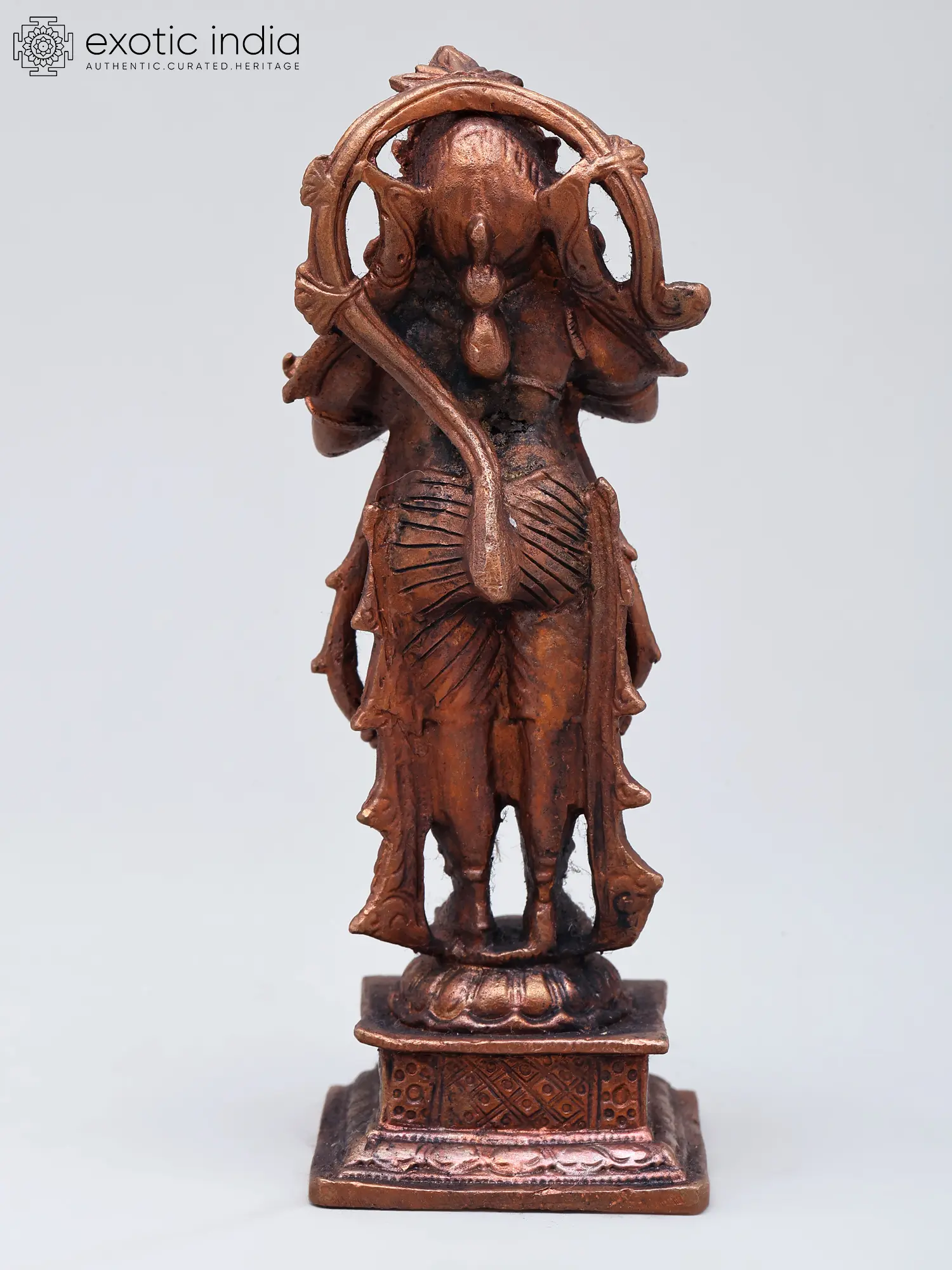 The meticulous craftsmanship evident in this statue highlights the skill of the artisan. Every detail, from the intricate carvings on his armor and waistcloth to the fierce yet compassionate expression on his face, is rendered with remarkable precision. The circular halo behind his head symbolizes his divine status and the radiant aura that surrounds him. The base on which he stands is equally detailed, adding to the overall grandeur of the piece. Copper statues hold significant cultural and religious importance in India, believed to possess auspicious properties and to attract positive energy. This particular representation of Hanuman, with his serene yet powerful demeanor, makes it a perfect addition to any collection of Indian art or religious artifacts.