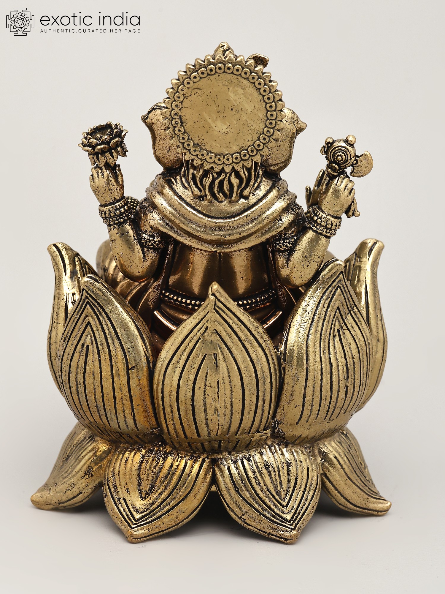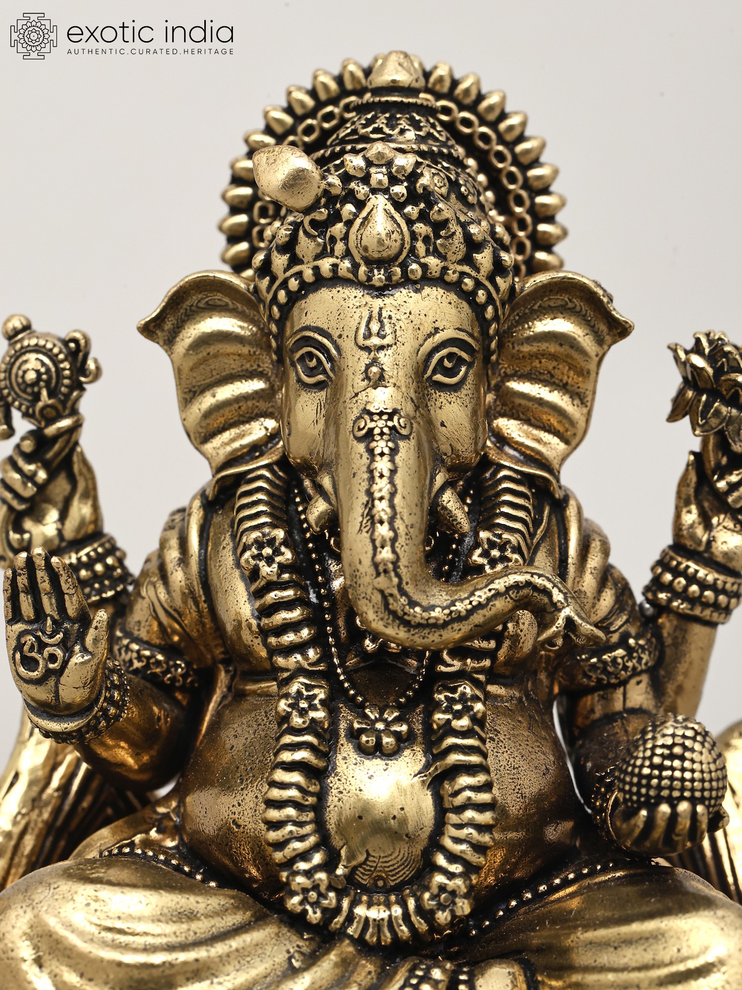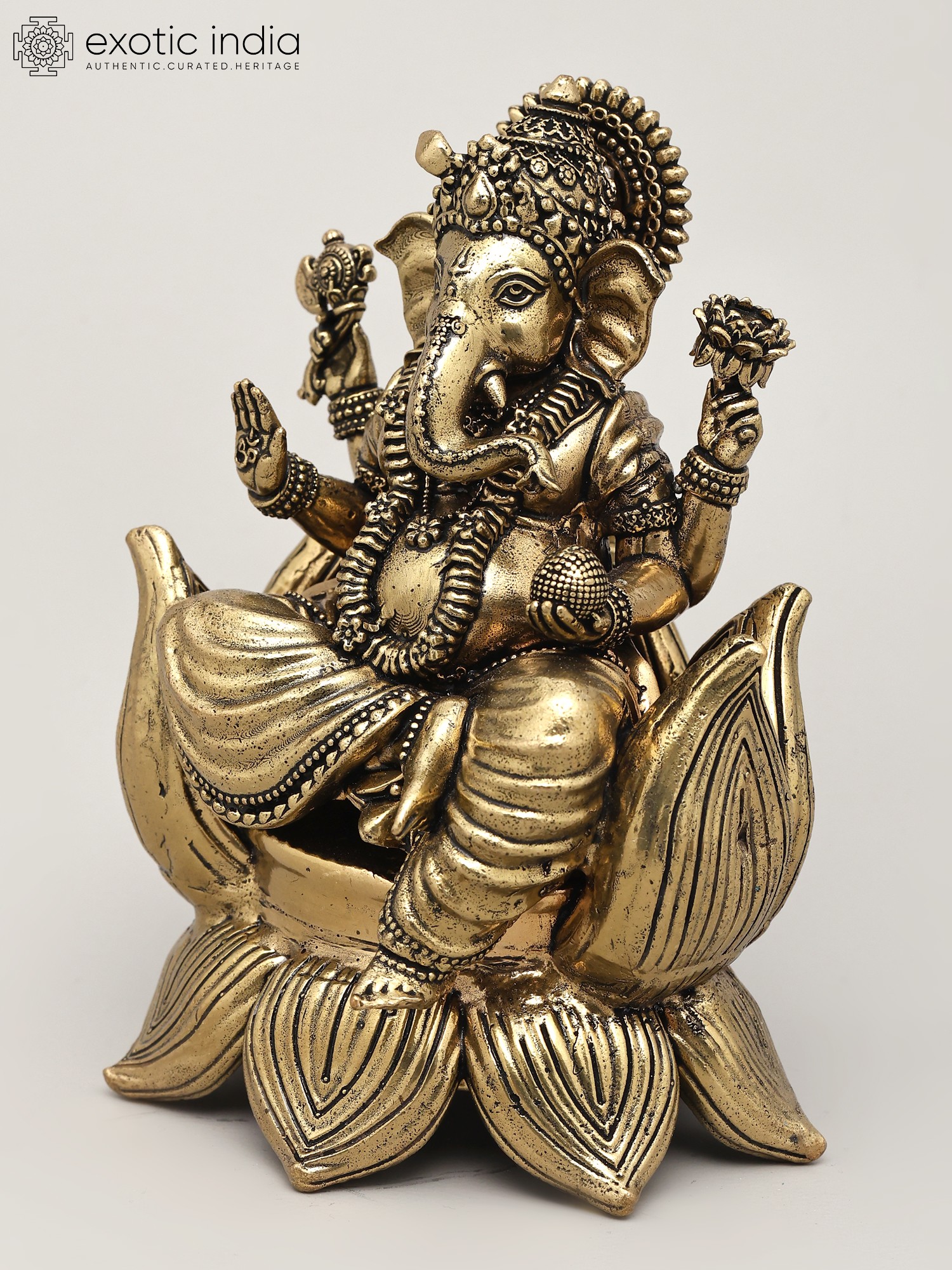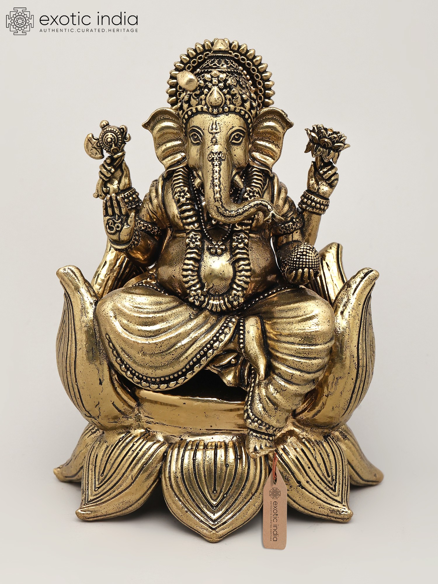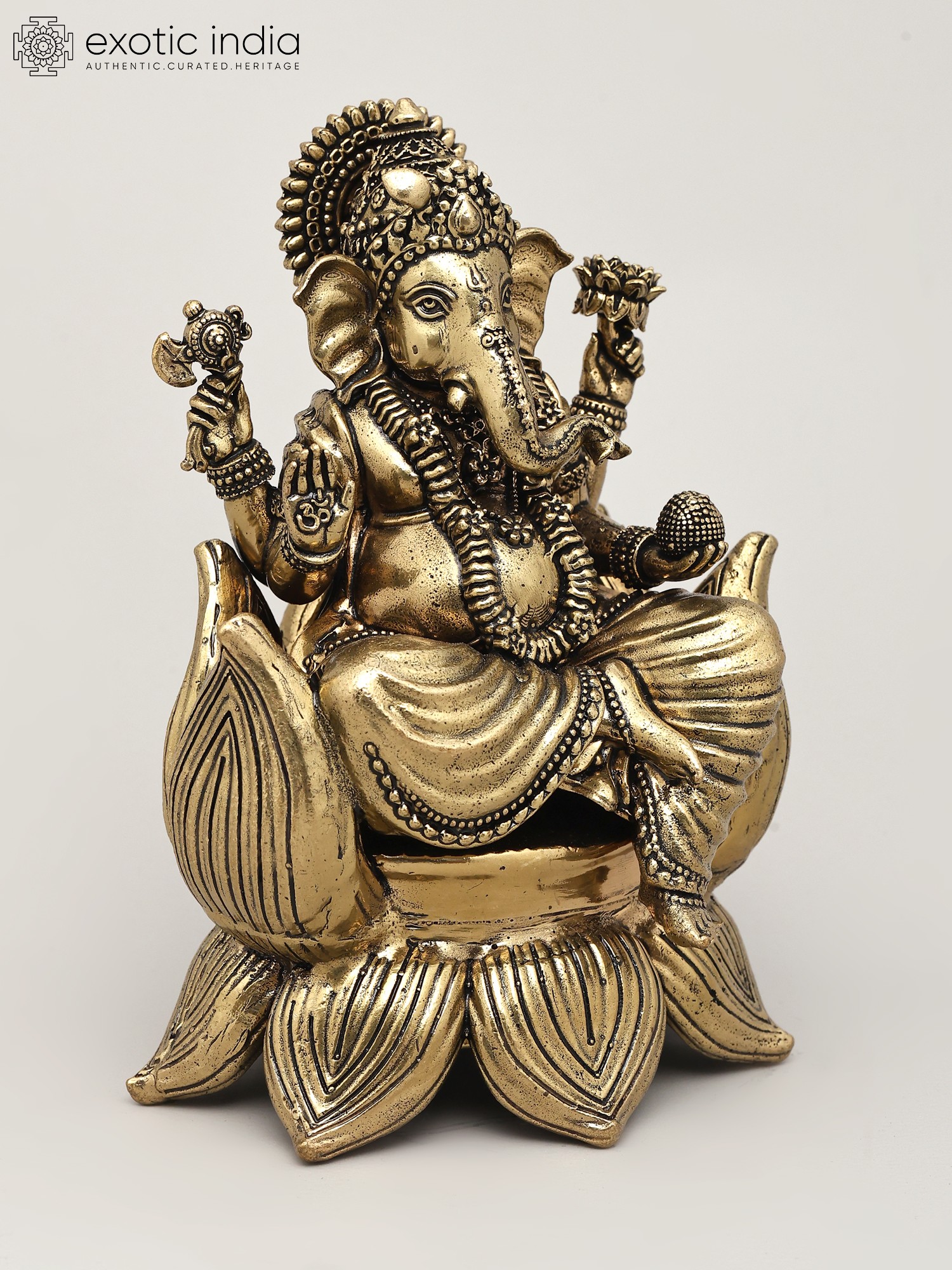 Invite the divine presence of Lord Ganesha, the beloved elephant-headed deity, into your home or sacred space with this exquisite brass statue. Ganesha, revered as the god of beginnings, wisdom, intellect, and the remover of obstacles, is depicted in a posture of profound peace and authority. This meticulously crafted representation showcases him seated upon a fully bloomed lotus, a symbol of purity, enlightenment, and spiritual growth. The intricate detailing of the lotus petals forms a majestic throne, elevating the divine figure and enhancing the aura of his auspicious presence.
