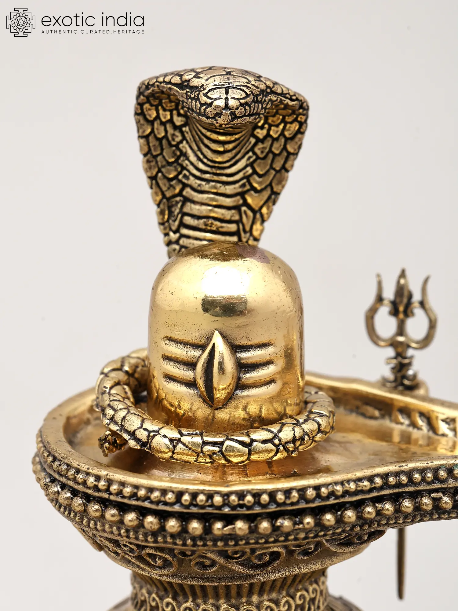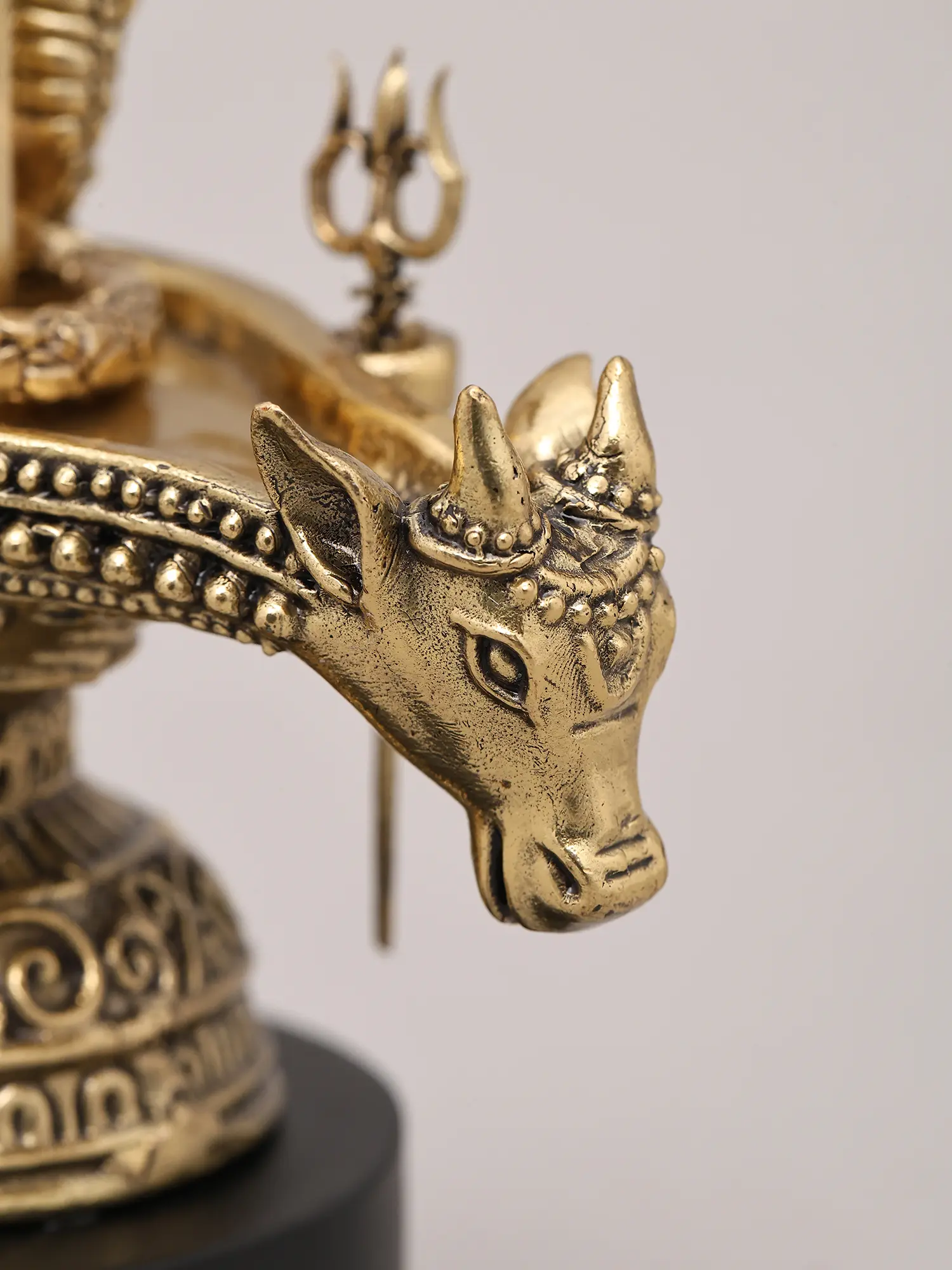 This exquisite brass statue captures the multifaceted essence of Lord Shiva, one of the most revered deities in Hinduism. The central element is the Shiva Lingam, a powerful aniconic representation symbolizing the formless, omnipresent, and infinite nature of the Supreme Being. Its smooth, polished form signifies creation, preservation, and destruction, the cyclical dance of the universe governed by Shiva's cosmic energy. The single droplet-like mark adorning the Lingam further accentuates its purity and divine presence, representing the 'bindu' or the primal source from which all existence emanates.