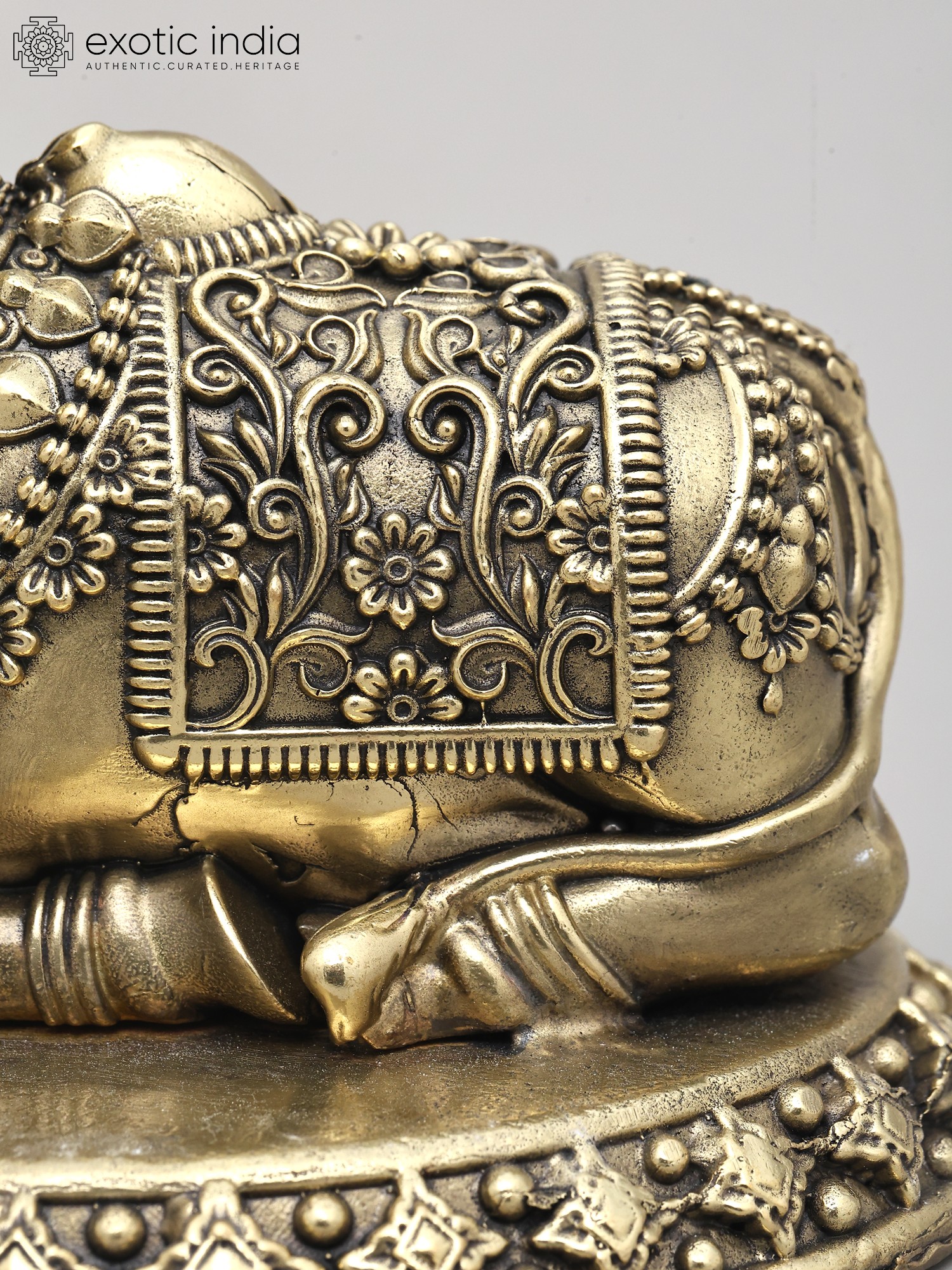 Superfine Seated Nandi Idol - The Vahana of Shiva with Intricate Carving and Wood Base | Brass Statue
