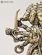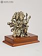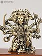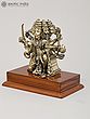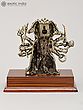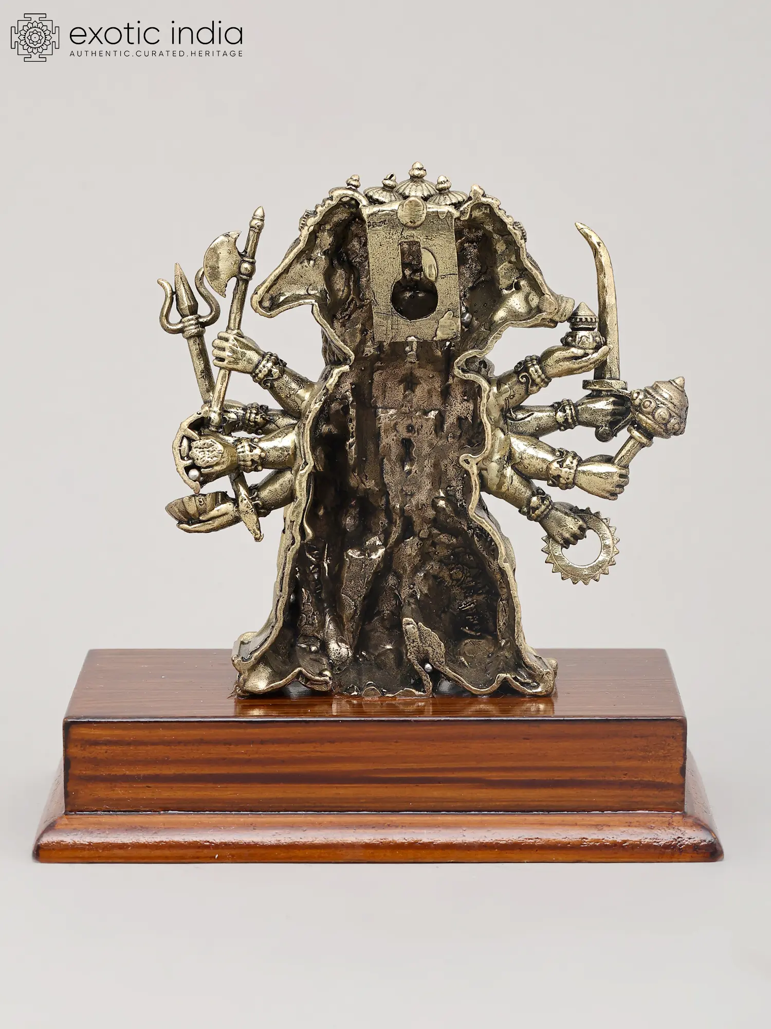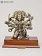 Crafted with meticulous attention to detail, this superfine brass statue showcases the artistry of traditional Indian metalwork. The brass material, known for its resilience and luminous sheen, lends a sense of permanence and sacredness to the depiction. Hanuman is shown in a seated posture, a symbol of his serene control and grounding power, atop a polished wooden base that adds stability and an elegant contrast to the metallic form. The deity's multiple hands are adorned with various potent weapons and symbols, each holding profound meaning. These may include the thunderbolt (Vajra) for strength, the sword for valor, the discus (Chakra) for cosmic order, the trident (Trishul) for Shiva's power, and a bowl or pot, perhaps signifying abundance or the capture of negative energies. His powerful physique and intense gaze convey his readiness to protect and vanquish any malevolent forces. The intricate ornamentation, from the divine garlands to the elaborate crowns adorning each face, speaks to the rich iconography associated with this powerful deity.