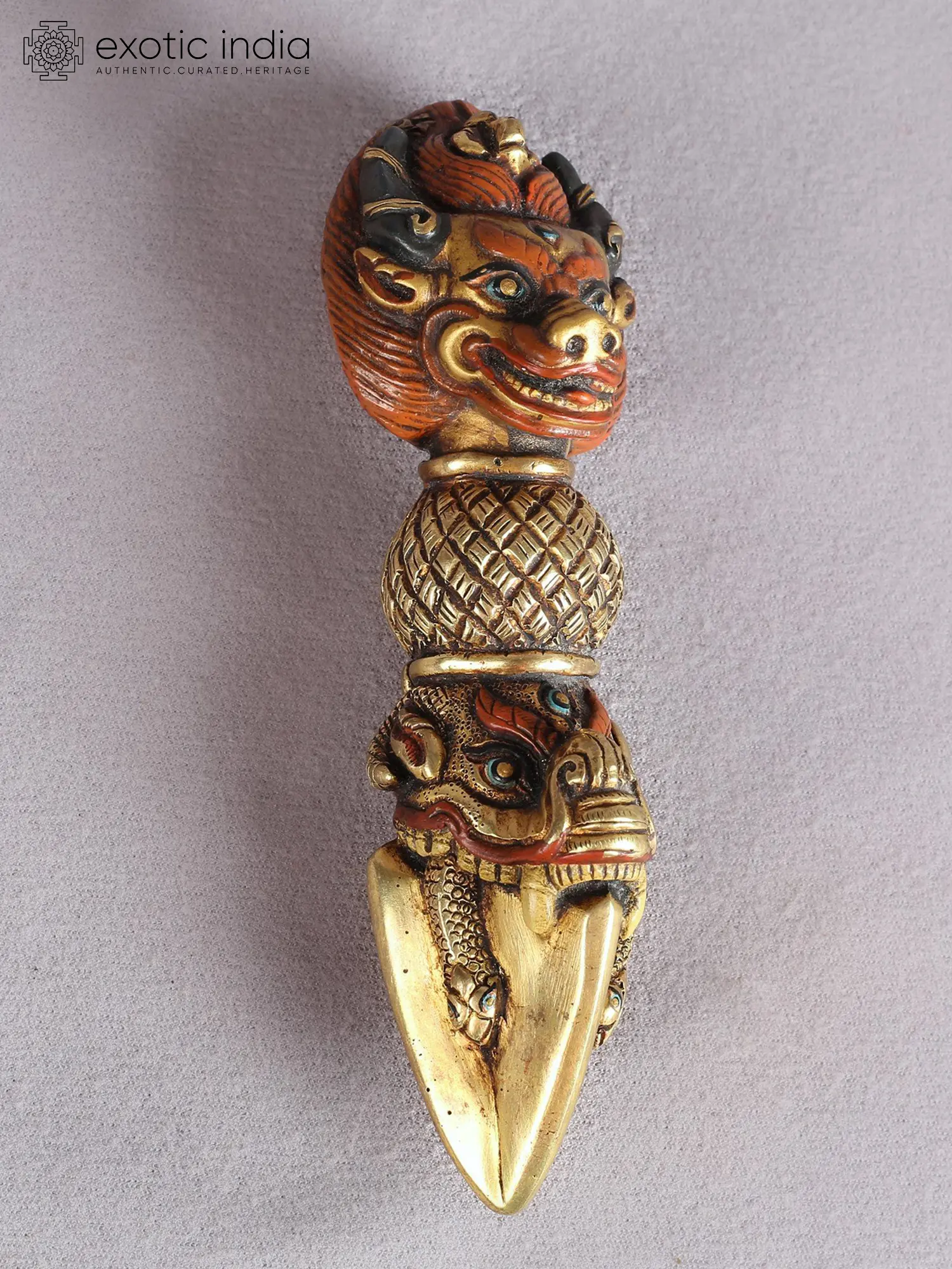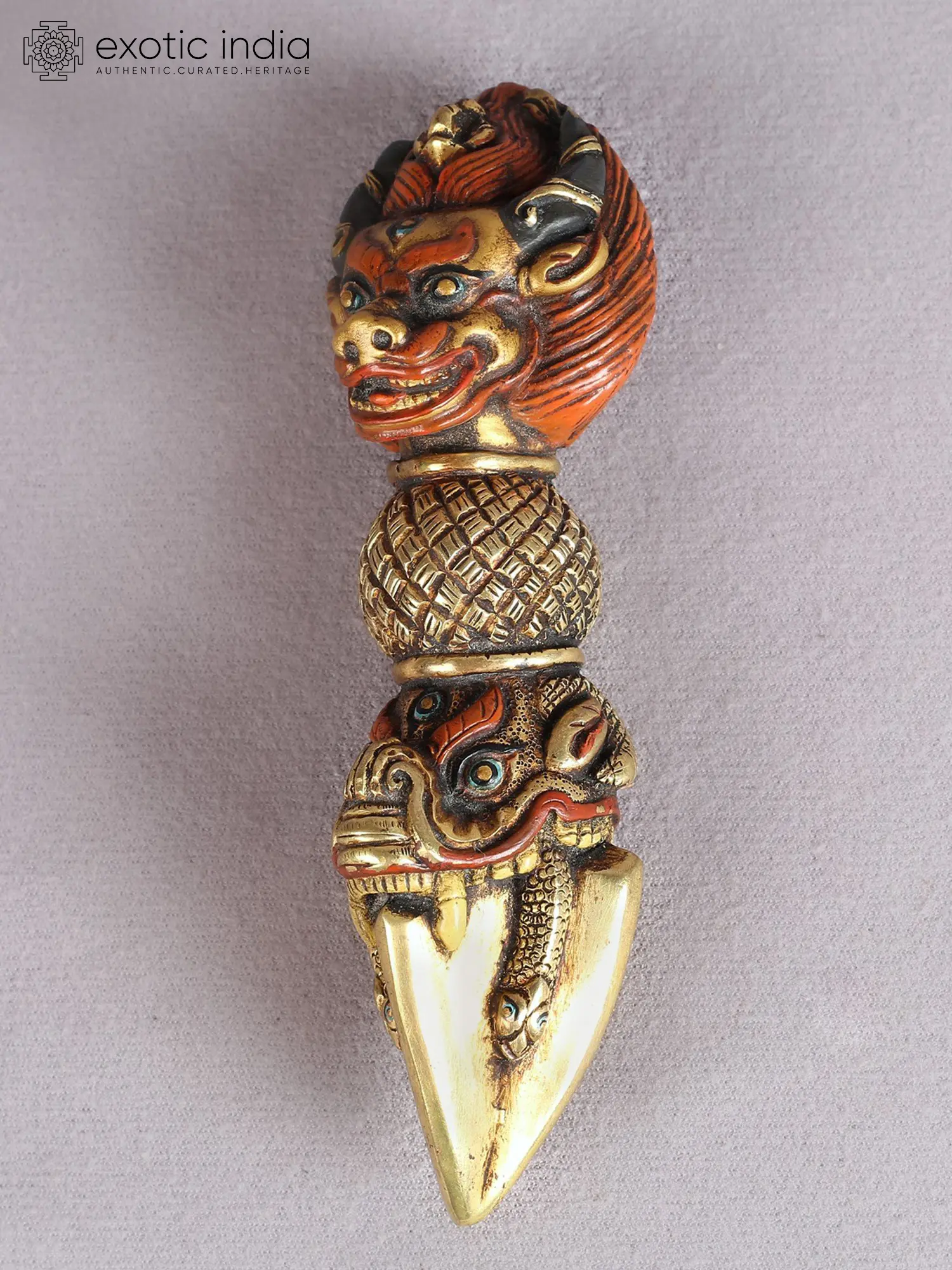 The handle of the Phurba has the image of a snow lion with a third eye, who roars softly, representing the powers of a truly enlightened individual. Serpents and other creatures of Buddhist cosmology wrap the blade, infusing them with their mystical powers, making it a potent instrument for any practitioner of Tantric Buddhism.