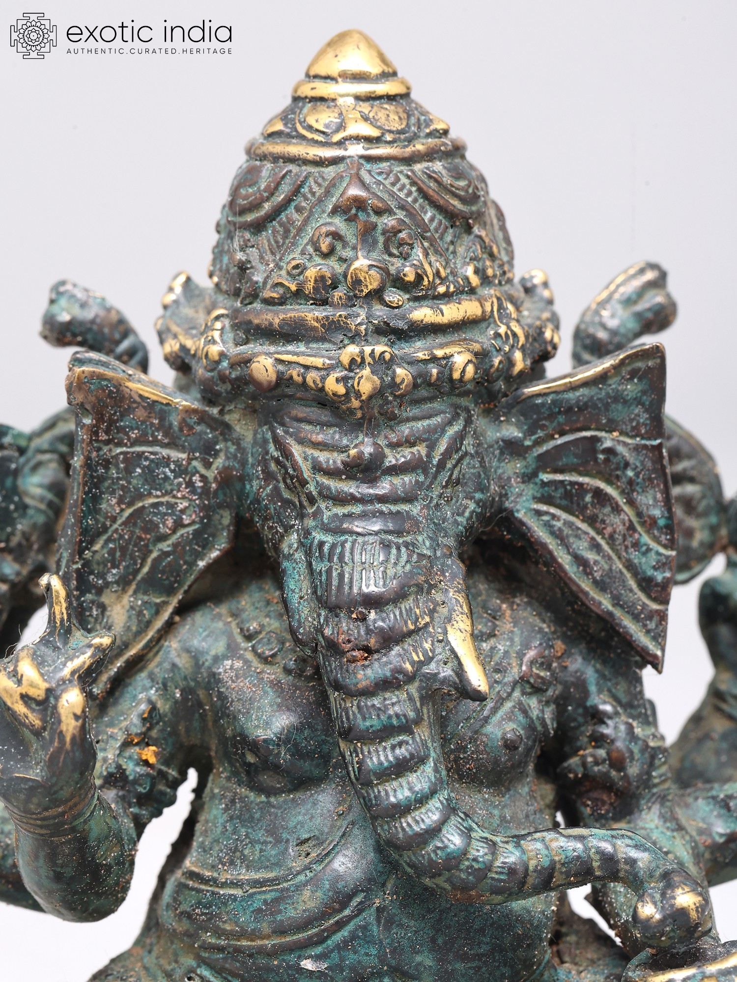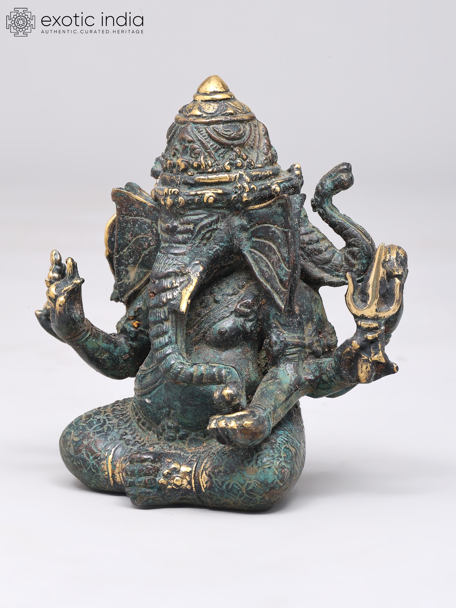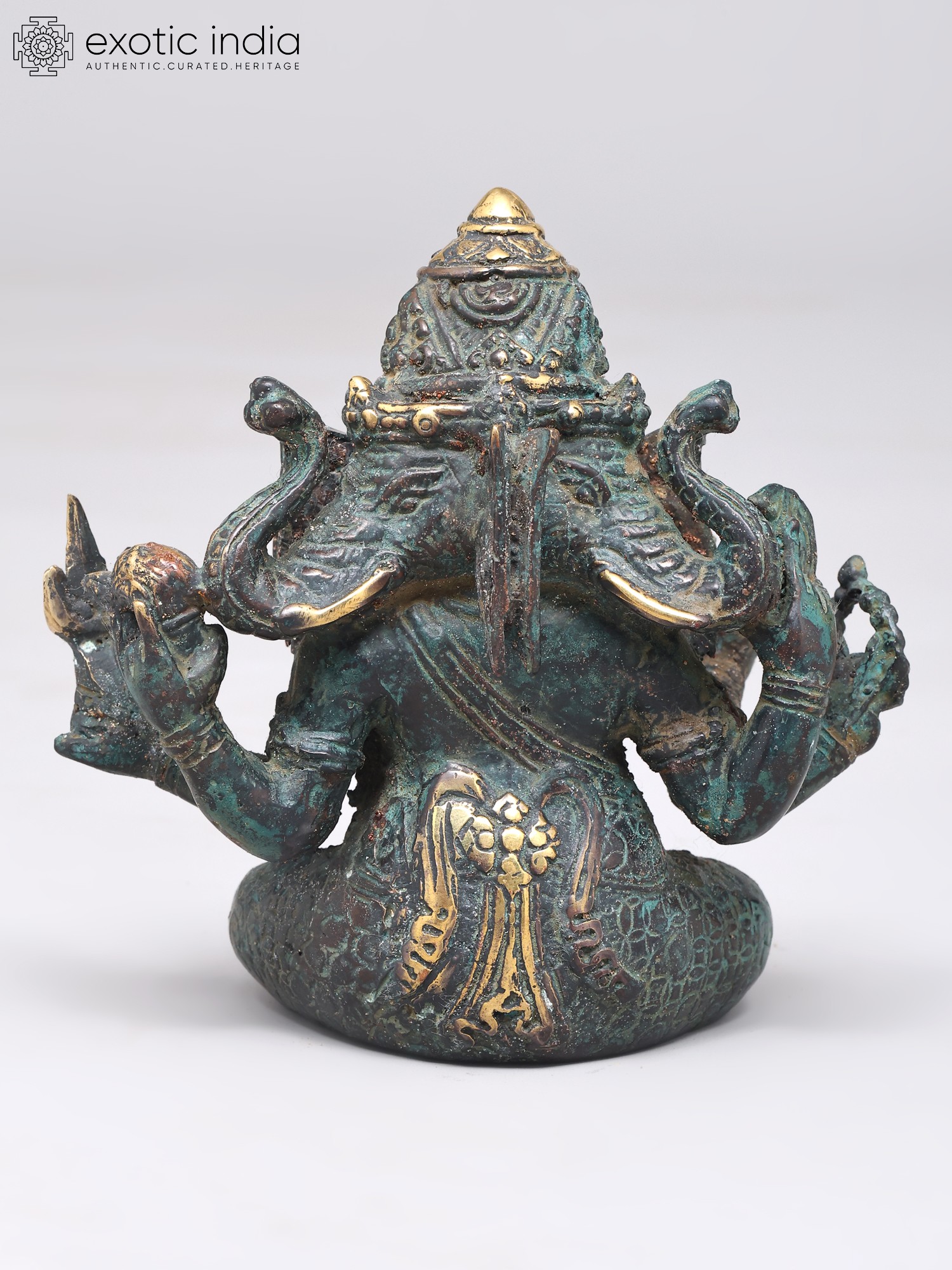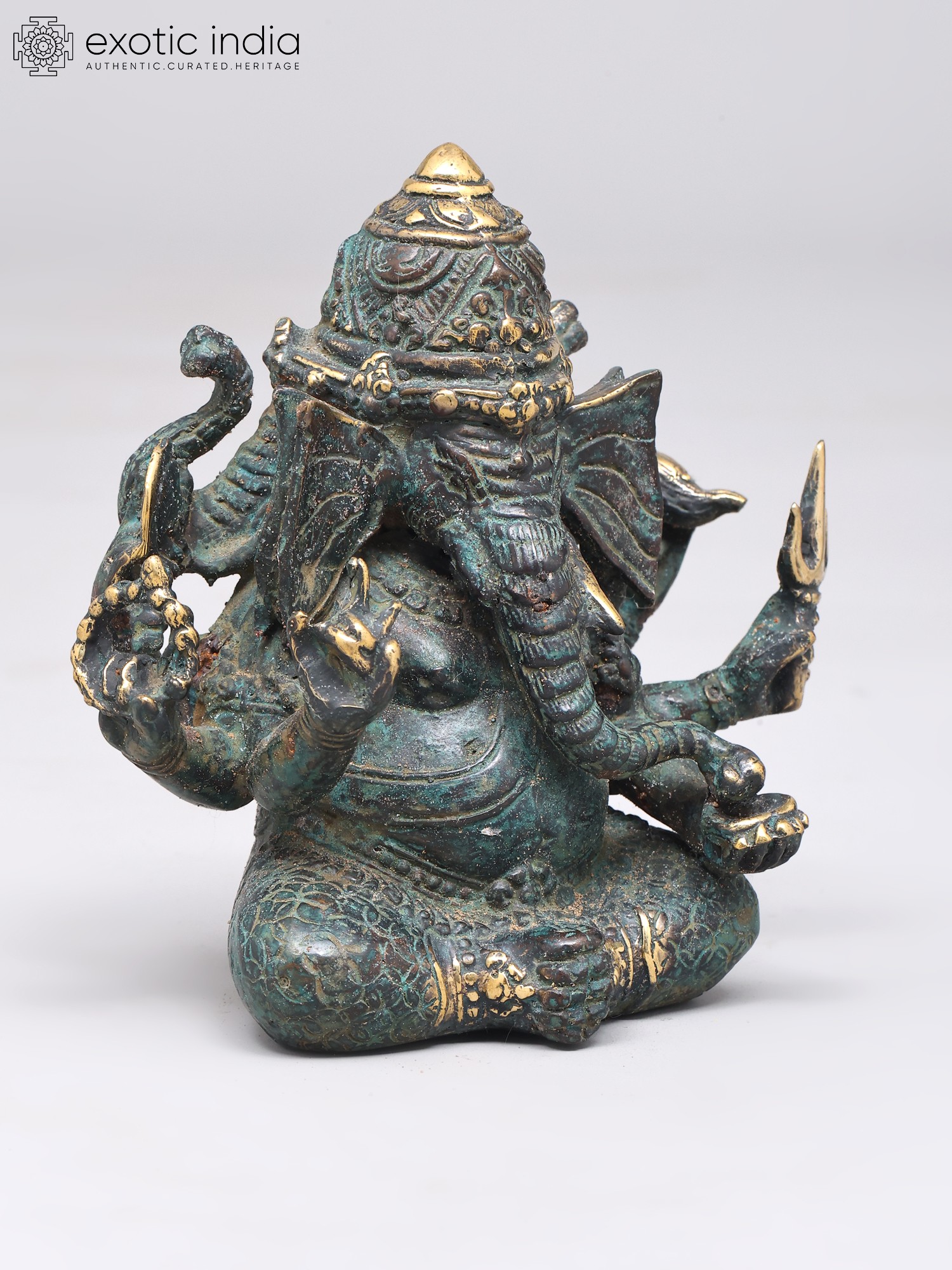 7" Superfine Chaturbhuja Lord Ganapati Seated on Lotus with Wood Base | Brass Sculpture