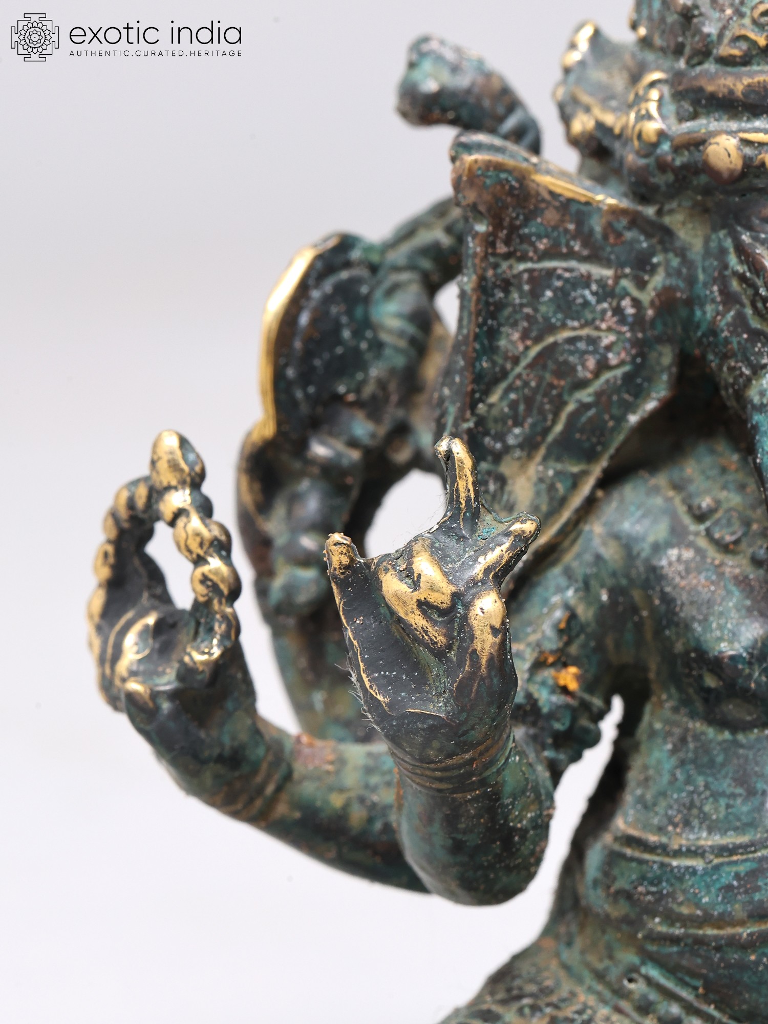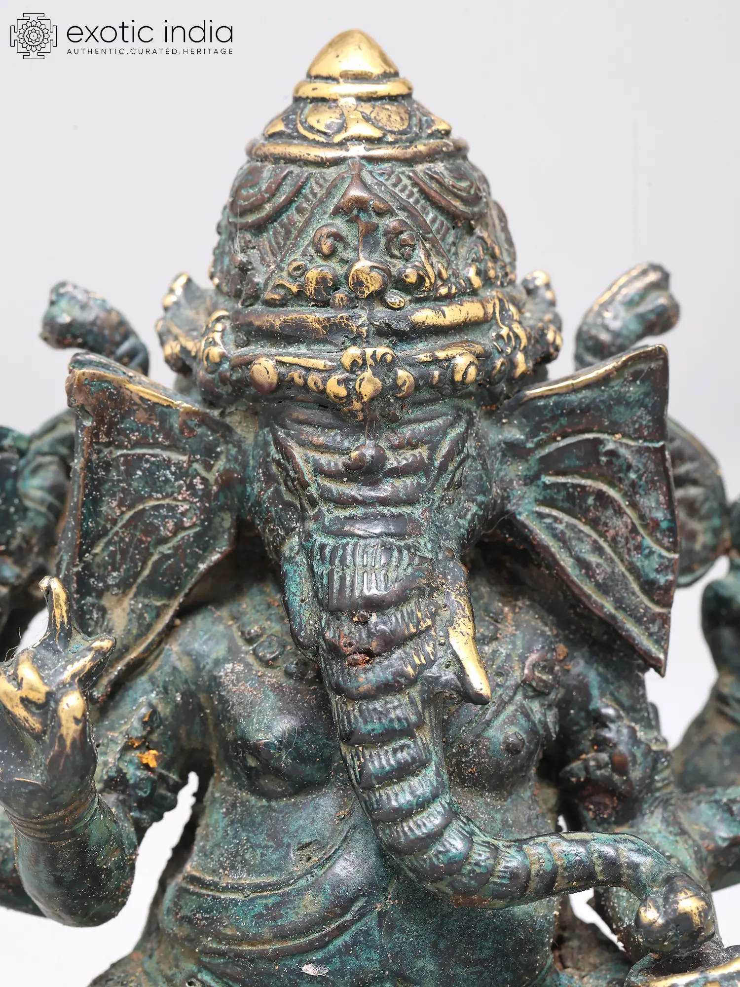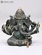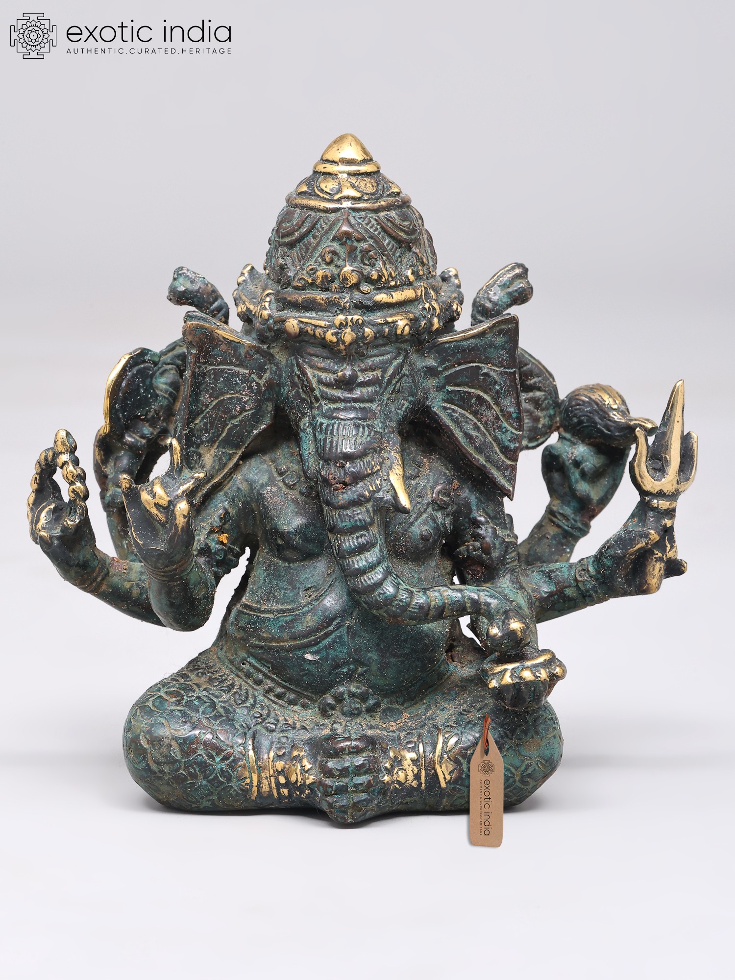 7" Superfine Chaturbhuja Lord Ganapati Seated on Lotus with Wood Base | Brass Sculpture