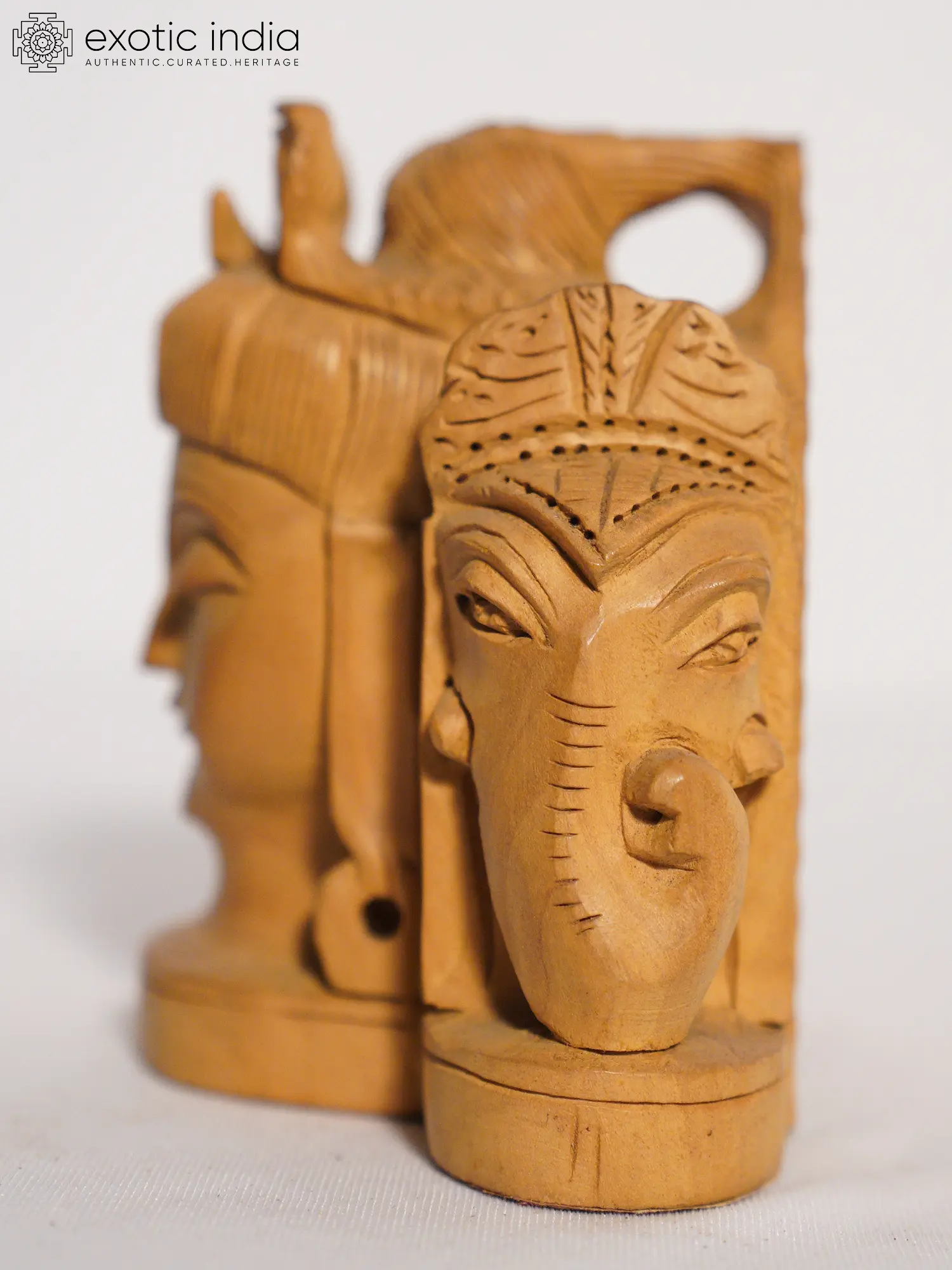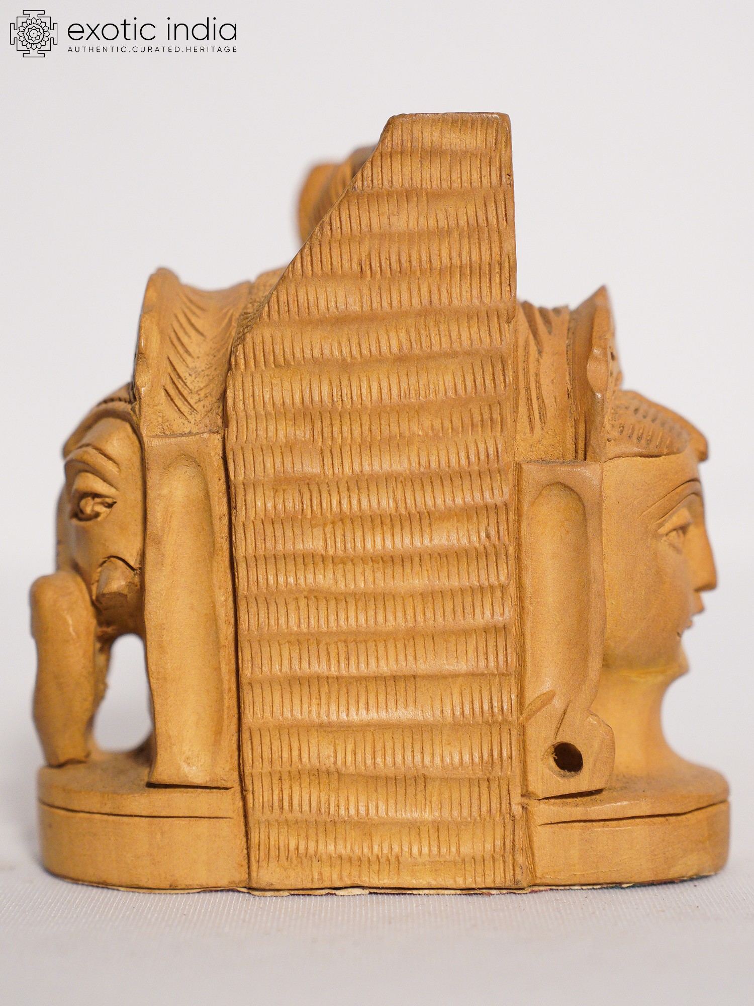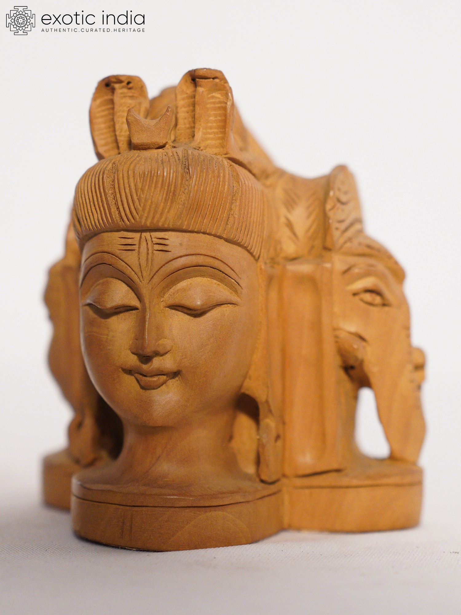 This intricately hand-carved rosewood sculpture unites three prominent figures from the Hindu pantheon: Lord Shiva, Ganesha, and Kartikeya. The warm, natural tones of the wood lend a sense of earthiness and serenity to the depiction, highlighting the fine craftsmanship that brings each deity to life. A skilled artisan has meticulously detailed each face, expressing the unique characteristics and divine essence of these revered beings. Shiva, the destroyer and transformer, takes center stage. His serene, meditative face reflects his role as the supreme ascetic, the cosmic dancer whose Tandava dance creates and destroys universes. The carefully carved details above his brow hint at the third eye, a symbol of wisdom and the power to annihilate negativity.