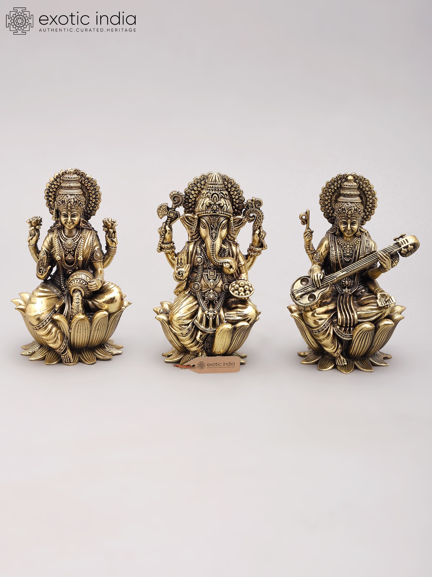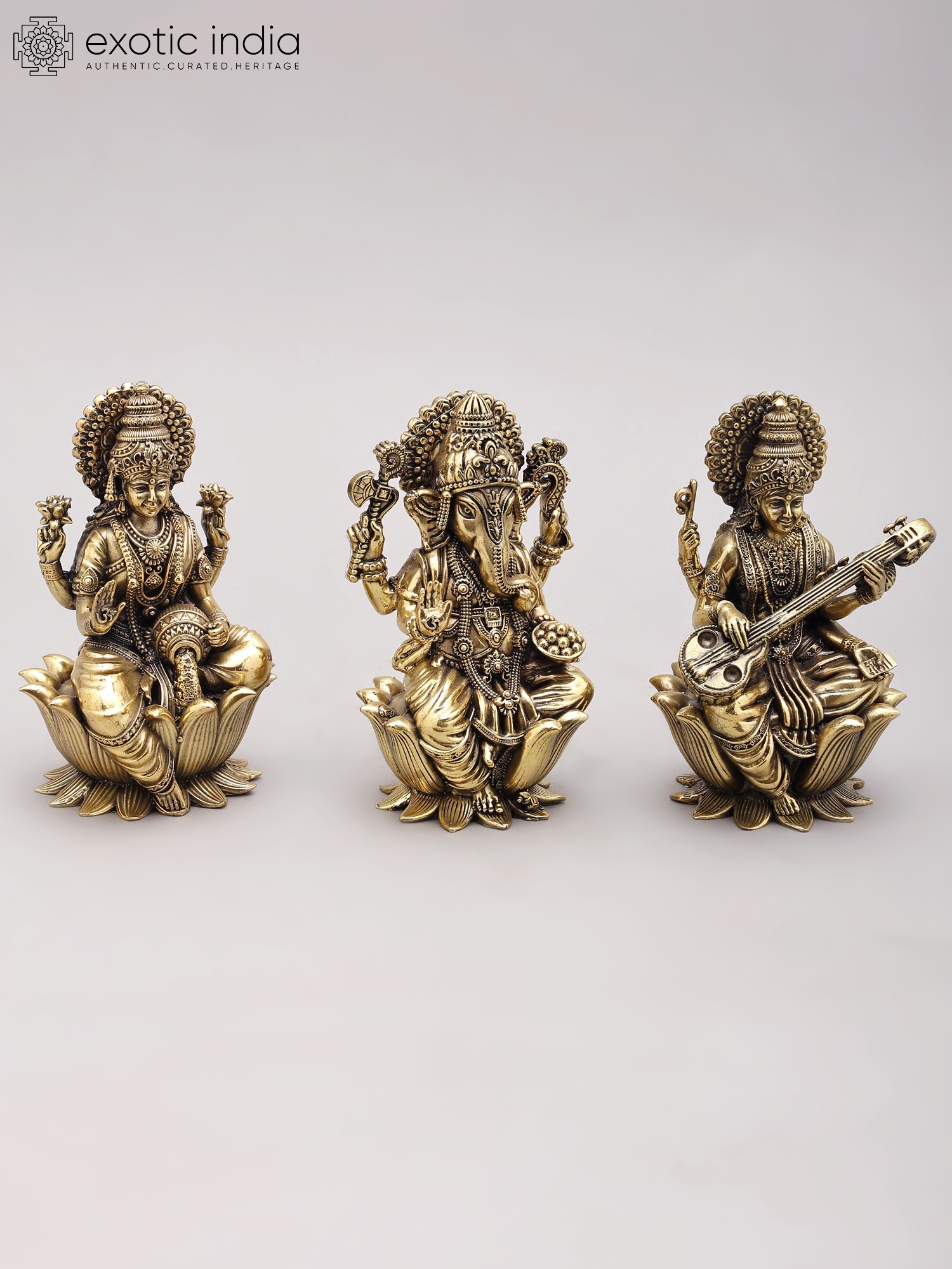 5" Superfine Brass Trio of Ganesha, Lakshmi, and Saraswati Statues
