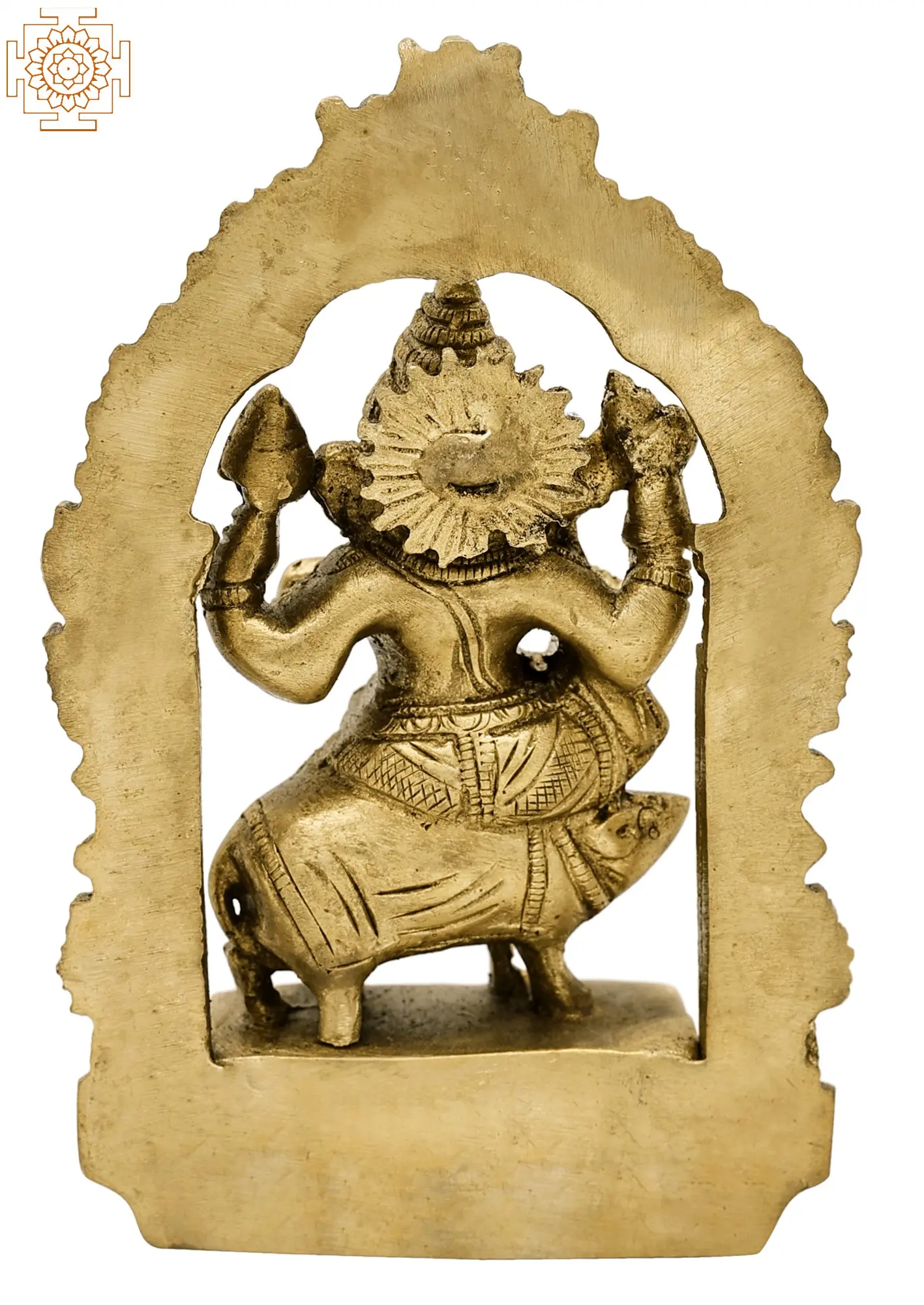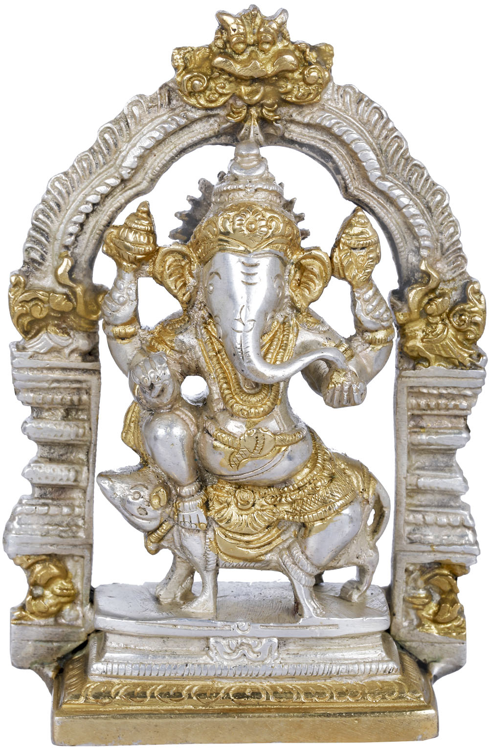 In this sacred brass portrayal, Lord Ganesha sits gracefully upon Mushaka, embodying divine wisdom and intellect. He is carrying a goad and a noose, symbolizing his power to lead seekers on the righteous path. The broken tusk is a tribute to his humility and sacrifice in recording the Mahabharata. Encircled by the Kirtimukha throne, Ganesha’s presence exudes protection and blessings. The serpent around his belly is associated with divine energy (Kundalini), signifies Ego, which Ganesha subdues, highlighting his wisdom in controlling one’s desires and emotions. This divine temple Ganesha is a cherished emblem of spirituality and artistry and serves as a powerful reminder of seeking blessings and guidance on life’s journey.