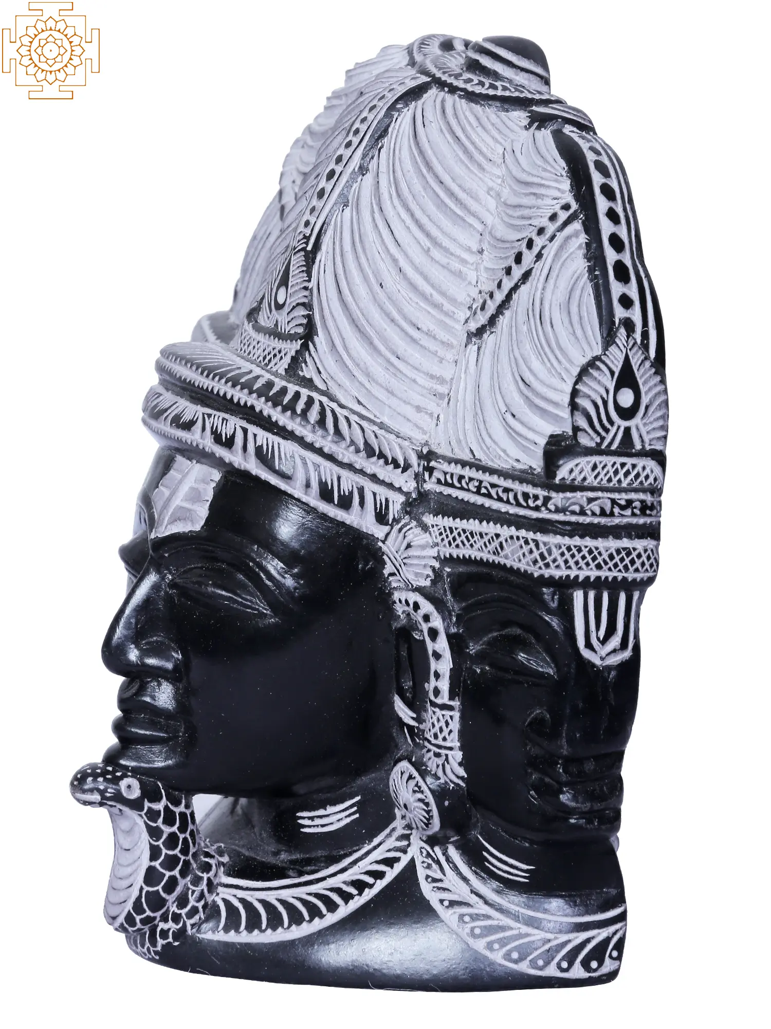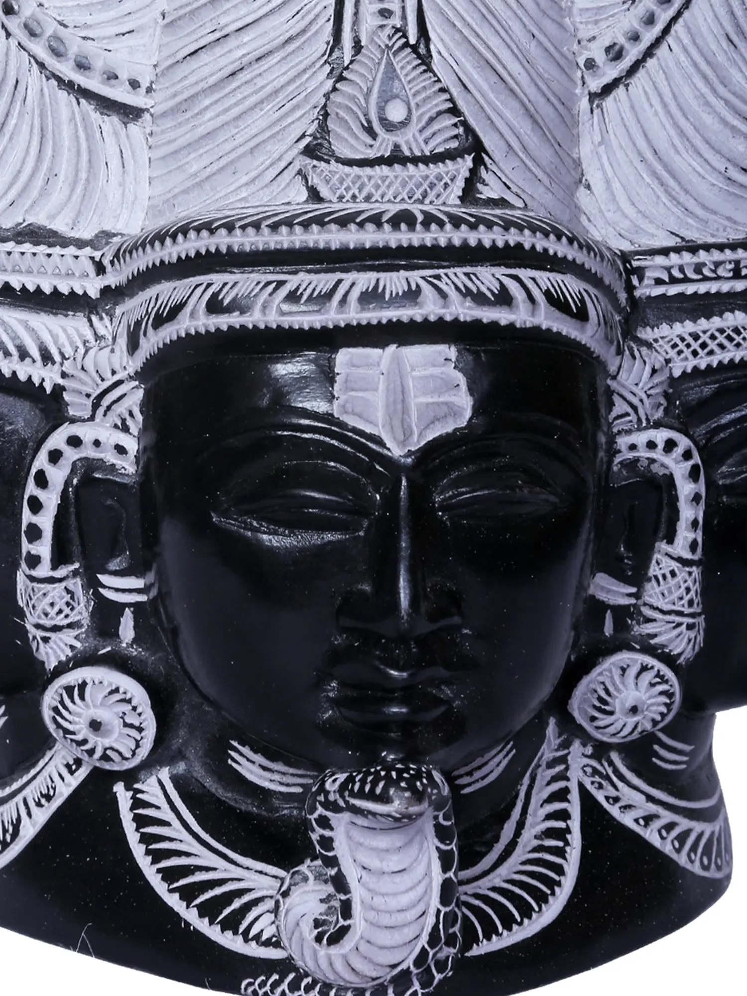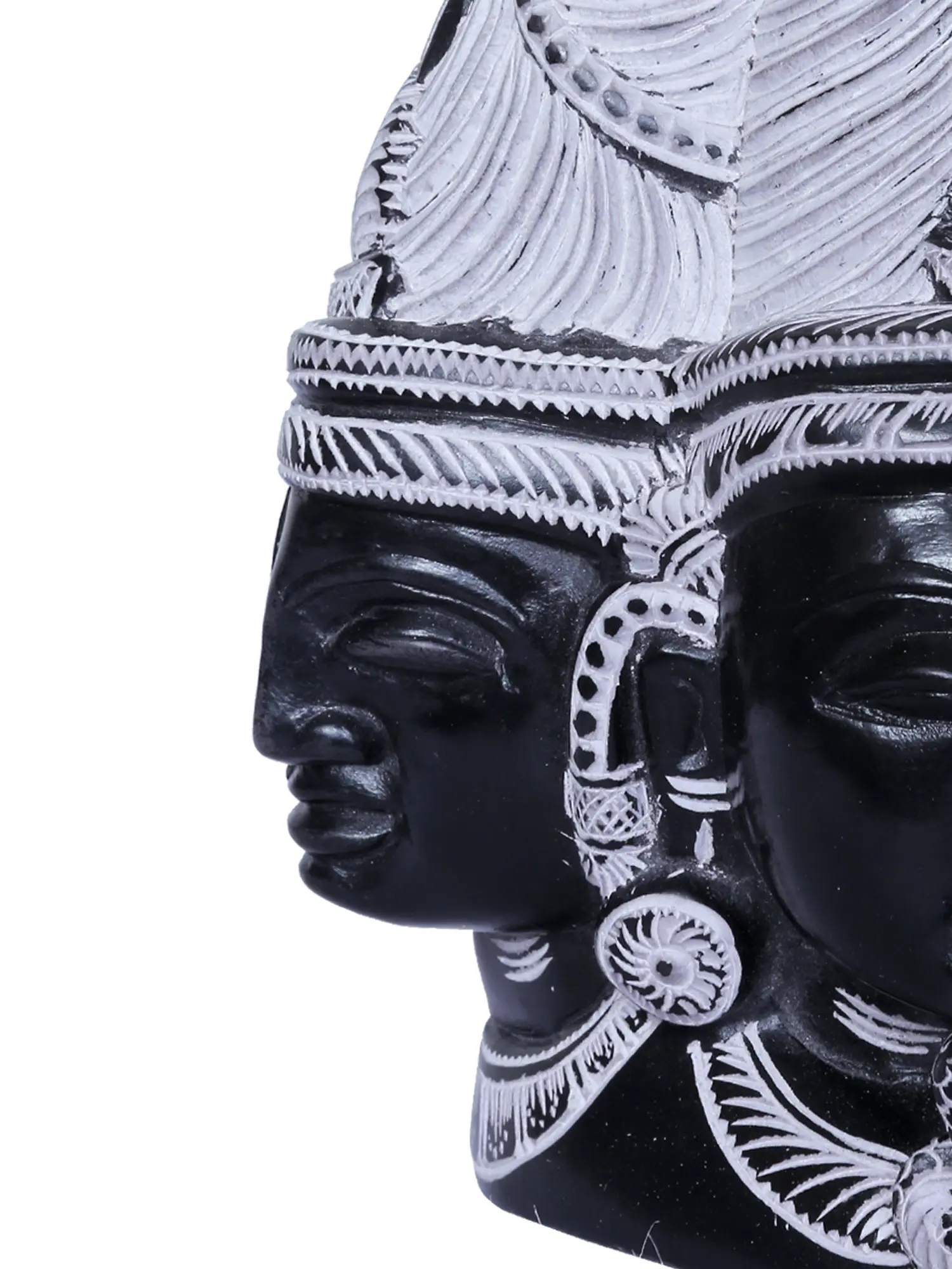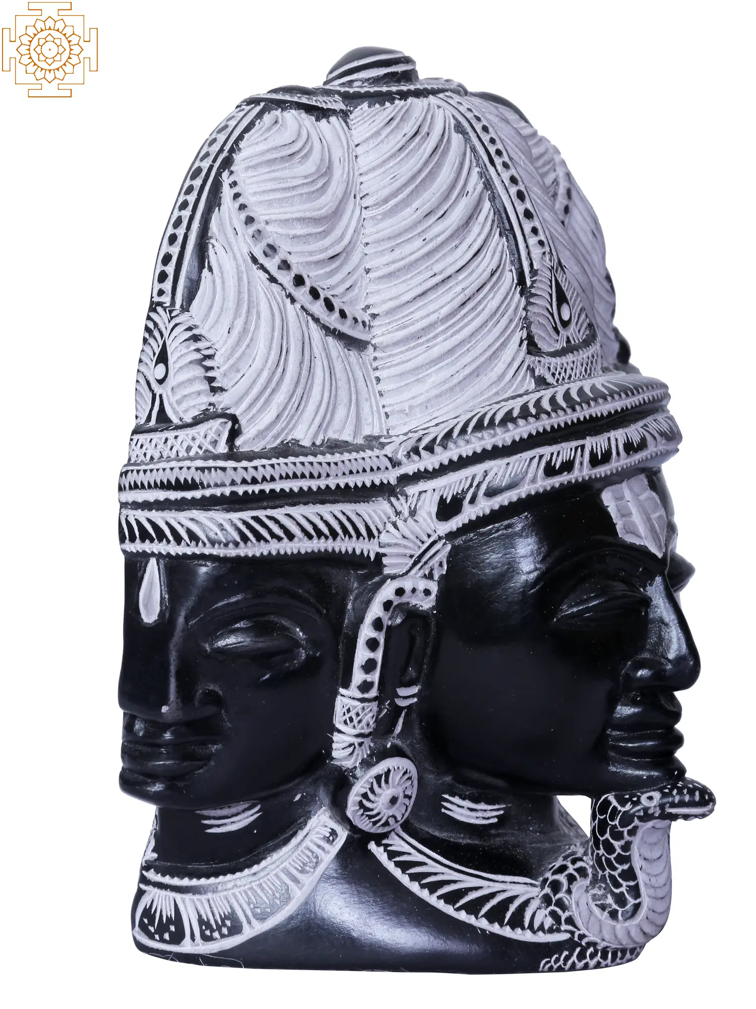 Hailing from the historic city of Mahabalipuram in South India, a UNESCO World Heritage site renowned for its ancient rock-cut temples and sculptures, this piece is a testament to centuries of artistic tradition. The artisans of this region are masters of stone carving, passed down through generations. Each detail, from the intricate headdresses to the subtle expression on each face, is meticulously chiseled into the stone, bringing forth a divine aura. The contrast between the deep, polished black stone and the delicately painted white accents highlights the craftsmanship and brings the divine visage to life, making it a truly captivating work of art.
