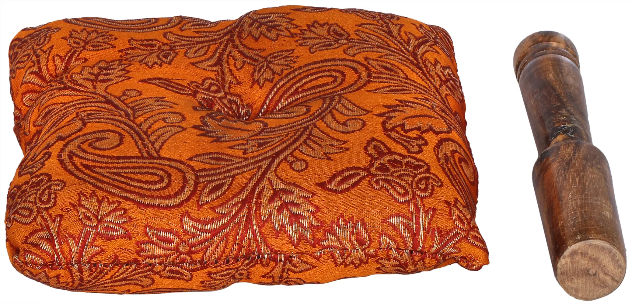 This particular singing bowl is a testament to the artistry and dedication of its makers. Each bowl is meticulously handcrafted, ensuring its unique character and resonant quality. The warm, golden hue of the bronze speaks of its quality and the care taken in its creation. It rests upon a vibrantly colored, intricately patterned cloth cushion, designed not only for aesthetic appeal but also to provide a stable and resonant base for the bowl. The accompanying wooden striker, smooth and comfortable to hold, is perfectly balanced for eliciting the bowl's full sonic potential. The combination of bronze, cloth, and wood creates a tactile and visual harmony that enhances the overall experience.