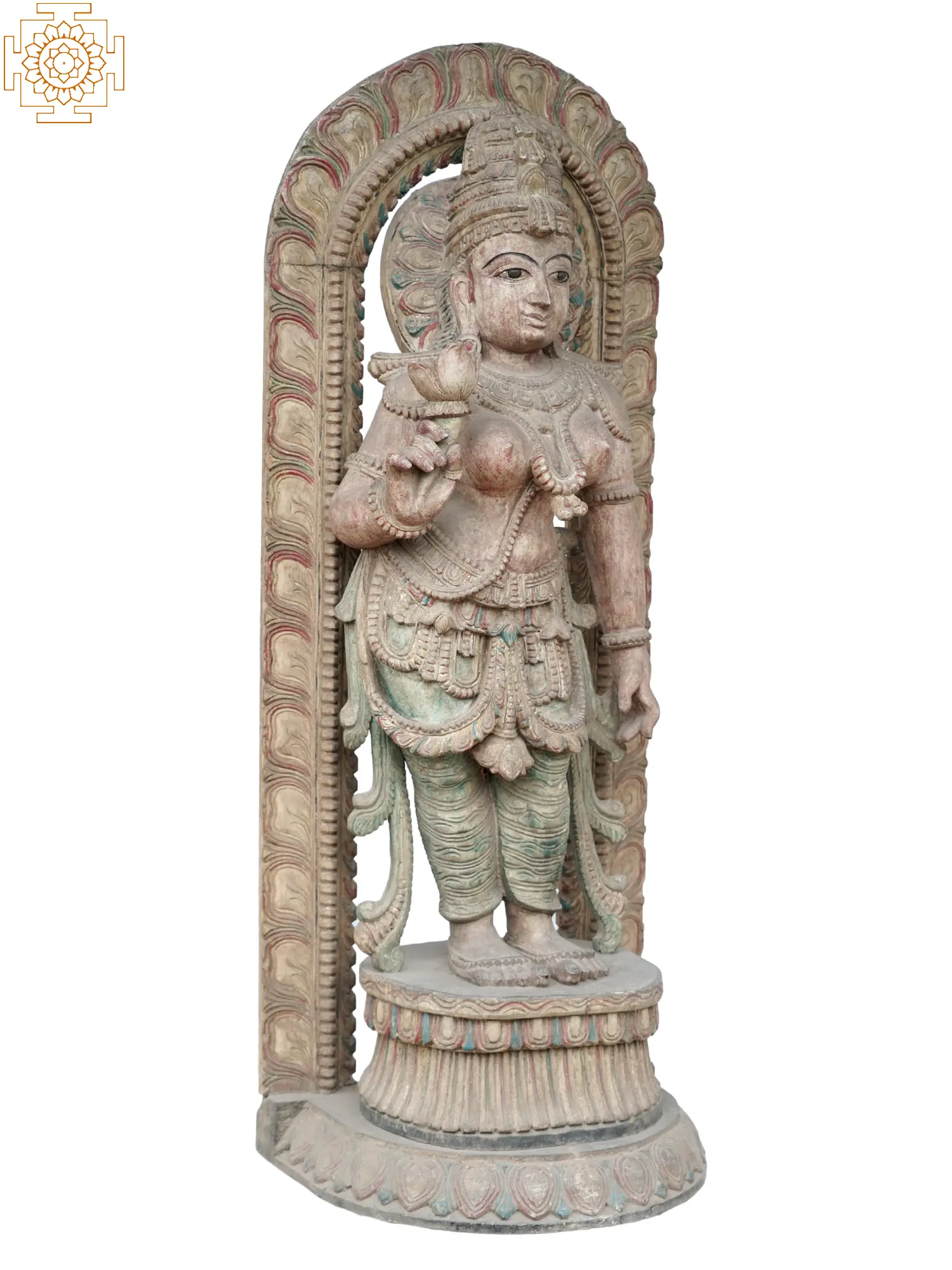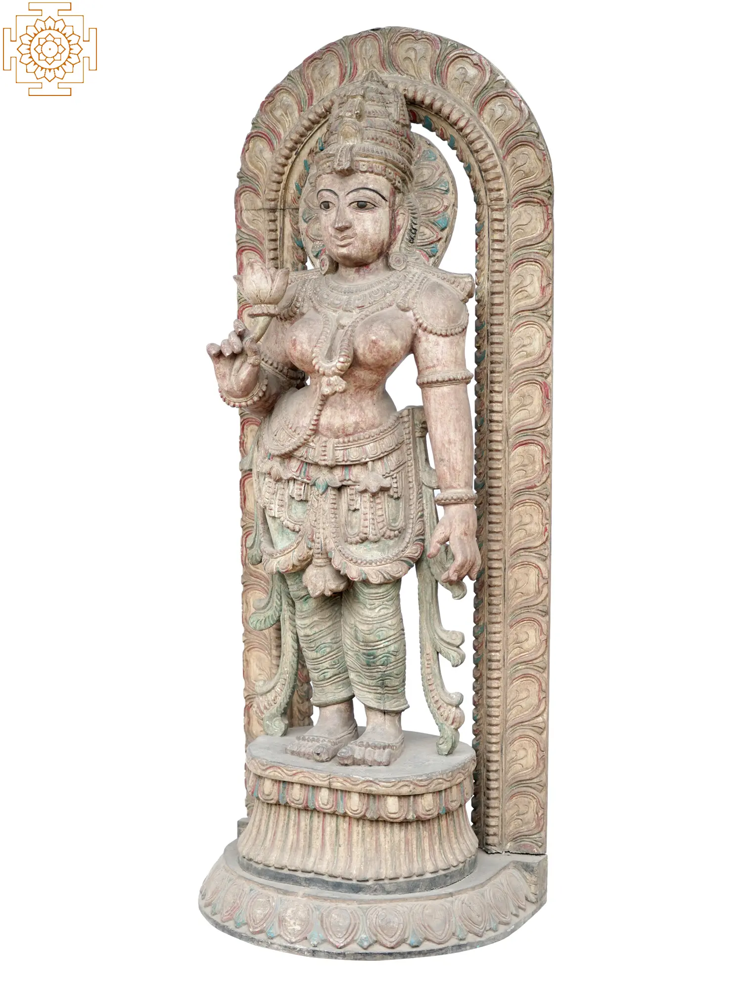 This magnificent standing figure embodies the divine presence of Goddess Lakshmi, the Hindu deity revered as the goddess of wealth, fortune, prosperity, and auspiciousness. Crafted from wood with meticulous attention to detail, this statue stands as a testament to traditional artistry and spiritual devotion. The serene expression on Lakshmi's face, coupled with her graceful posture, radiates an aura of tranquility and abundance. Her form is adorned with intricate jewelry and flowing garments, suggesting her royal status and benevolent nature. In her raised right hand, she delicately holds a lotus, a symbol of purity, beauty, and spiritual awakening, while her left hand is depicted in a gesture of bestowing blessings, offering protection and good fortune.