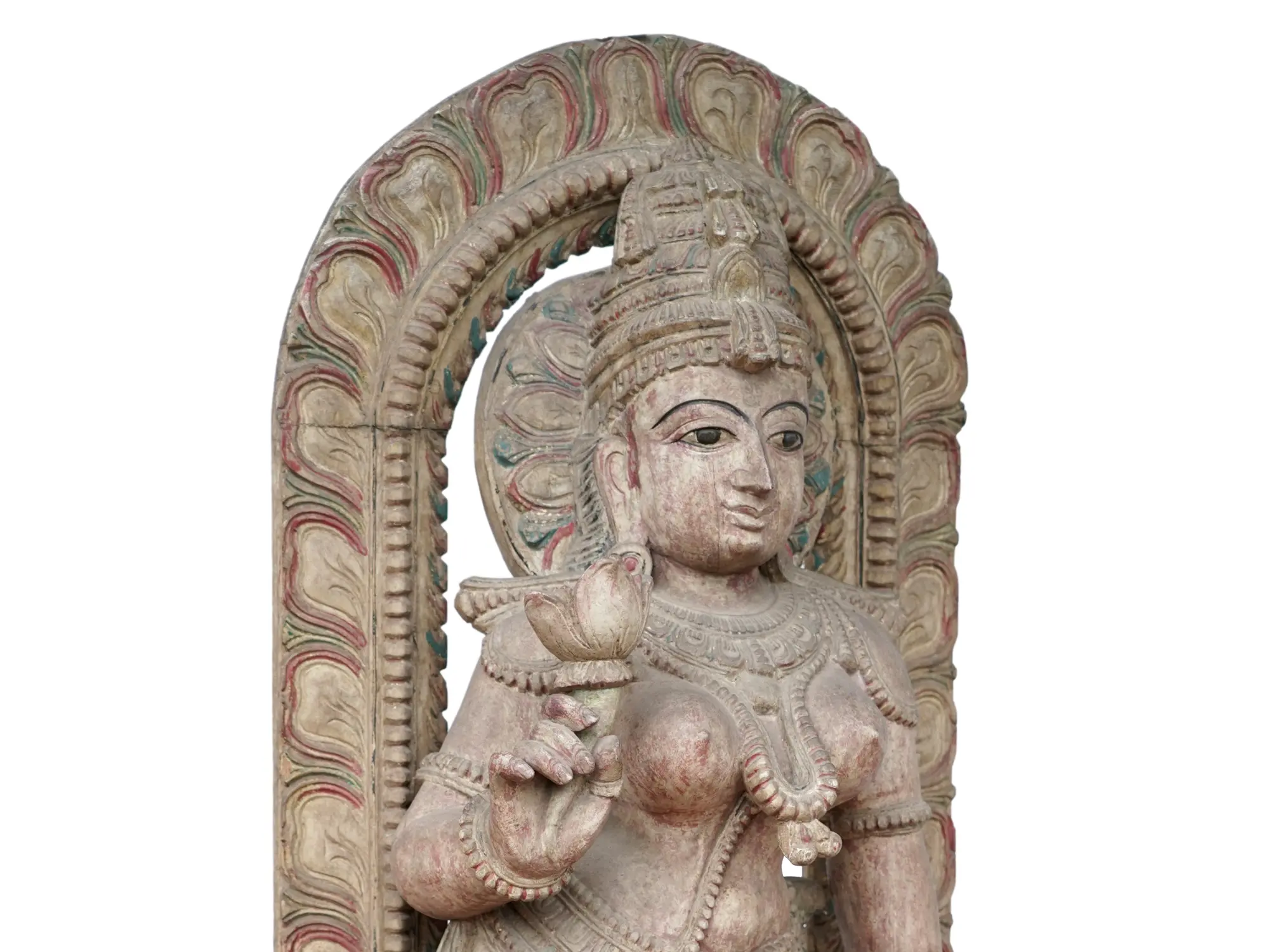 The craftsmanship evident in this piece reflects a deep understanding of both artistic form and devotional symbolism. The wood has been skillfully carved to bring forth the delicate features of the goddess and the rich ornamentation of her attire. The subtle patination of the wood, with hints of faded colors, adds to its antique charm and sense of history. The elaborate architectural frame that surrounds Lakshmi further enhances her divine aura, reminiscent of temple carvings and sacred enclosures. The base upon which she stands, adorned with lotus motifs, grounds the deity and amplifies the symbolism of her divine grace. This statue is not merely an object of art; it is a conduit to the divine, an embodiment of blessings waiting to be invoked. Whether placed in a place of worship, a meditation room, or as a statement piece in your home, this striking representation of Goddess Lakshmi promises to infuse your surroundings with positive energy and a sense of sacred beauty.