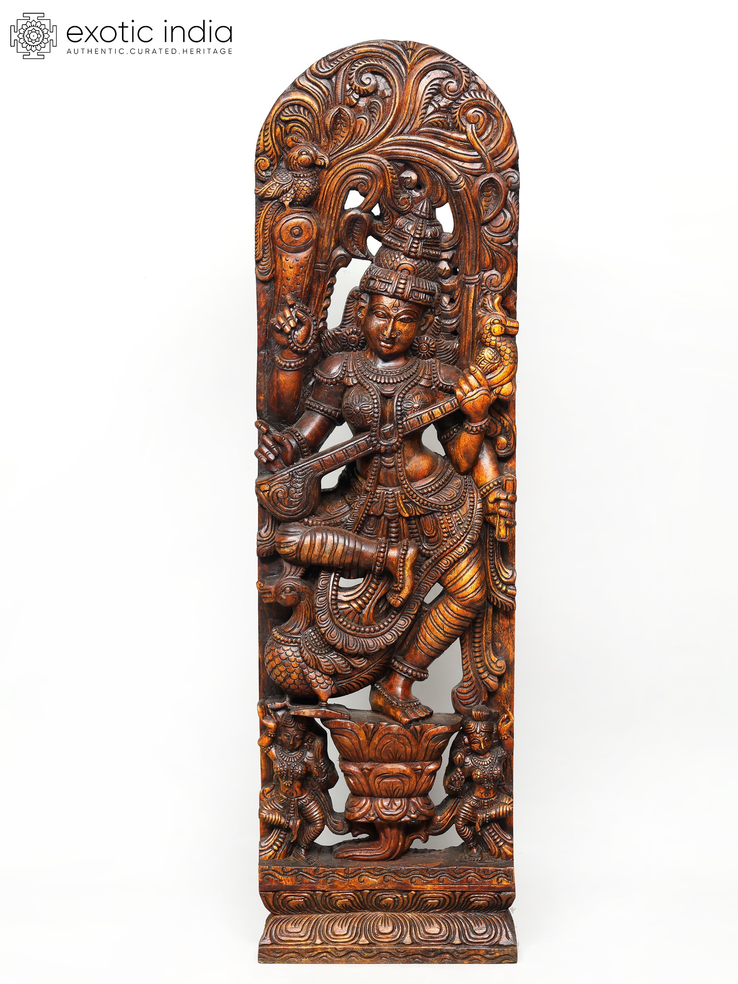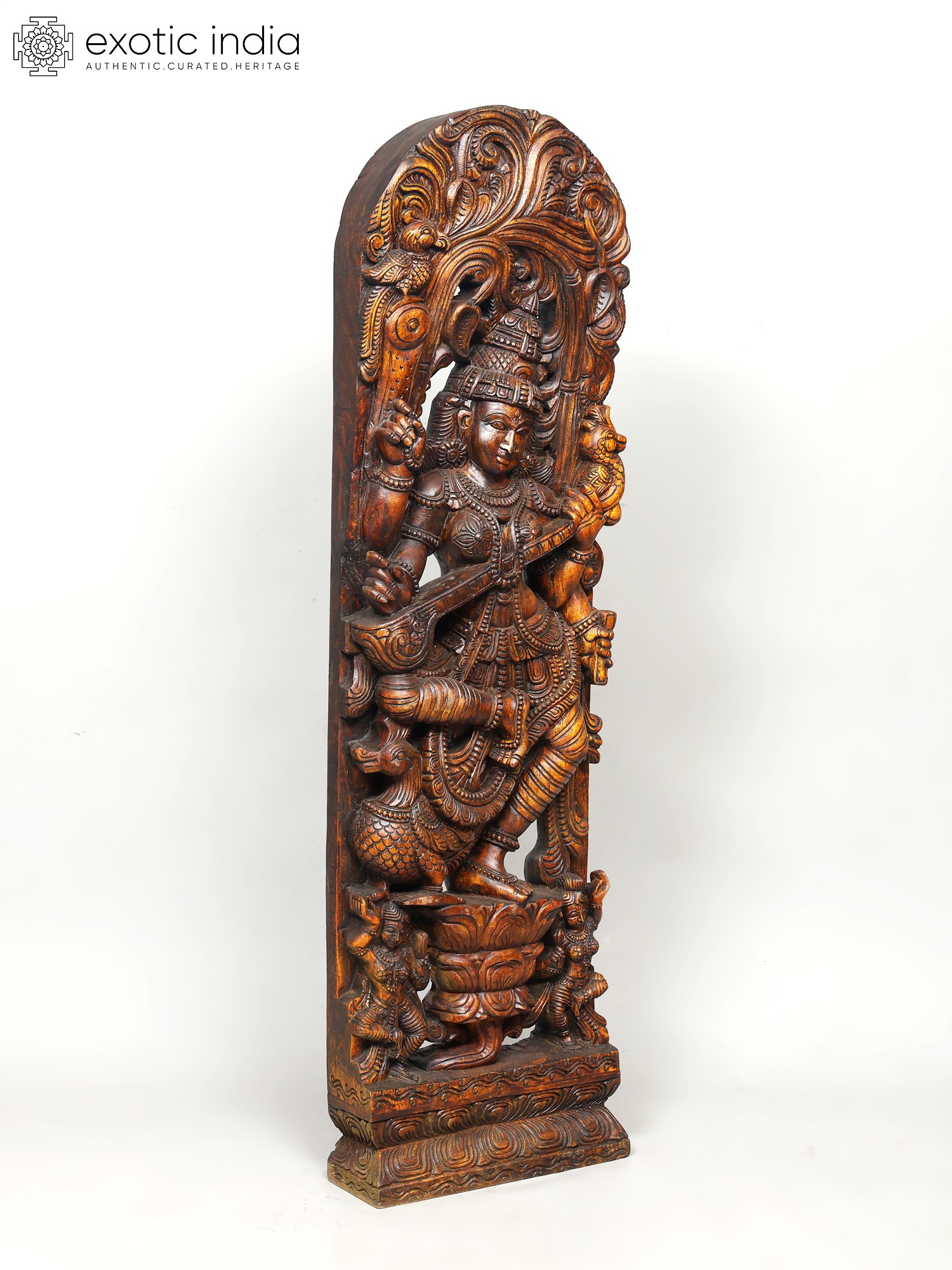 Devi Saraswati Wall Hanging | Wood Carved Kavadi Panel