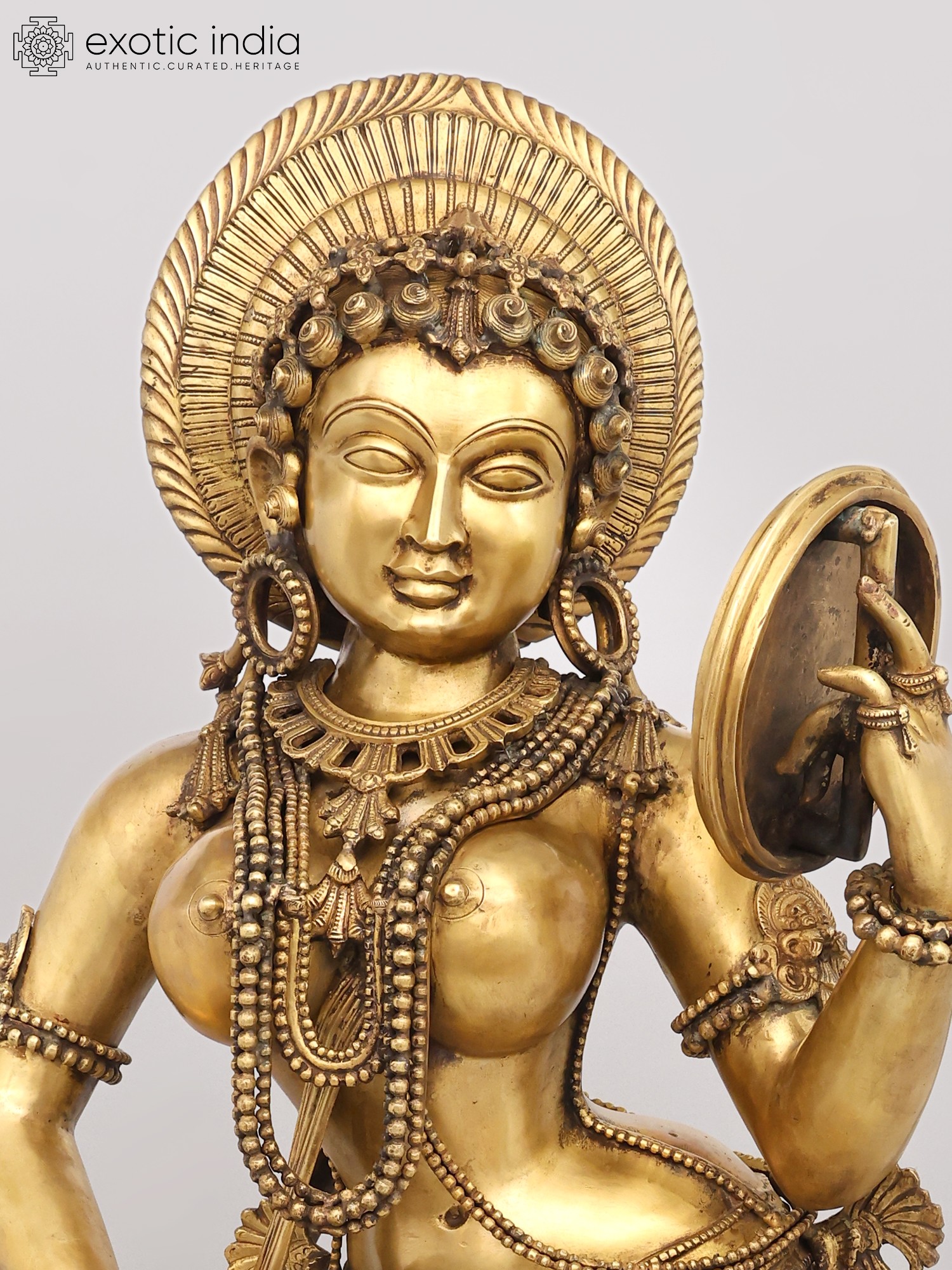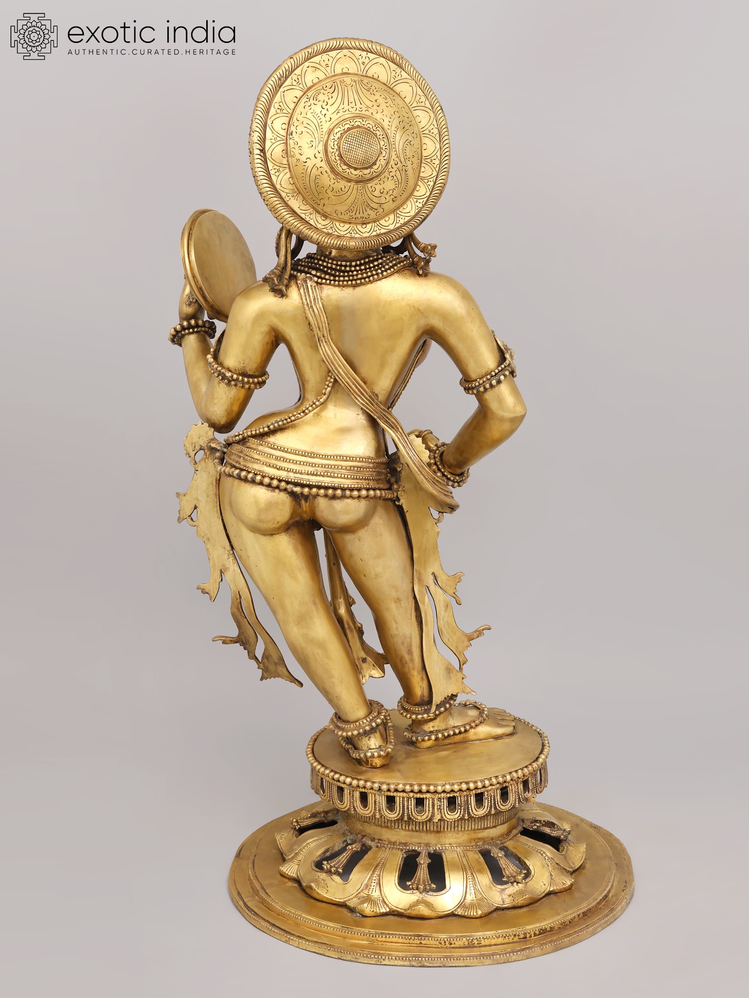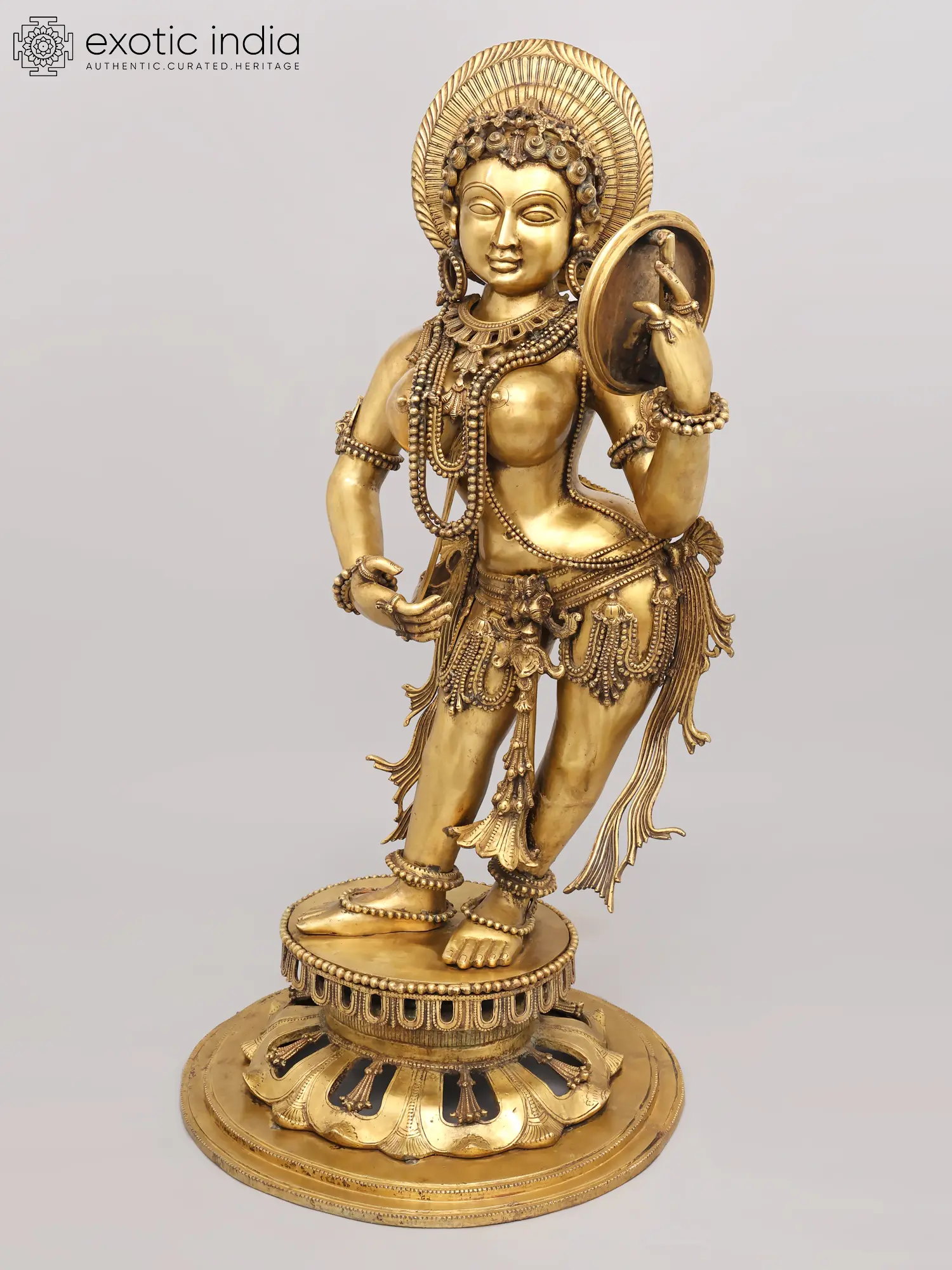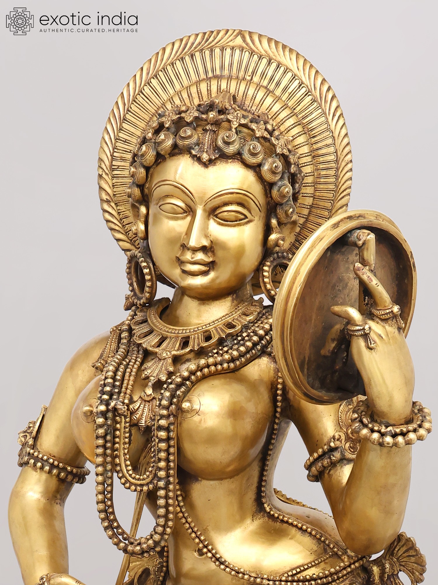 You will appreciate the extraordinary detail that adorns this celestial being, from the intricately woven necklaces and bangles to the delicate anklets gracing her feet. Her radiant countenance, framed by an elaborate headdress, exudes serenity and charm. The graceful posture, with one hand holding a mirror and the other gesturing delicately, conveys a narrative of self-adornment and timeless beauty, standing at an impressive height of 53 inches, making a profound statement wherever it is placed.