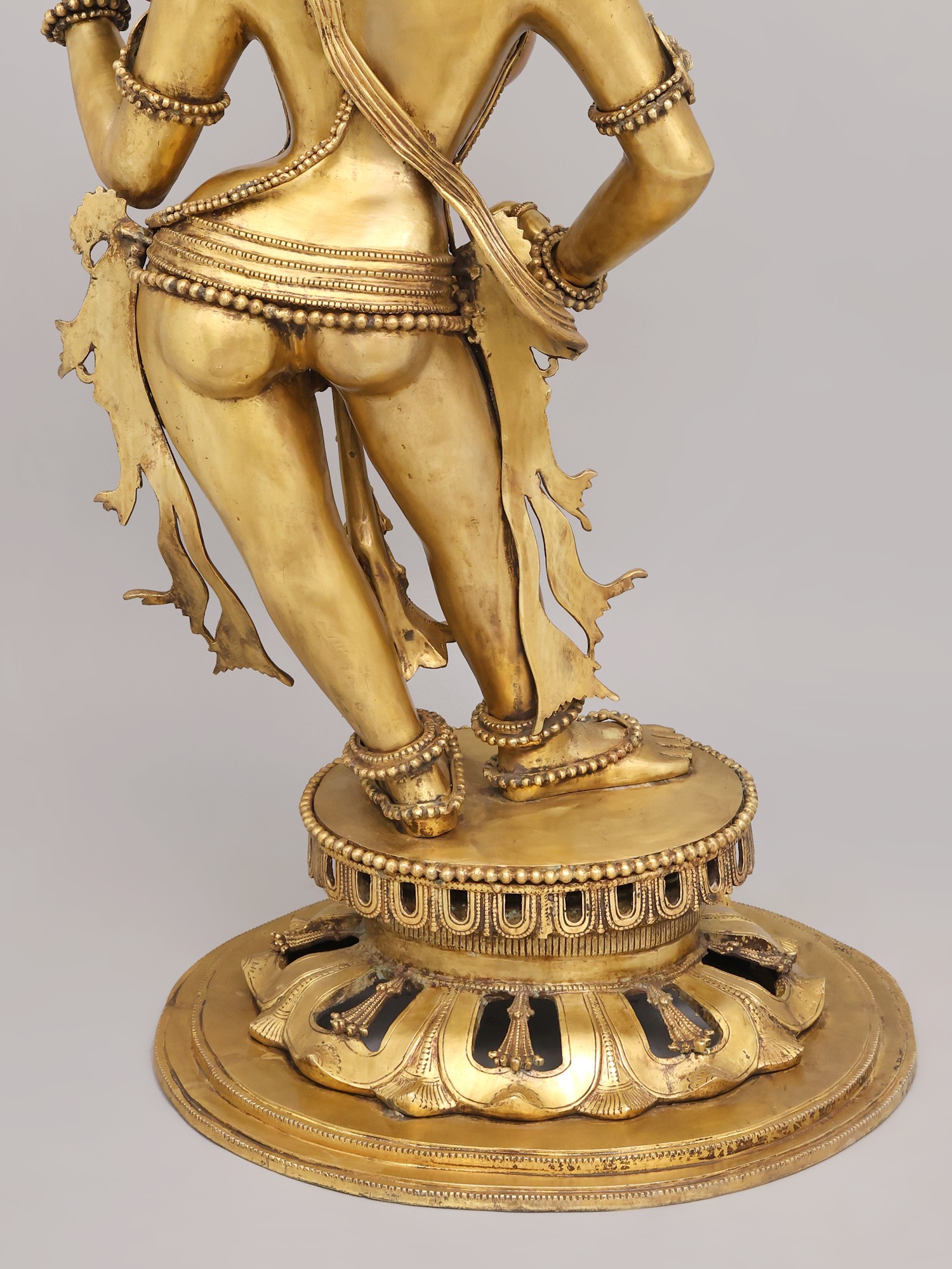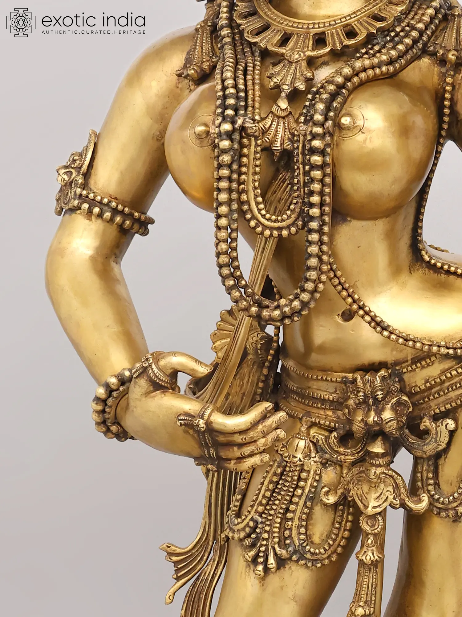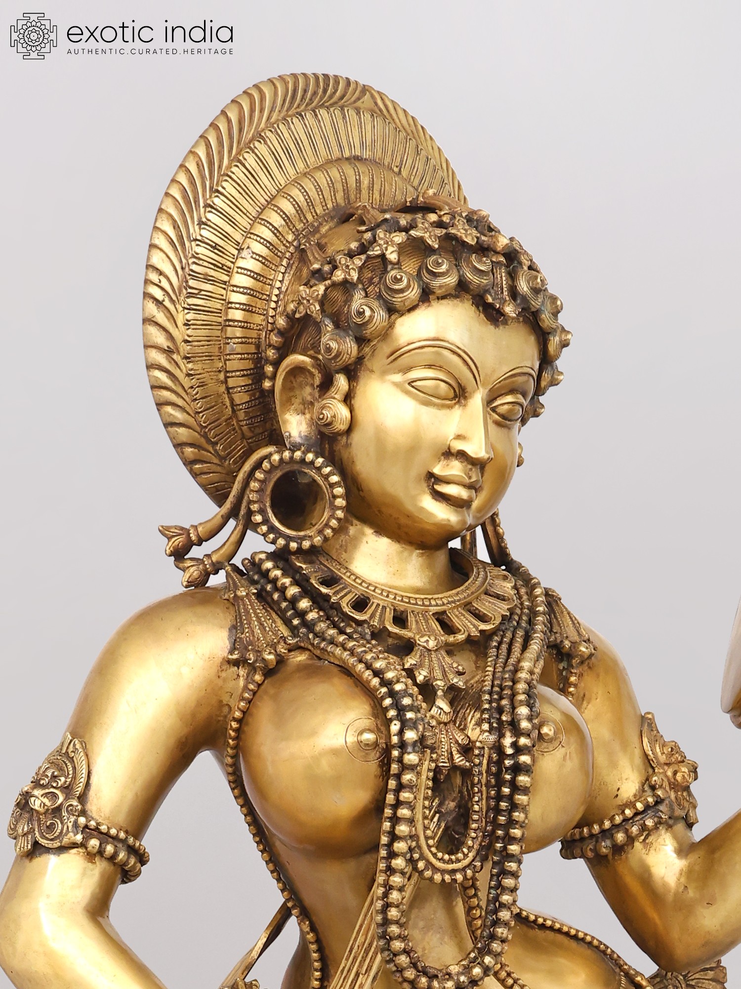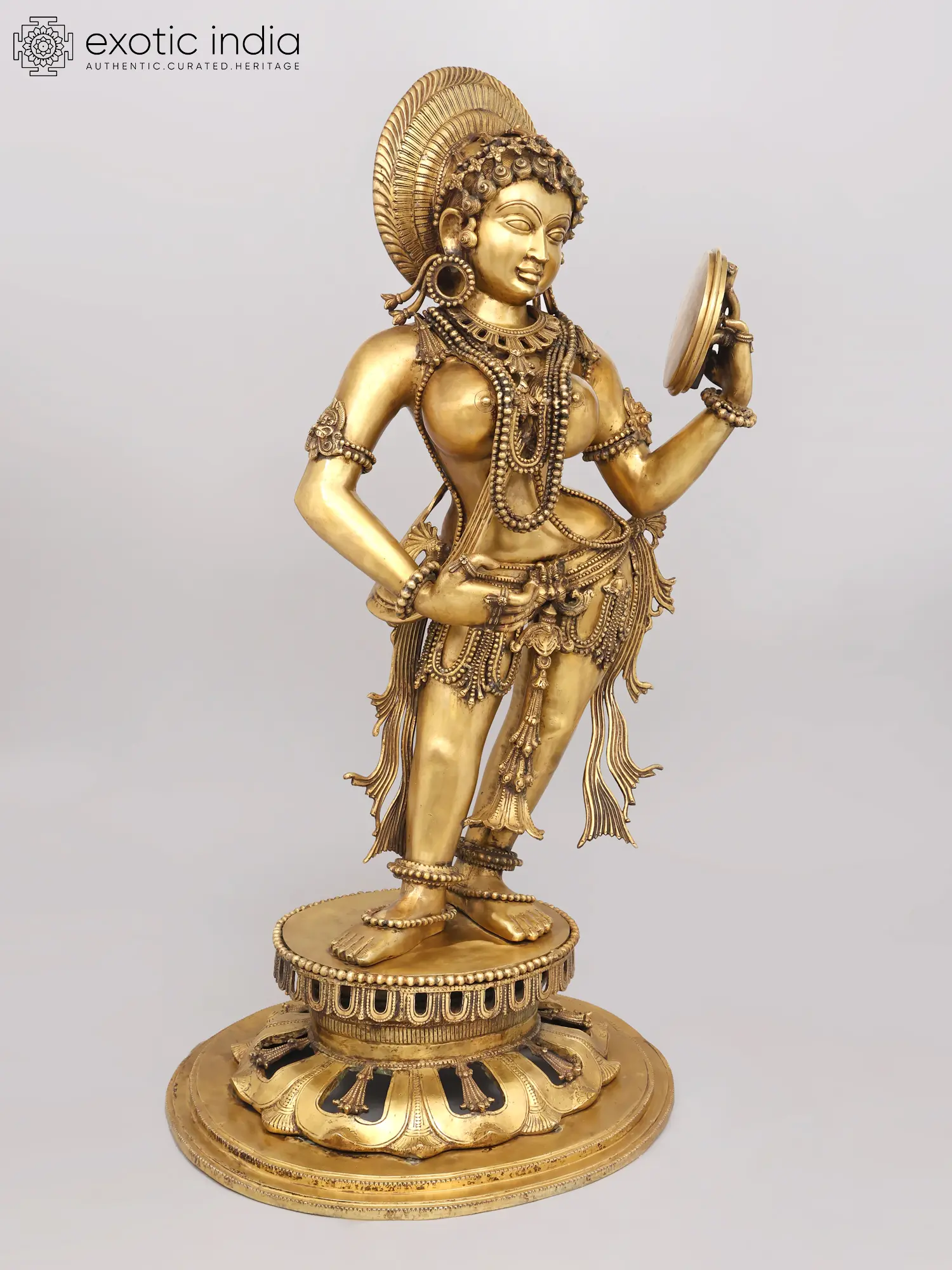 You will appreciate the extraordinary detail that adorns this celestial being, from the intricately woven necklaces and bangles to the delicate anklets gracing her feet. Her radiant countenance, framed by an elaborate headdress, exudes serenity and charm. The graceful posture, with one hand holding a mirror and the other gesturing delicately, conveys a narrative of self-adornment and timeless beauty, standing at an impressive height of 53 inches, making a profound statement wherever it is placed.