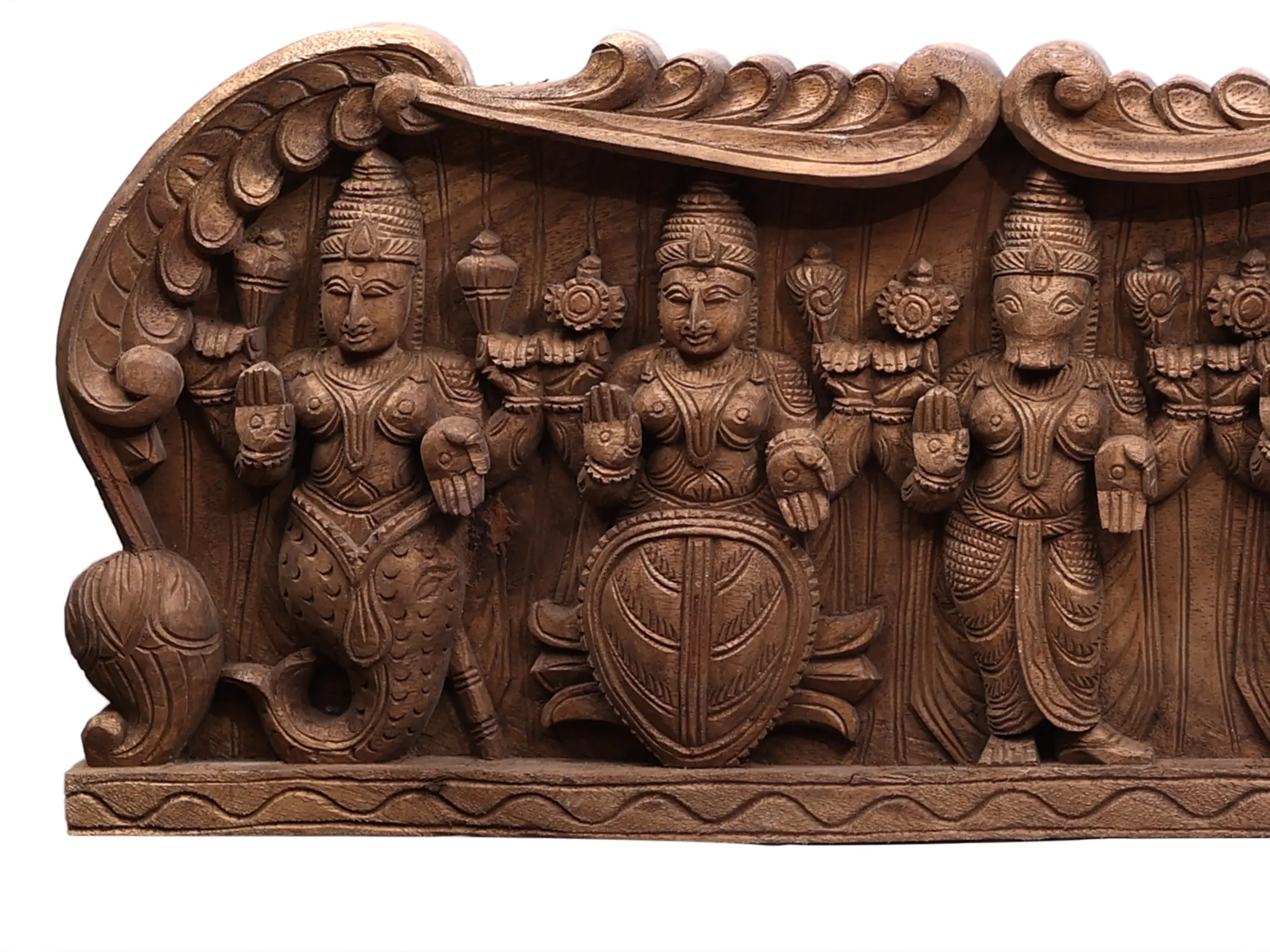This exquisite wooden wall panel captures the essence of Lord Vishnu's ten principal avatars, known as the Dashavatara. Each meticulously carved figure represents a cosmic descent, a divine intervention to restore dharma and cosmic order to the universe. This panel is not merely a decorative piece; it is a profound artistic testament to the cyclical nature of existence, the triumph of good over evil, and the ever-present grace of the preserver god. Each avatar embodies a unique lesson and story from Hindu mythology. From the aquatic Matsya saving the Vedas from the great deluge, to the boar-headed Varaha lifting the earth from the cosmic ocean, and the powerful Narasimha tearing apart the demon Hiranyakashipu. Observe the serene Kalki, poised to appear at the end of Kali Yuga, signifying the inevitable renewal and purification of the world. The panel also depicts the wisdom of the sage in Vamana, the might of the warrior Parashurama, the noble heroism of Rama, the charm of Krishna, and the enlightening presence of Buddha. These are not just stories; they are philosophies etched in wood, inviting contemplation on the divine purpose that shapes the cosmos.