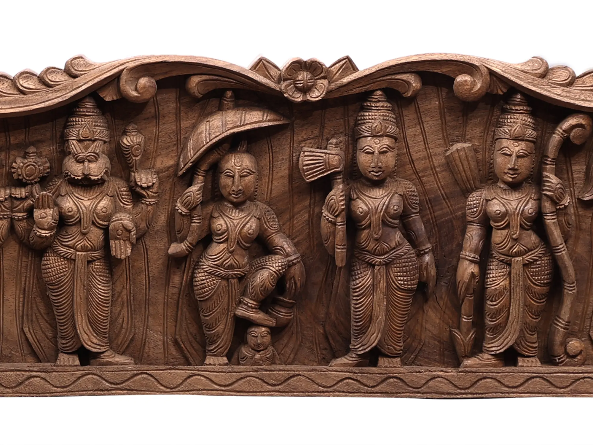 Crafted from fine quality wood, this large-scale panel is a masterpiece of traditional Indian woodworking. The artist's skilled hands have brought to life each divine form with intricate details, from the flowing garments and divine accoutrements to the serene expressions and dynamic poses. The rich, natural grain of the wood enhances the depth and character of the carvings, lending an authentic and timeless quality to the artwork. This piece serves as a tangible link to ancient artistic traditions, where divine narratives were sculpted into forms that inspired devotion and awe. It represents a dedication to preserving not only religious stories but also the artisanal skills passed down through generations.