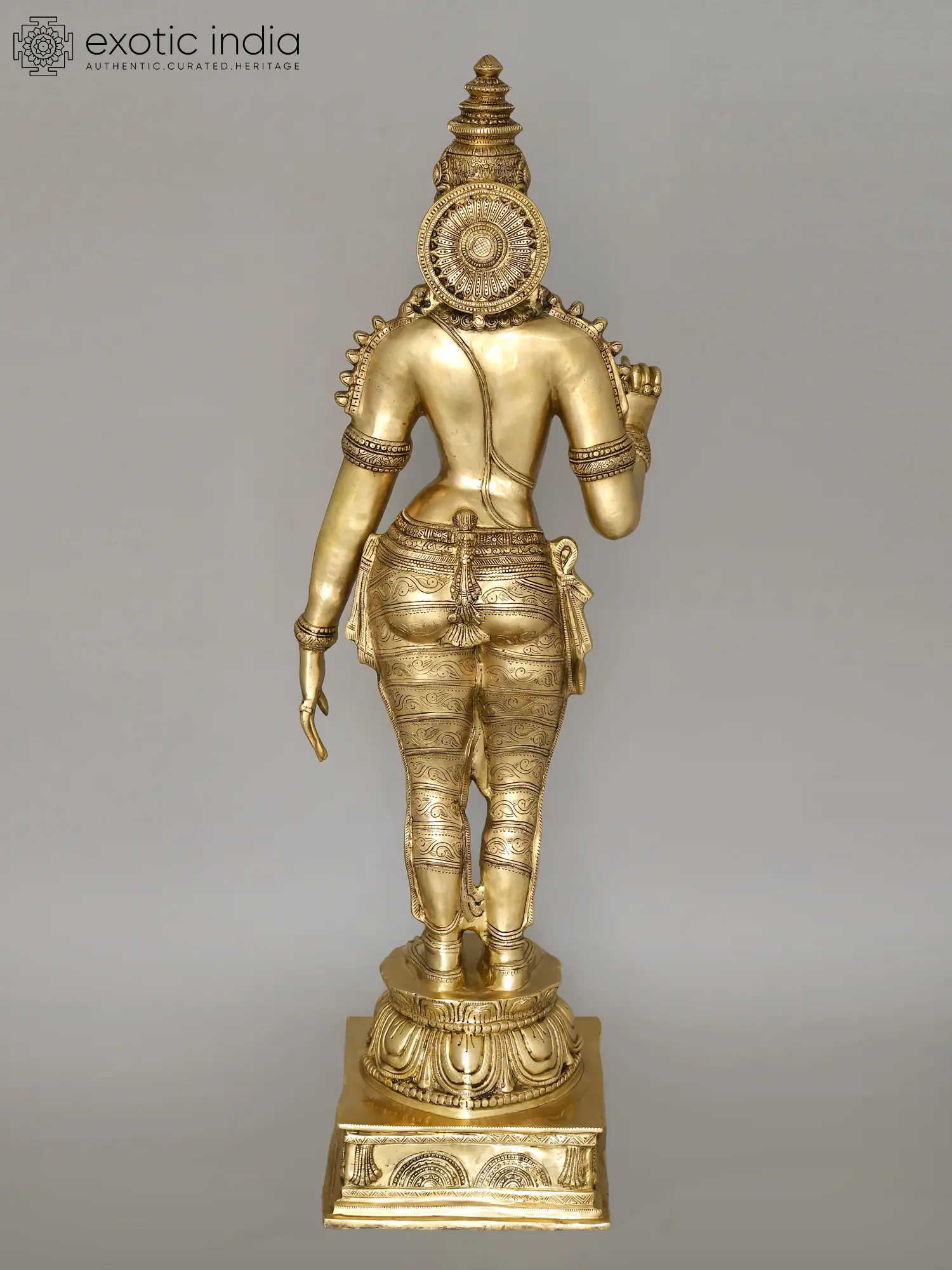 The workmanship overflows with not only skill but also great personal devotion. A hallmark of each work of art that goes into our collection, She is composed in the best proportions of the feminine form. The templetop crown that towers above Her head highlights Her stature, the lotus engraved on it a symbol of Her maternal compassion. Her lines sculpted on to Her countenance convey a composure of invincible calm and piety. Streams of gold and jewels grace Her shoulders, arms, and torso, and a richly embroidered silk dhoti is draped onto Her from the navel downwards. Her right arm seemingly holds a lotus. This murti will single-handedly add a world of stability to your space.