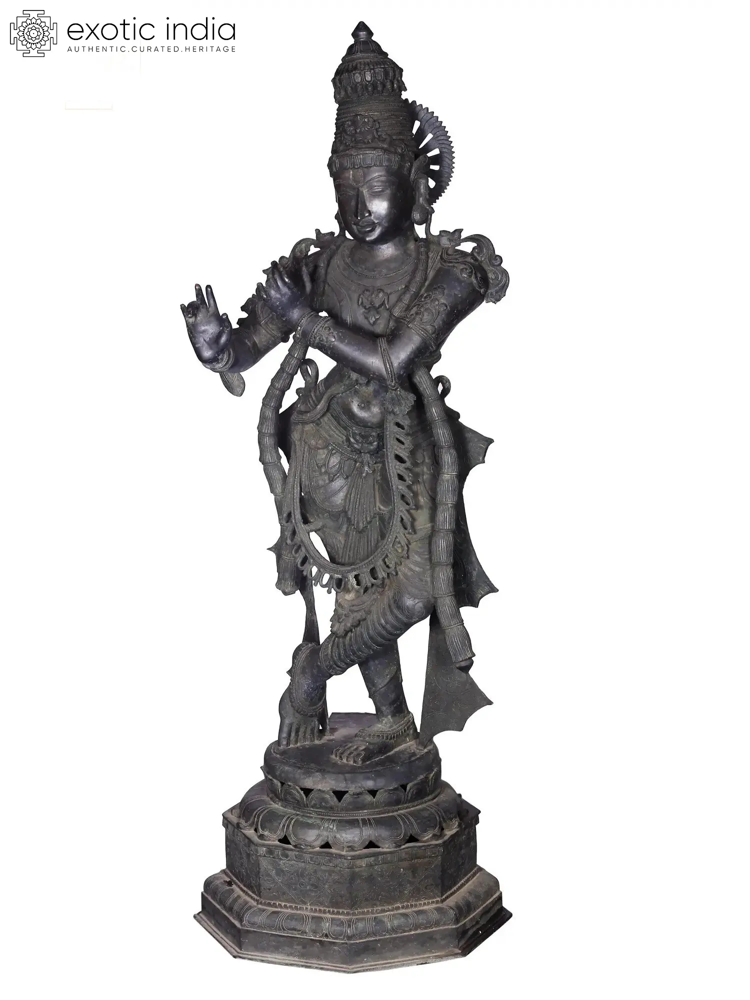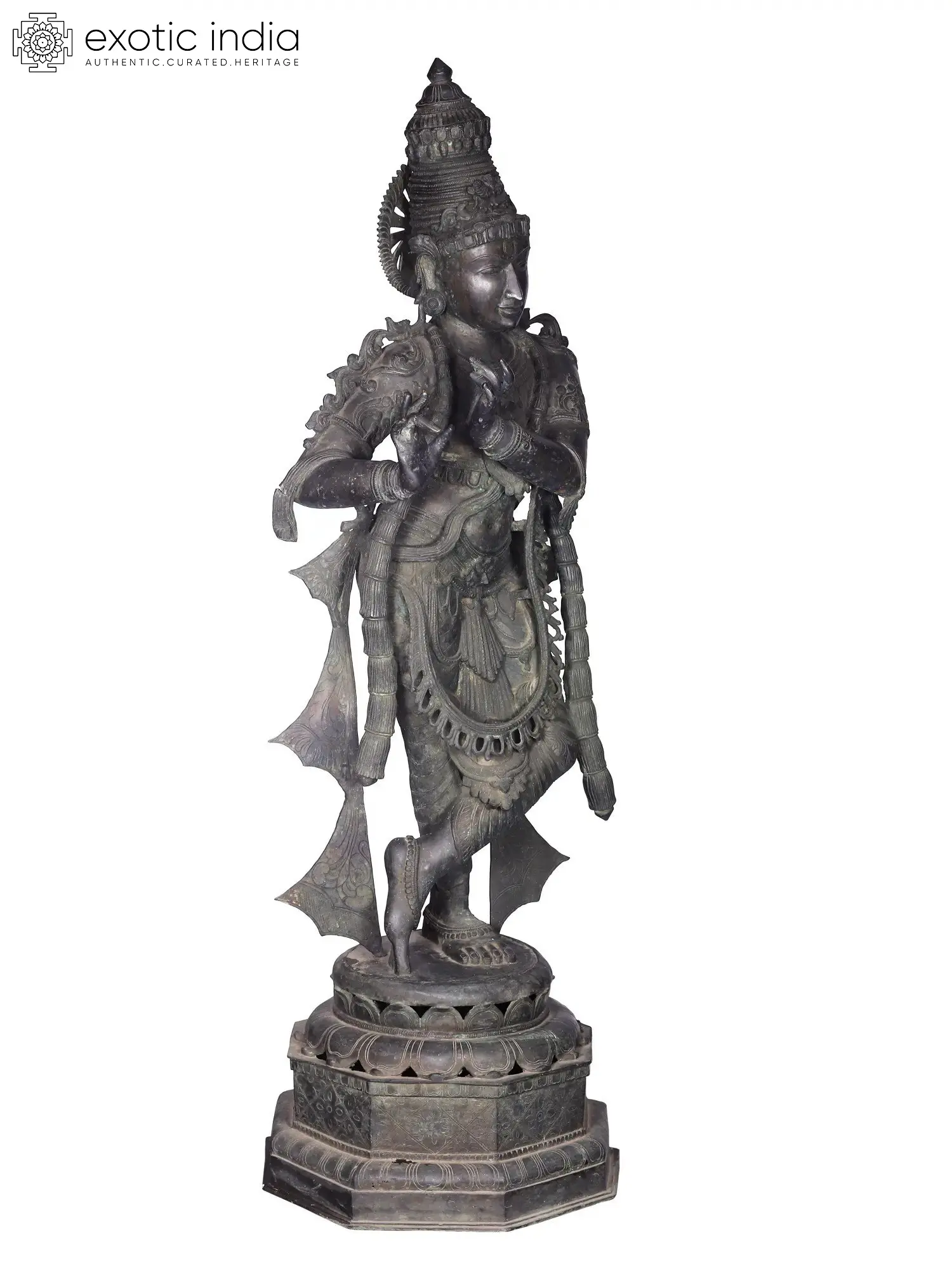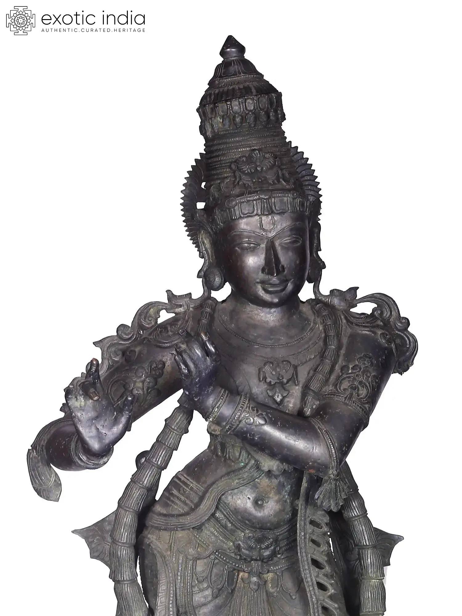 The cowherd from Braj, and loved by all, Lord Krishna is also called Manmohana -‘one who captivates the heart’. Postured in a Tribhangi, he crosses a leg against the other to play the murali, filling the forests of Vrindavan with tunes of divinity! His wavy tresses dangle down the shoulders, and a fragrant lotus garland adorns his neck, coming down to his knees. Placed on a blossoming Padma, his jewelry, although excellent, is secondary to the Sukham of his face.