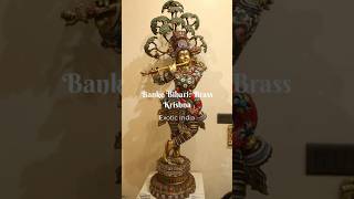 This magnificent brass statue captures the essence of Lord Krishna in his most enchanting form, the Tribhanga Murari, his divine posture a testament to his playful spirit and profound grace. Standing at an impressive height, the deity is depicted in a captivating *tribhanga* (triple-bent) pose, his body curved in three places – the neck, waist, and knee – creating a fluid, dance-like movement. This iconic stance is synonymous with Krishna's charm and his ability to captivate all with his presence. The Lord's hands are positioned to play his celestial flute, the bansuri, its ethereal melody said to have the power to mesmerize all living beings, from humans and animals to even the inanimate. ––––––––––