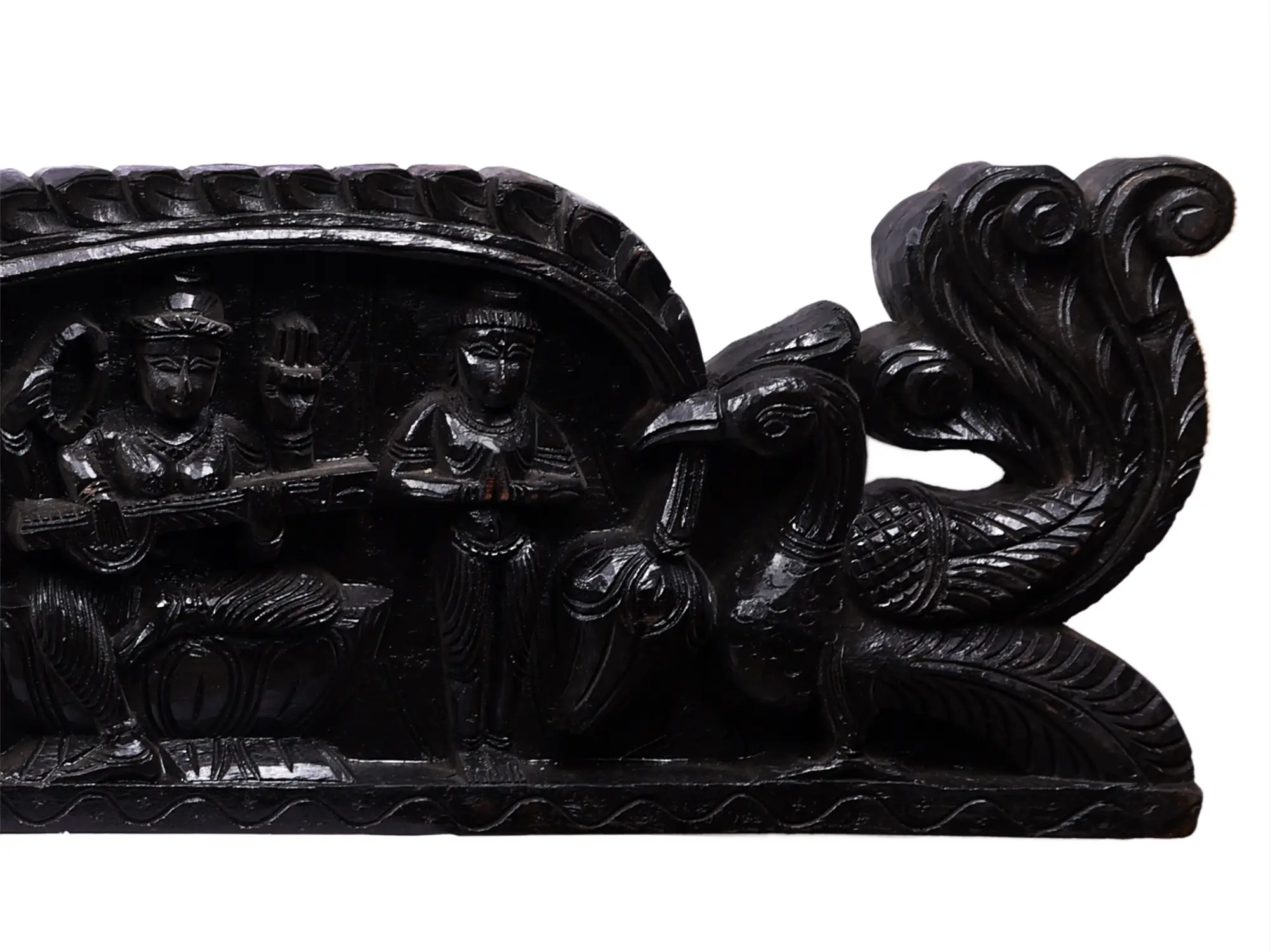 The trinity of Lakshmi-Ganesha-Saraswati represents the auspiciousness required to emerge victorious in every field of life. As Lakshmi brings wealth, Ganesha removes obstacles in the path to action and Saraswati bestows the wisdom to face the challenges of life, to attain- Dharma, Artha, Kama, and Moksha. In this ornately decorated wooden wall panel, the three deities are represented in their popular iconography, with devotees flanking them with hands folded in a gesture of reverence and devotion.