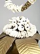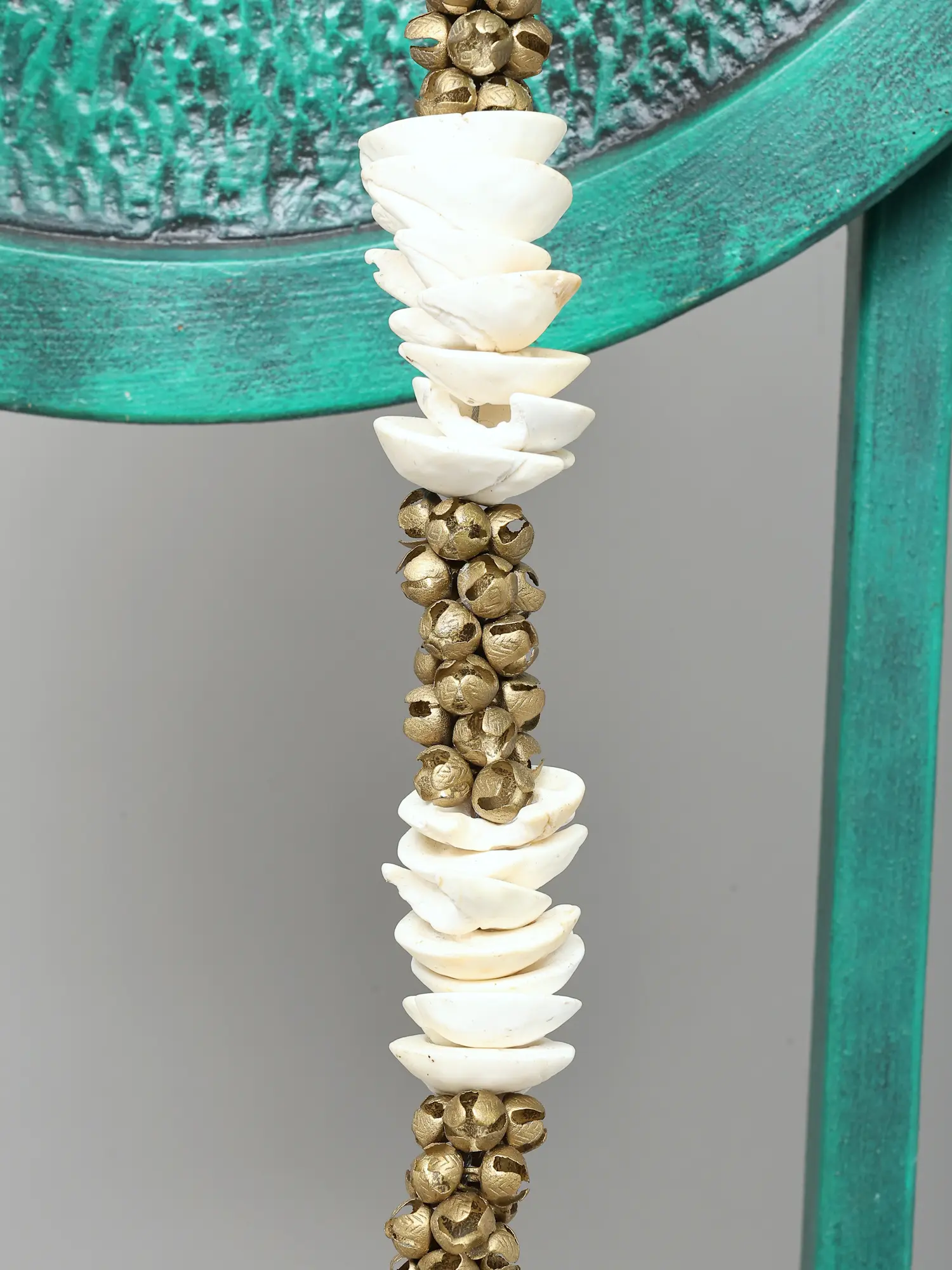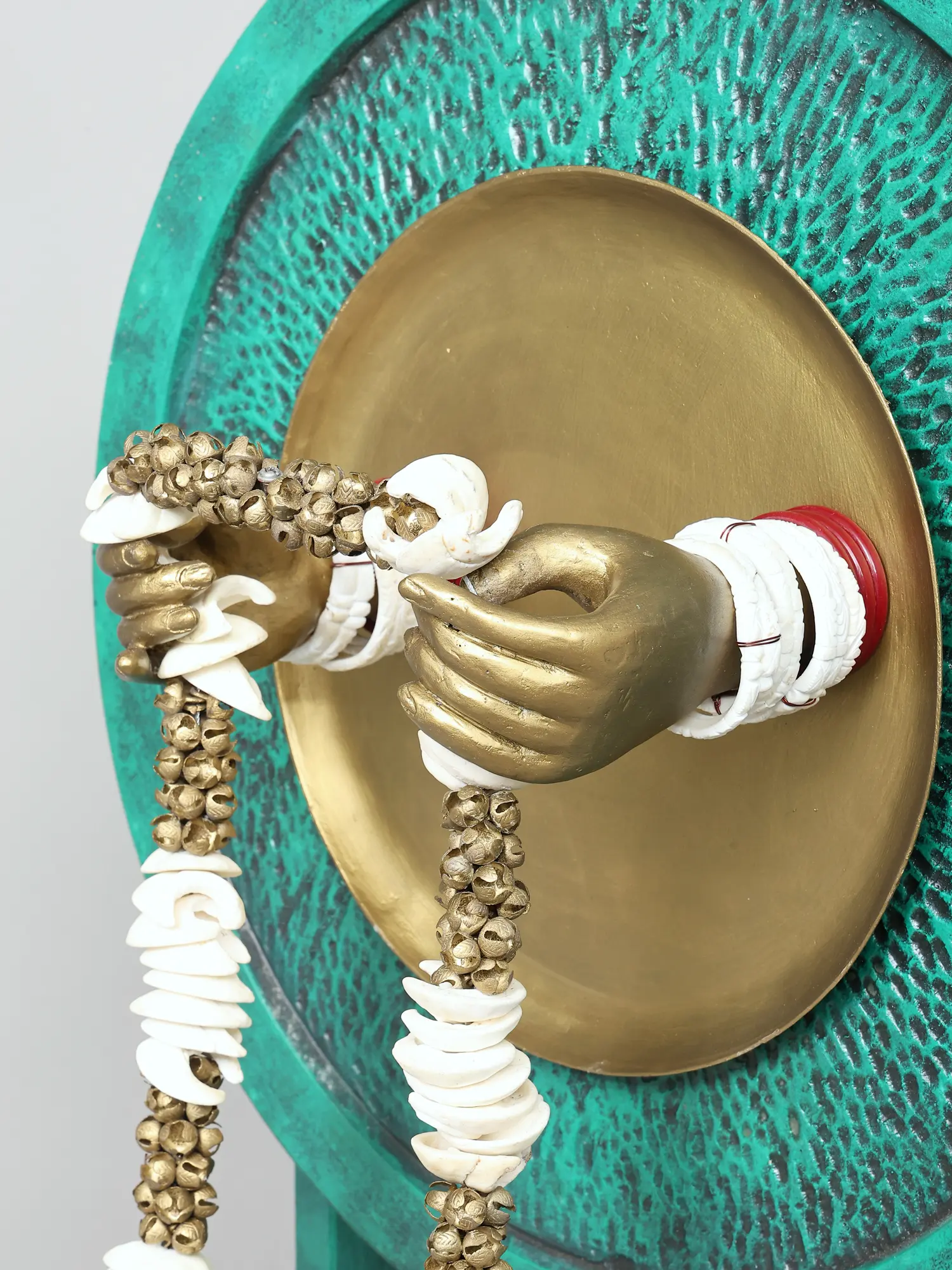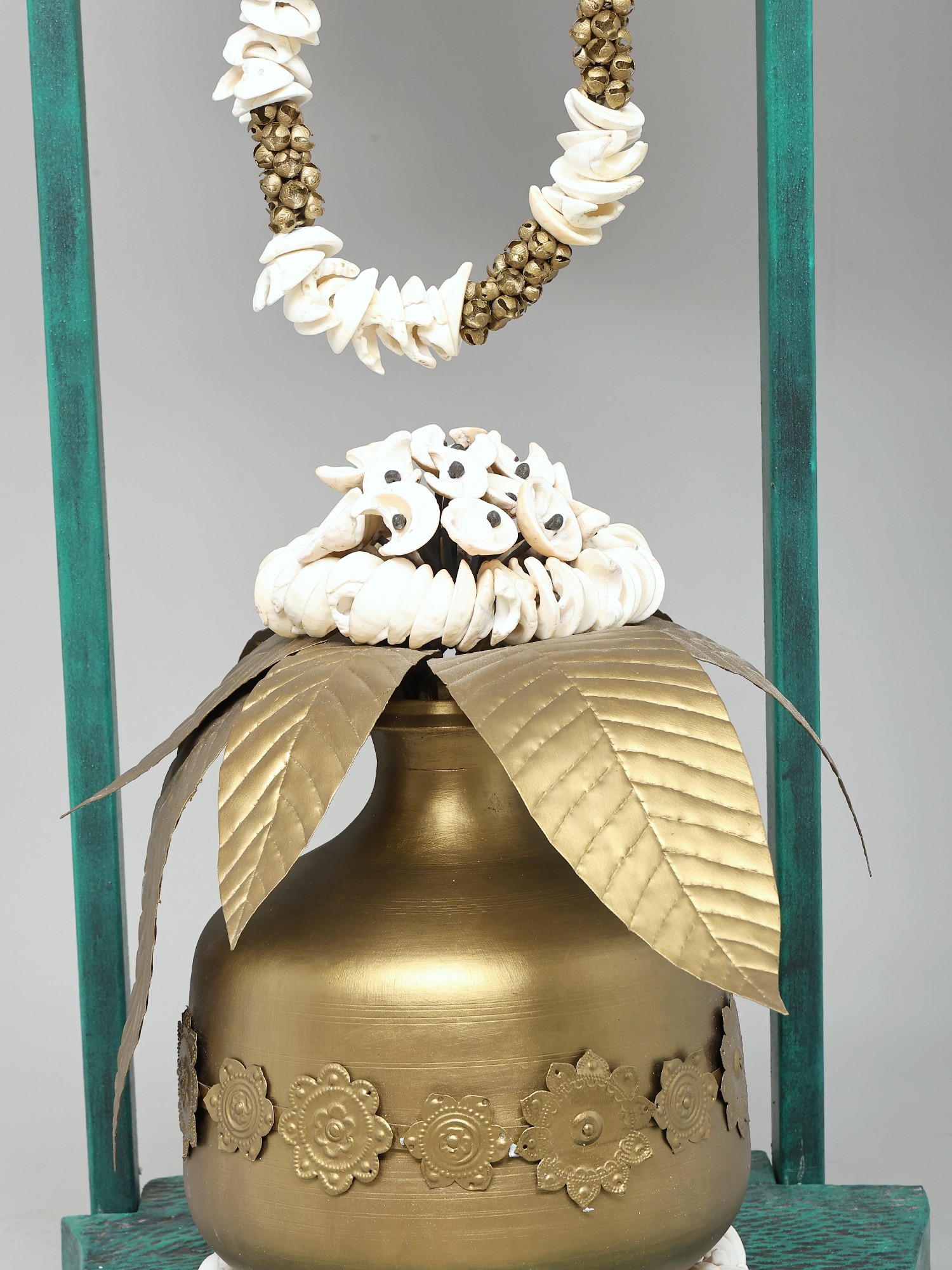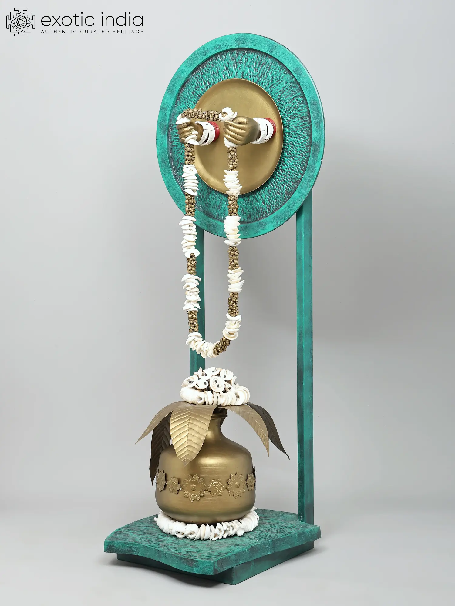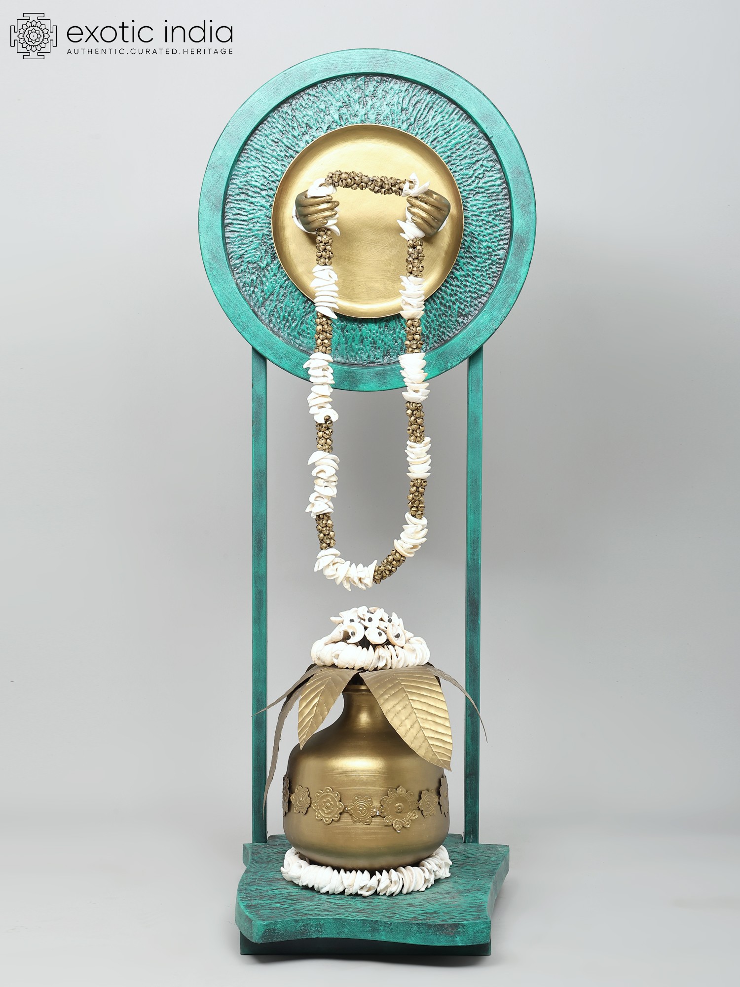 The artistry in this piece is evident in every detail. Crafted from high-quality brass, it possesses a lustrous sheen that speaks of enduring value and meticulous attention. The primary vessel, a robust Kalash, is richly embellished with intricate floral motifs, a testament to the skill of the artisan. Emerging from the top of the Kalash are two elegantly rendered brass leaves, subtly suggesting the unfolding of nature and new growth. Above this, a circular backdrop, finished in a striking verdigris patina, provides a dramatic stage for the central act of reception. Two gracefully formed hands, also in brass, emerge from this circular frame, holding a magnificent garland. This garland, a vibrant cascade of white shells interspersed with small brass beads, evokes the traditional offerings made to deities and honored guests, symbolizing purity and divine benediction.