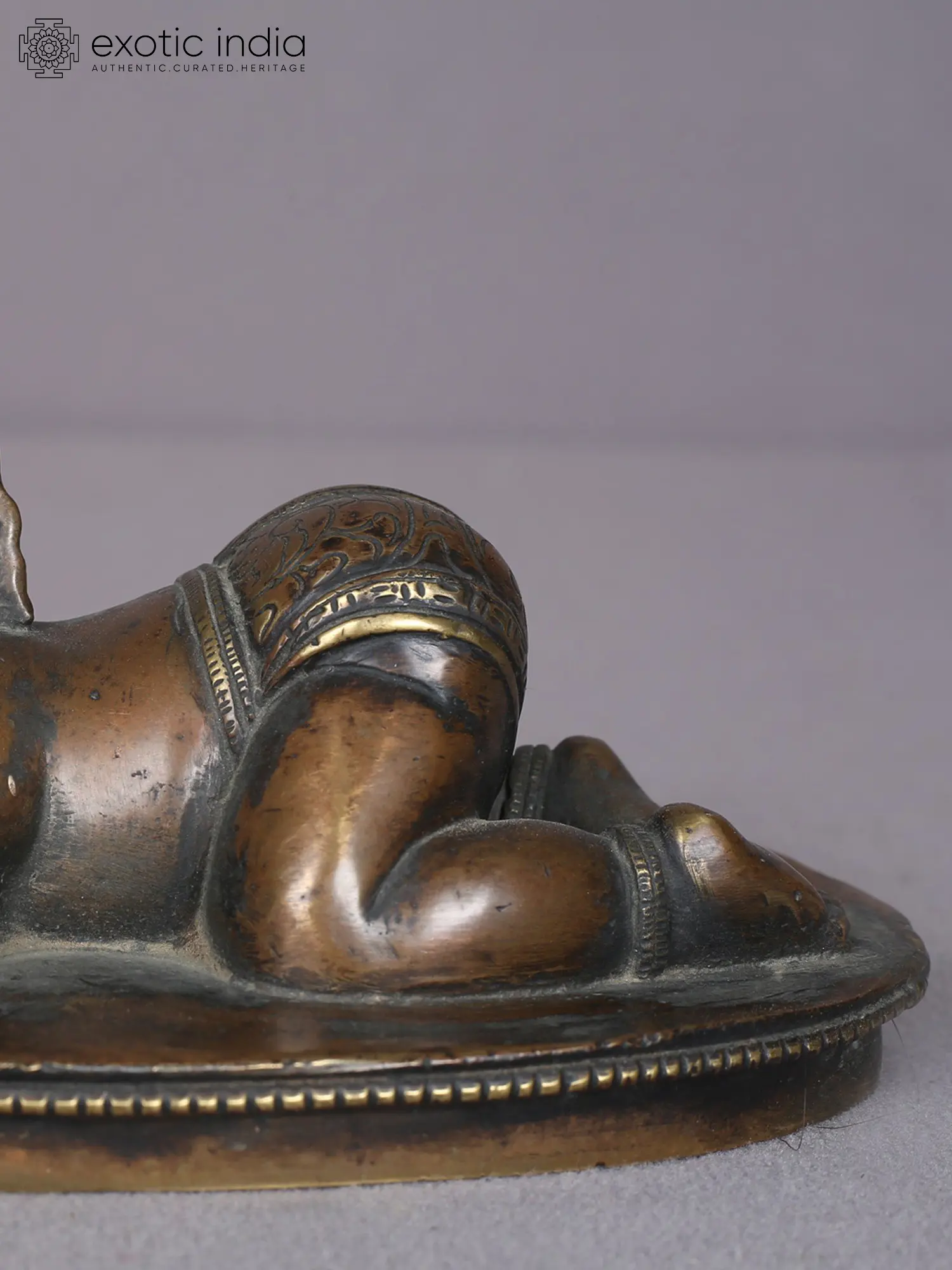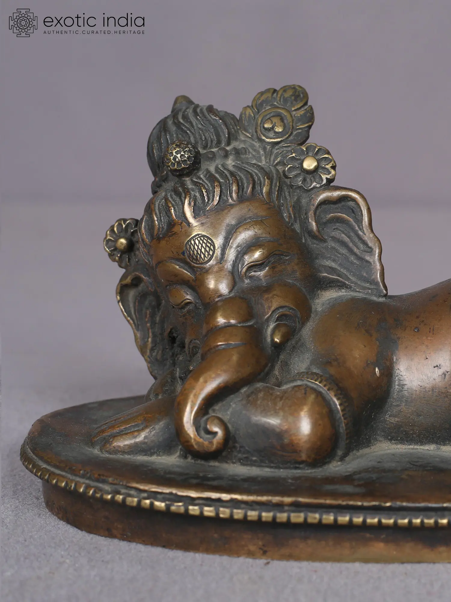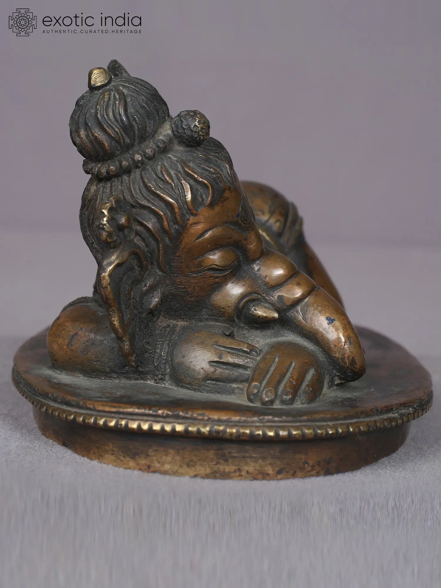 Baal-Ganesha or baby Ganesha lies on an ovular base, with his buttocks charmingly raised and his lovely face resting on his hands, suggesting a peaceful nap of a toddler. A beautiful symbol of cultural exchange between India and Nepal and between Ganesha and Krishna, this Nepalese statue is a one-of-a-kind artwork.