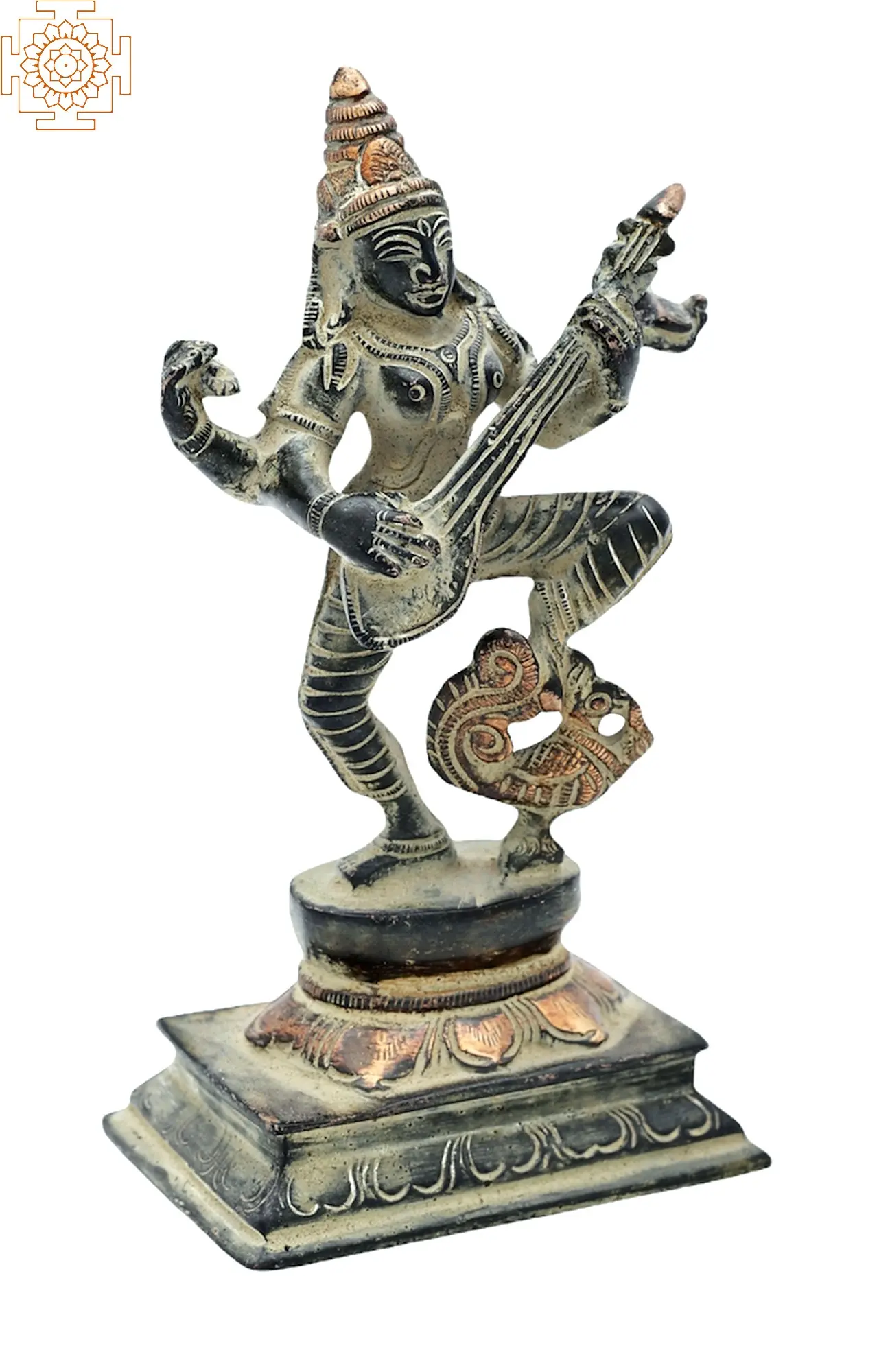 The source of Paramapita Brahma’s heavenly inspiration, which led to the formulation of Srishti, goddess Saraswati in this brass statue strikes a dynamic posture, symbolizing her movement in the mind of every artist, as the supreme creative force. Devi Saraswati has a youthful form, which is delicately adorned. She holds her Veena, Veda, and rosary in her hands and has her foot placed atop the Paramahansa- heavenly swan which is a symbol of pure wisdom in Hindu culture.